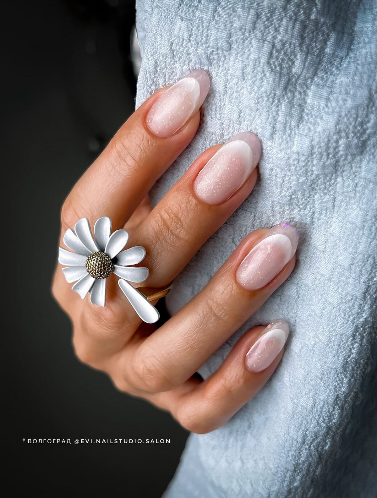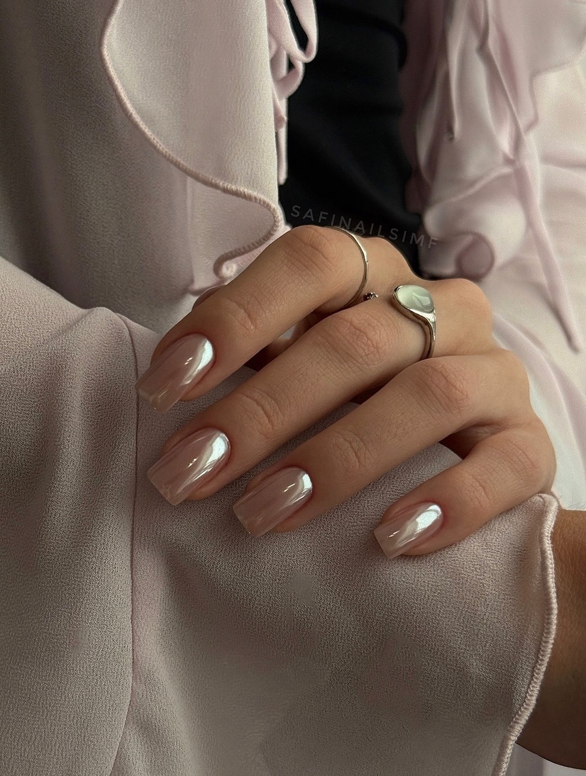 Комбінація перлинної втирки з матовим топом на частині нігтя створює цікаву гру текстур. Особливо елегантно виглядає втирка на коротких нігтях квадратної або м’яко-квадратної форми, де перламутр не перевантажує образ. Багатошарова техніка, коли втирка наноситься на різні відтінки бази, створює складні переливи, що змінюються в залежності від освітлення і кута зору.