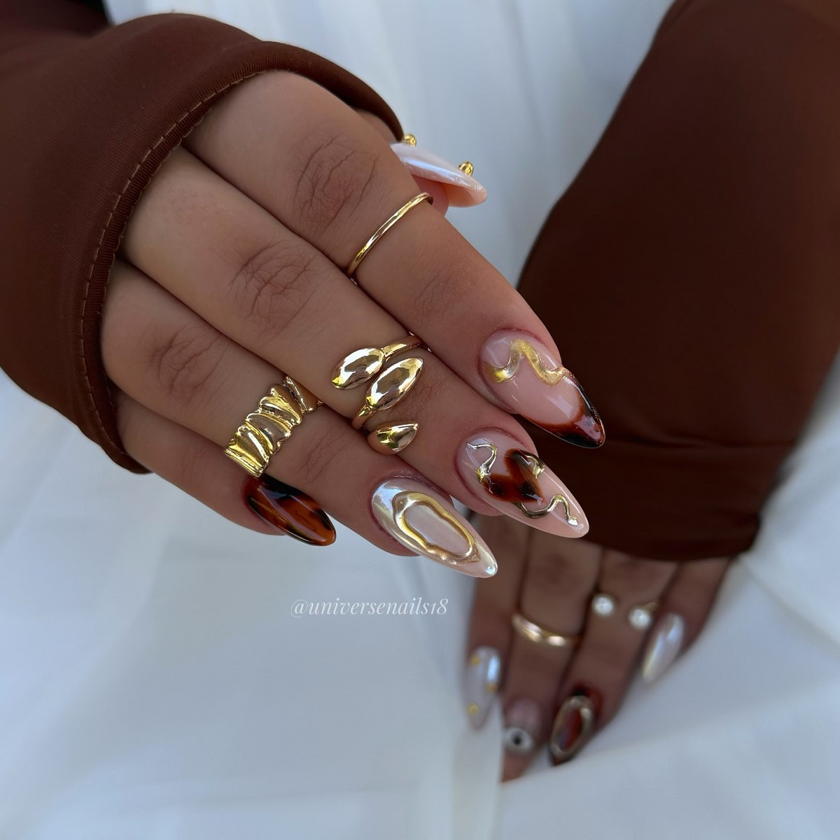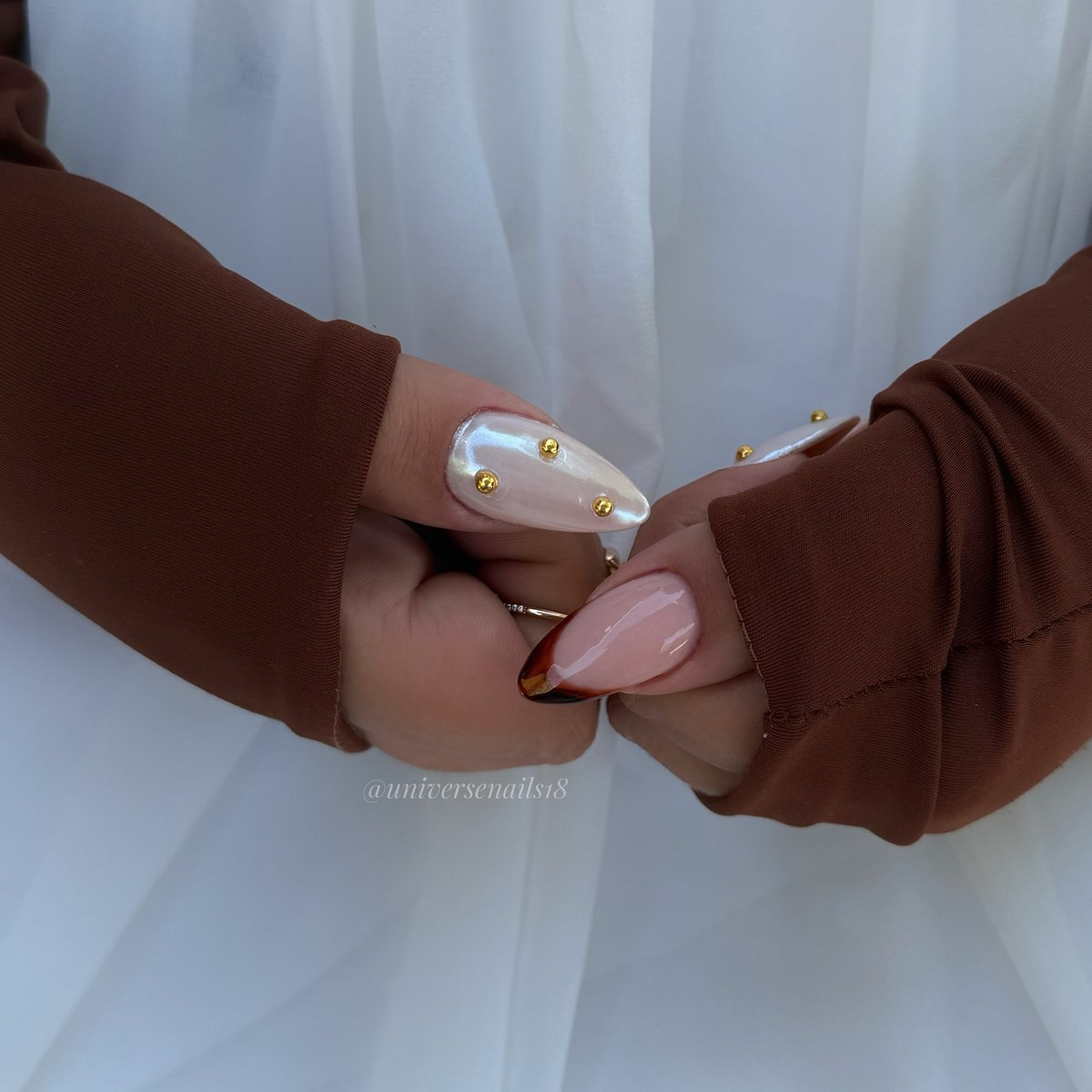 Асиметричний підхід, коли дизайн на лівій руці відрізняється від правої, але доповнює загальну концепцію, стає трендом сезону. Популярне поєднання протилежностей: матових і глянцевих текстур, темних і світлих відтінків, складного і простого декору. Такий манікюр дозволяє проявити креативність і створити дійсно індивідуальний образ, що відображає багатогранність особистості.
