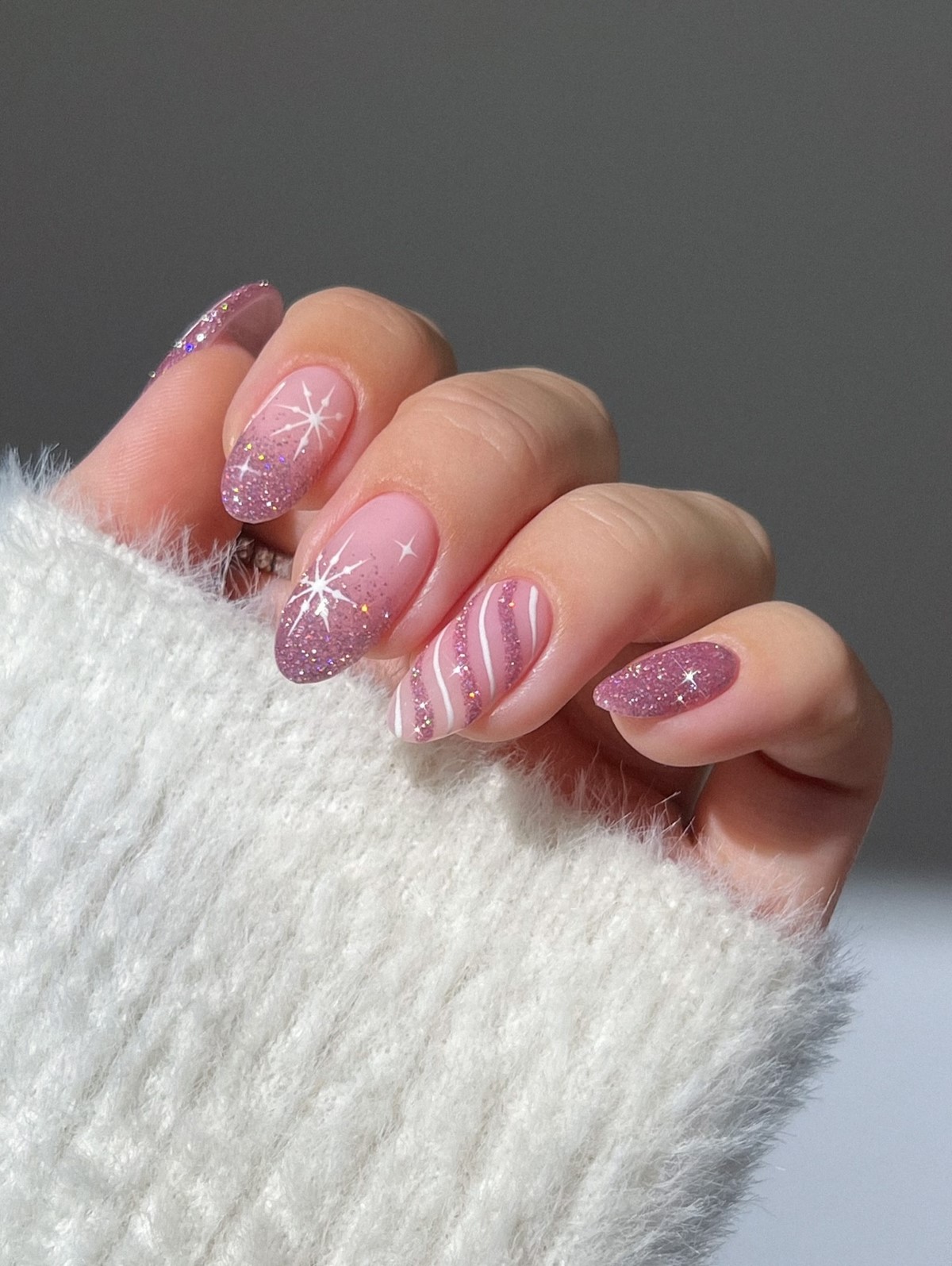 Завершує топ-12 найсвятковіший варіант – манікюр з великою кількістю блискіток і витонченими сніжинками. Глітер в грудні 2025 року використовується як повне покриття нігтя для створення ефекту дорогоцінного металу, так і акцентно – на кінчиках, у вигляді градієнта або геометричних зон. Особливо актуальні голографічні блискітки, що створюють райдужні переливи, і великі гексагональні блискітки, що нагадують справжні сніжинки.