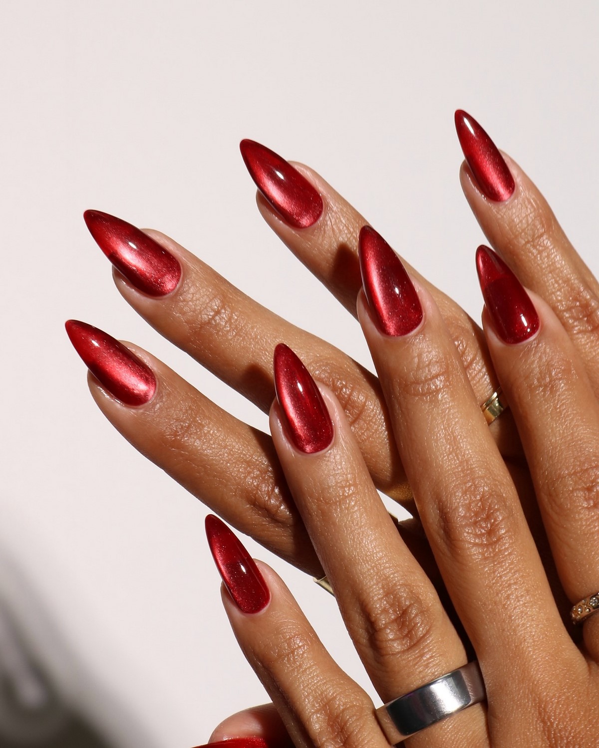 Магнітний ефект «котячого ока» залишається фаворитом грудня завдяки своїй глибині і містичному сяйву. У 2025 році особливо популярні багатошарові техніки, коли магнітний гель наноситься в кілька шарів з різними напрямками магніту, створюючи складні переливаються малюнки. Зимова палітра включає глибокі сині, фіолетові, бордові і графітові відтінки, що нагадують нічне небо або дорогоцінні камені.