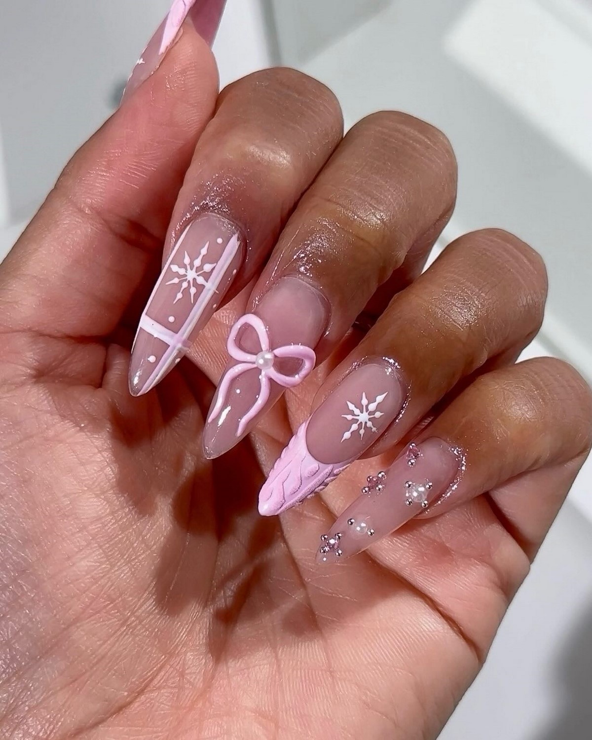 Сніжинки малюються тонкими пензликами білим гель-лаком, створюються за допомогою стемпінгу або наклеюються готовими наклейками. Популярні об’ємні сніжинки з густого гель-лаку з додаванням страз в центрі. Поєднання блискіток на всіх нігтях і детальних сніжинок на акцентних пальцях створює максимально святковий образ, ідеально підходить для новорічних вечірок і урочистих заходів.