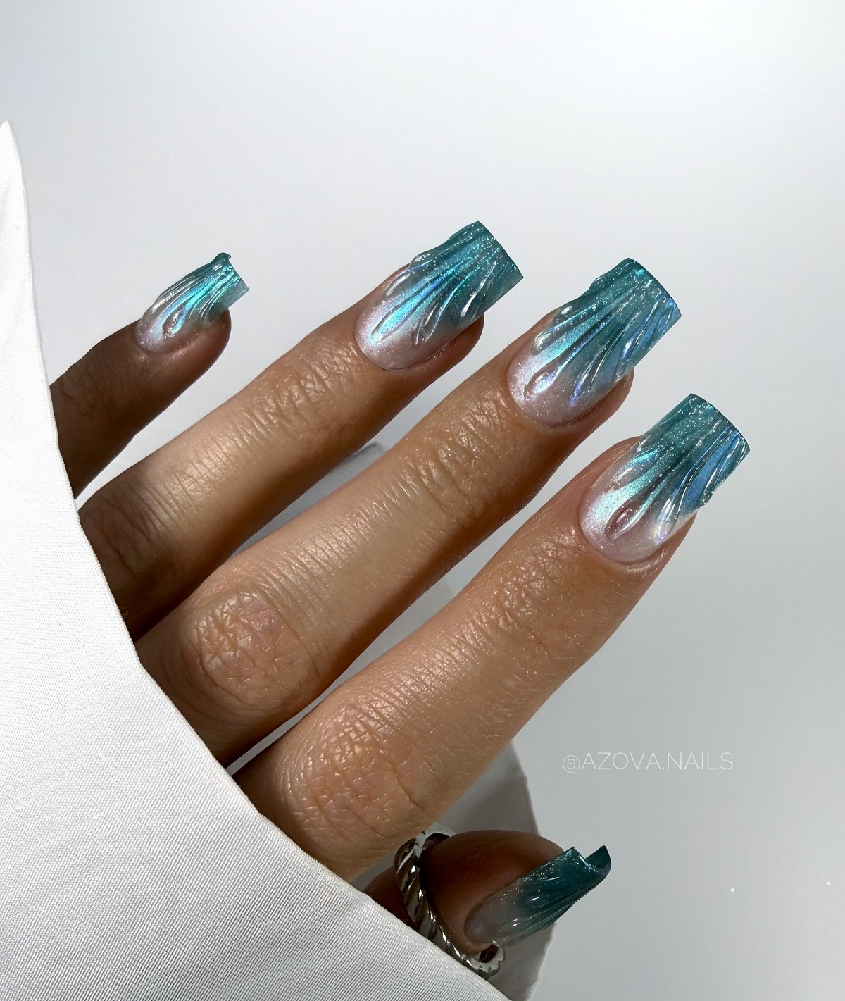 Градієнтний манікюр у грудні 2025 року трансформується в справжнє світлове шоу завдяки використанню шиммерних і голографічних пігментів. Техніка омбре переходить від насичених зимових відтінків до прозорих кінчиків або, навпаки, створює ефект сяйва від основи нігтя. Особливо актуальні градієнти в холодній гамі: від глибокого синього до крижаного блакитного, від сливового до рожевого кварцу.