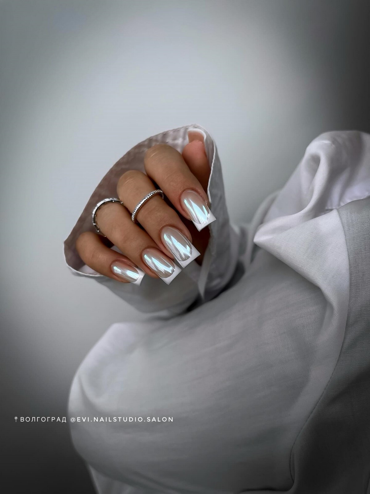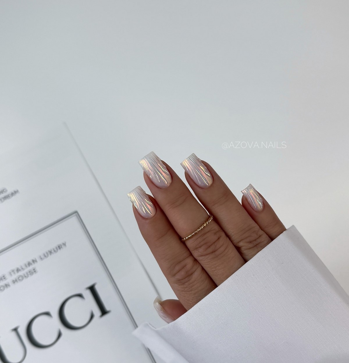 Комбінація перлинної втирки з матовим топом на частині нігтя створює цікаву гру текстур. Особливо елегантно виглядає втирка на коротких нігтях квадратної або м’яко-квадратної форми, де перламутр не перевантажує образ. Багатошарова техніка, коли втирка наноситься на різні відтінки бази, створює складні переливи, що змінюються в залежності від освітлення і кута зору.