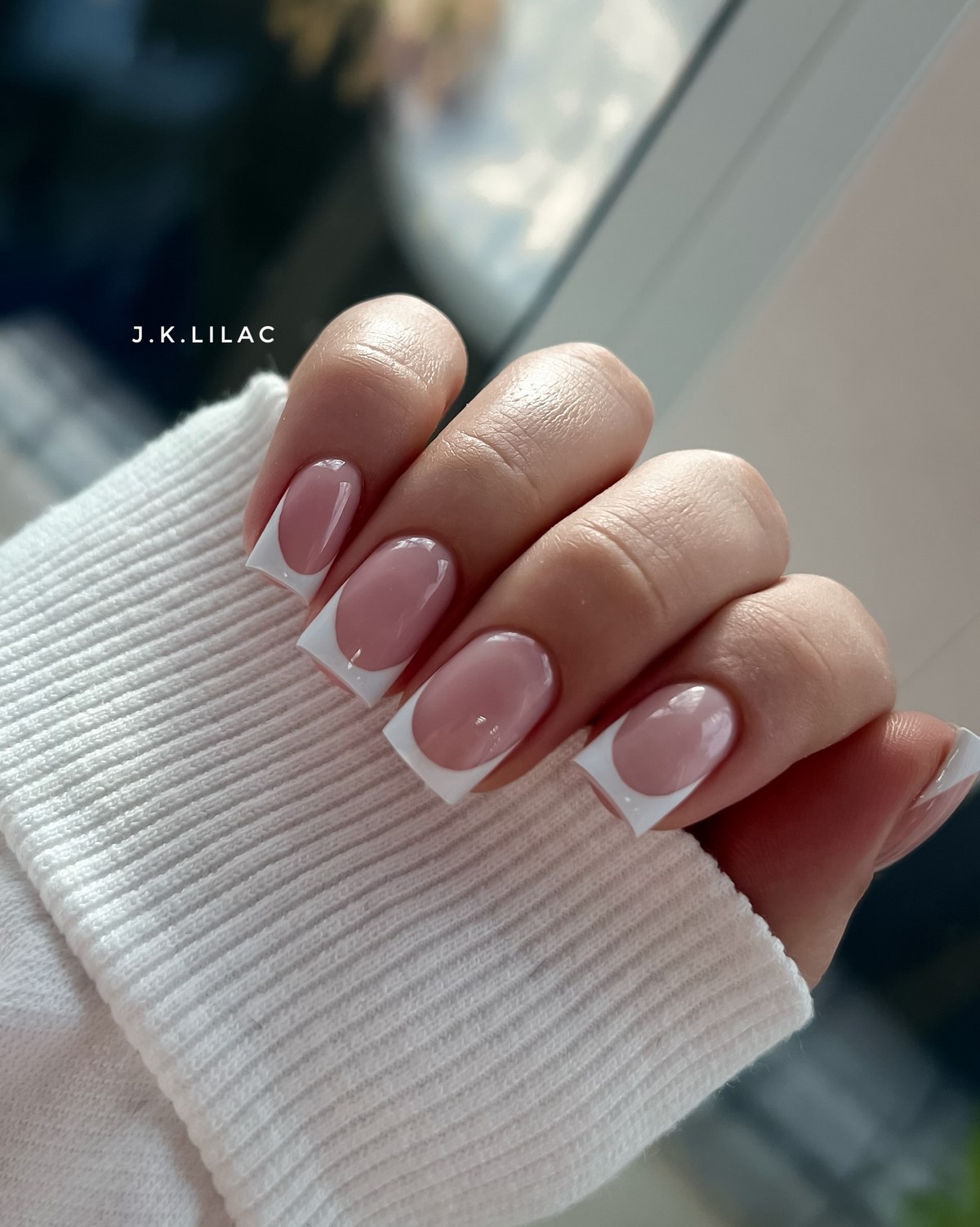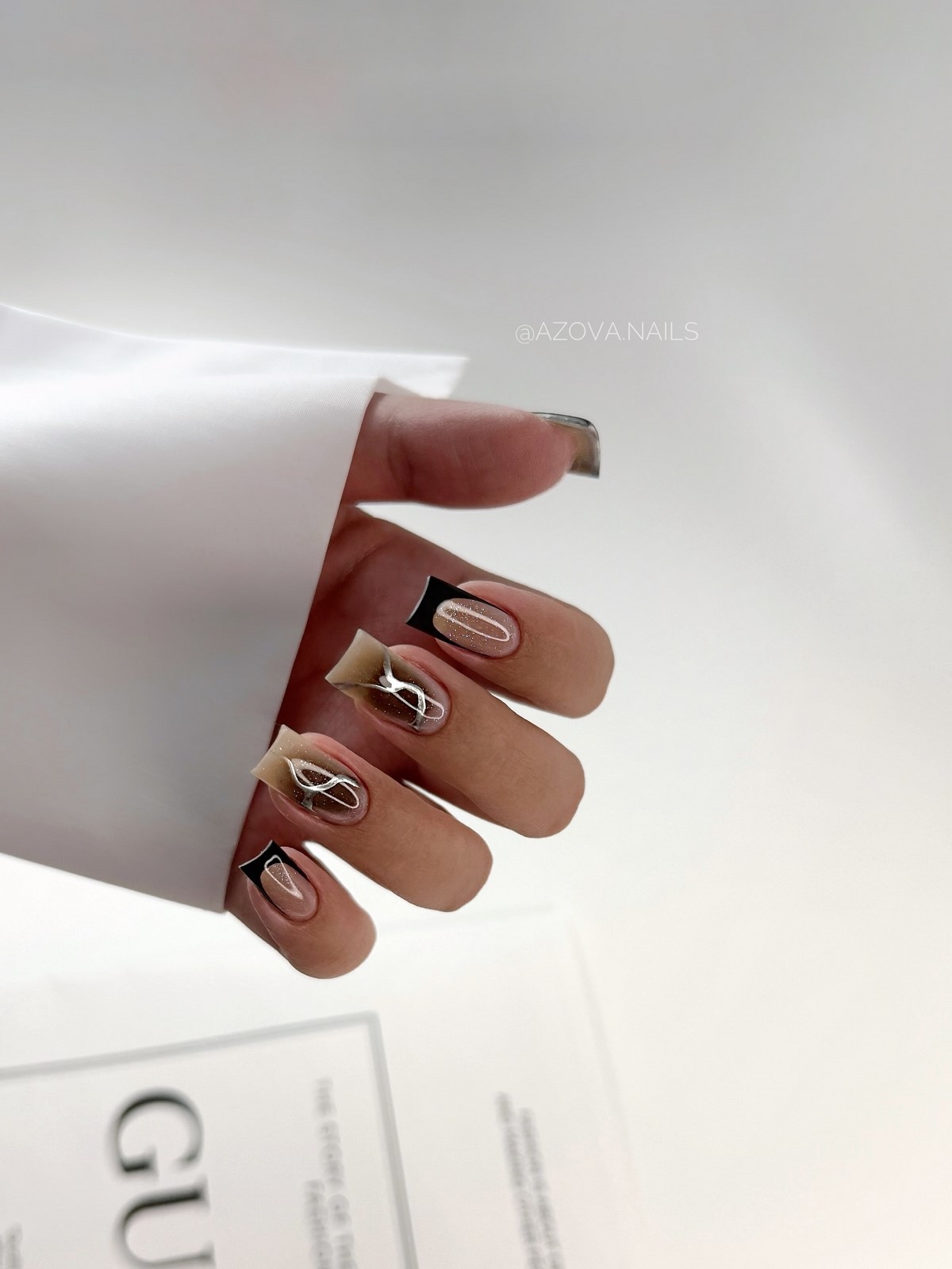 Зимова версія френча часто доповнюється тонкими блискучими лініями, що створюють ефект інею на межі кольорів. Геометричний френч з гострими кутами або хвилястими лініями додає сучасності класичному дизайну. Матовий топ на основному нігті в поєднанні з глянцевим френчем створює елегантний контраст, ідеально підходить для ділових і вечірніх образів.