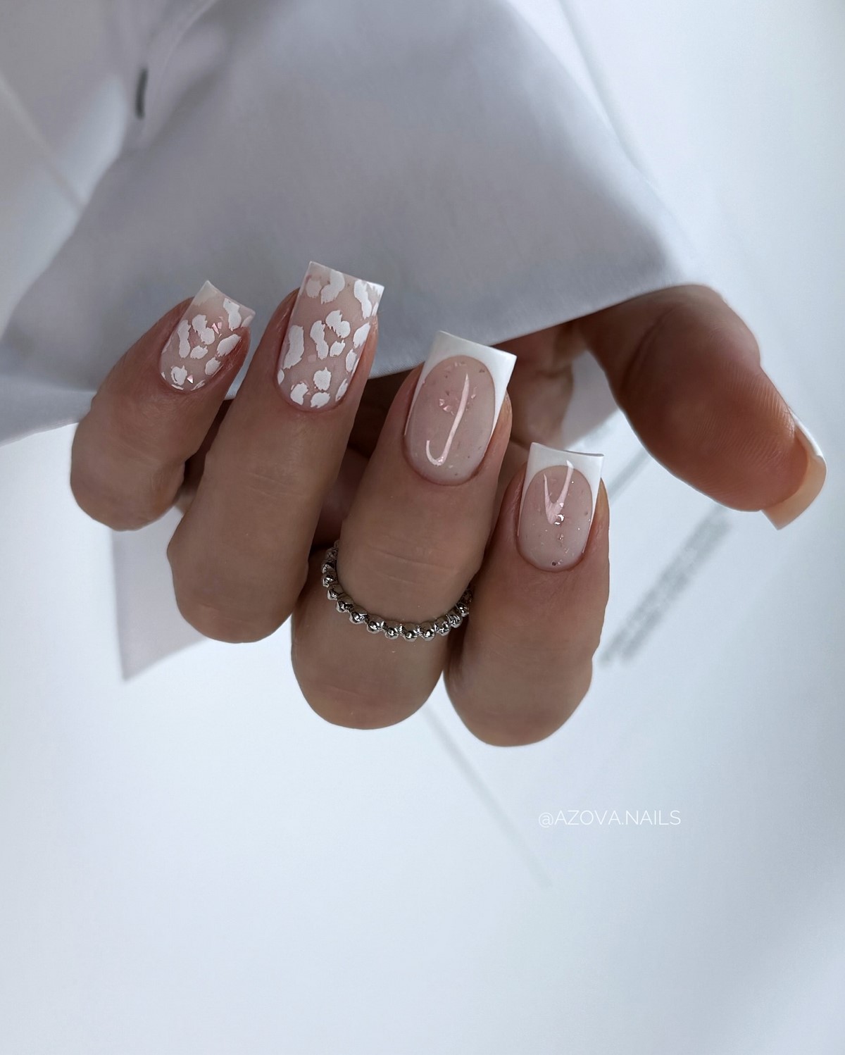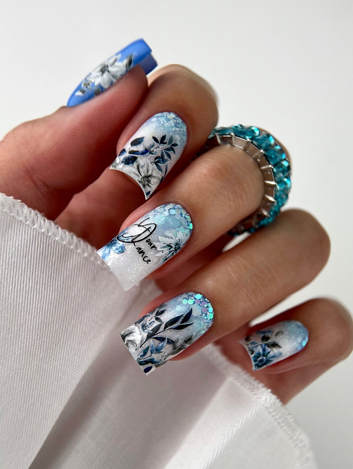 Абстрактна зимова тематика використовує характерні для сезону елементи без прямолінійних зображень: крижані осколки з фольги, морозні розводи, ефект запотілого скла. Синьо-біла гама з додаванням срібла або блакитного шиммера створює відчуття свіжості і чистоти зимового ранку. Акцентні нігті з детальними малюнками поєднуються з однотонними, створюючи збалансовану композицію.