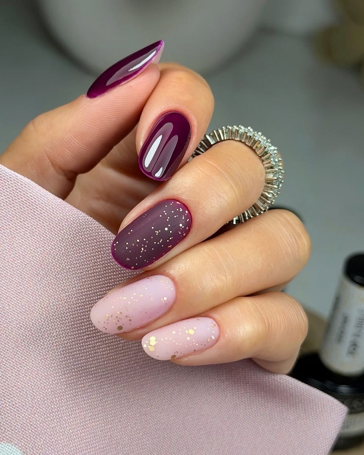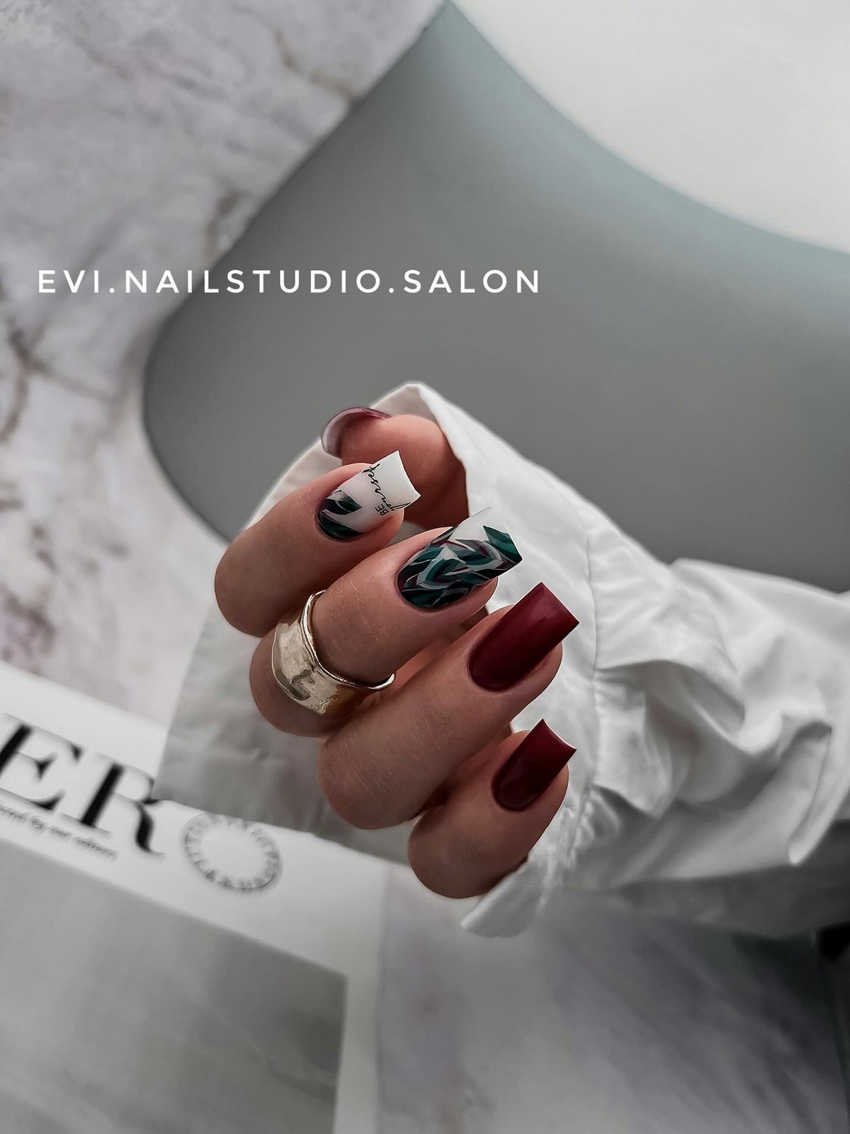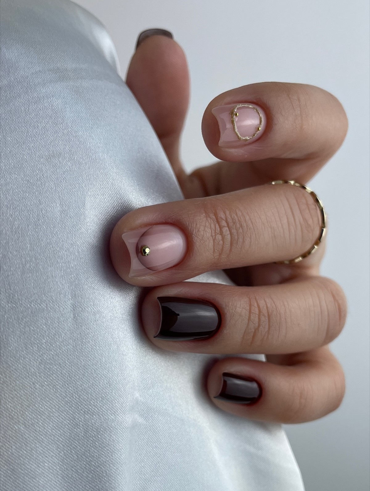 Асиметричний підхід, коли дизайн на лівій руці відрізняється від правої, але доповнює загальну концепцію, стає трендом сезону. Популярне поєднання протилежностей: матових і глянцевих текстур, темних і світлих відтінків, складного і простого декору. Такий манікюр дозволяє проявити креативність і створити дійсно індивідуальний образ, що відображає багатогранність особистості.