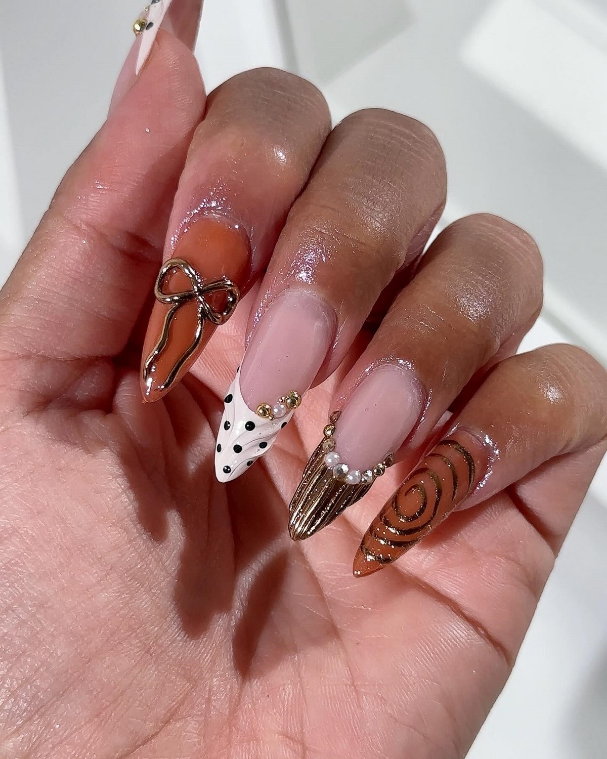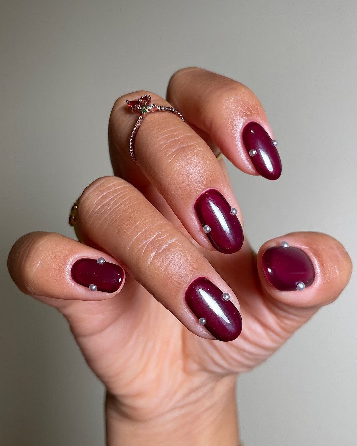 Намистини додають об’єм і текстуру манікюру, перетворюючи його на тривимірний витвір мистецтва. Перлинні намистини різних розмірів викладають у вигляді абстрактних візерунків або використовують для створення ніжних квіткових композицій. Для грудня ідеально підходить поєднання матового покриття з глянцевими намистинами, що створює гру фактур і привертає увагу до рук.