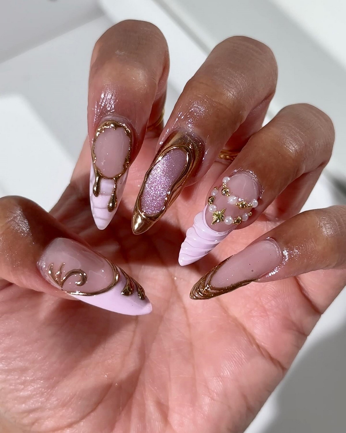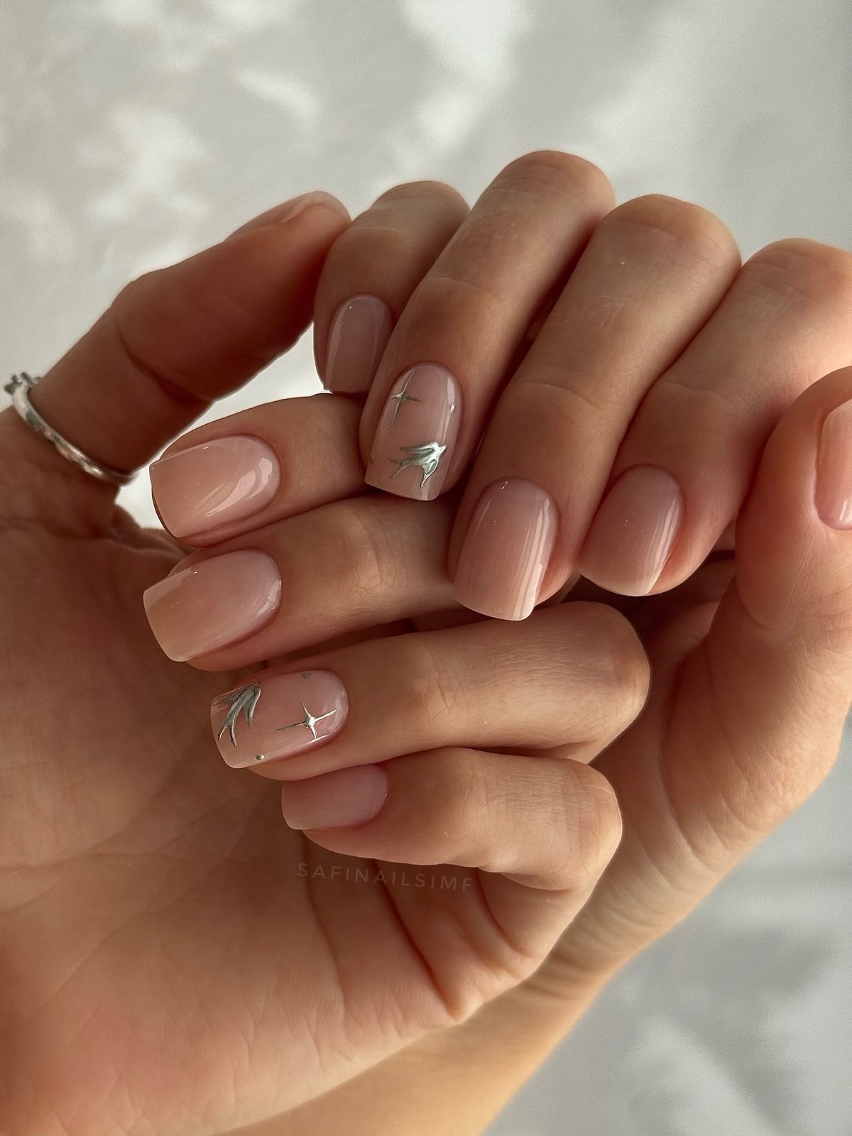 Мінімалістичний манікюр грудня 2025 року доводить, що елегантність не вимагає надлишку декору. Чисті лінії, геометричні форми, точкові акценти на нюдовій або пастельній основі створюють вишуканий і сучасний образ. Популярні тонкі золоті або срібні смужки, що утворюють абстрактні візерунки, або поодинокі стрази, розміщені біля основи нігтя.