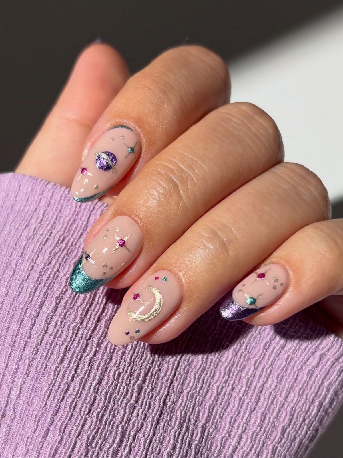 Вертикальний градієнт, коли колір змінюється від одного краю нігтя до іншого, створює ефект північного сяйва і виглядає особливо сучасно. Багатоколірні переходи з використанням трьох-чотирьох відтінків вимагають майстерності, але результат вражає глибиною і об’ємом. Додавання дрібних блискіток в зону переходу кольорів підсилює ефект сяйва і робить манікюр ще більш святковим.