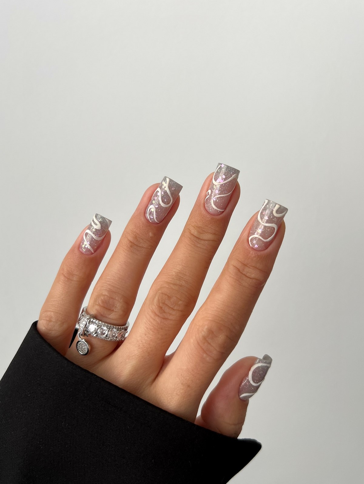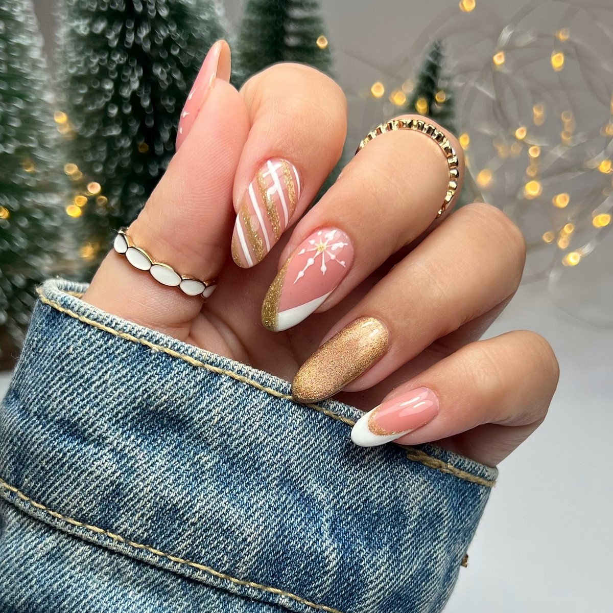 Завершує топ-12 найсвятковіший варіант – манікюр з великою кількістю блискіток і витонченими сніжинками. Глітер в грудні 2025 року використовується як повне покриття нігтя для створення ефекту дорогоцінного металу, так і акцентно – на кінчиках, у вигляді градієнта або геометричних зон. Особливо актуальні голографічні блискітки, що створюють райдужні переливи, і великі гексагональні блискітки, що нагадують справжні сніжинки.