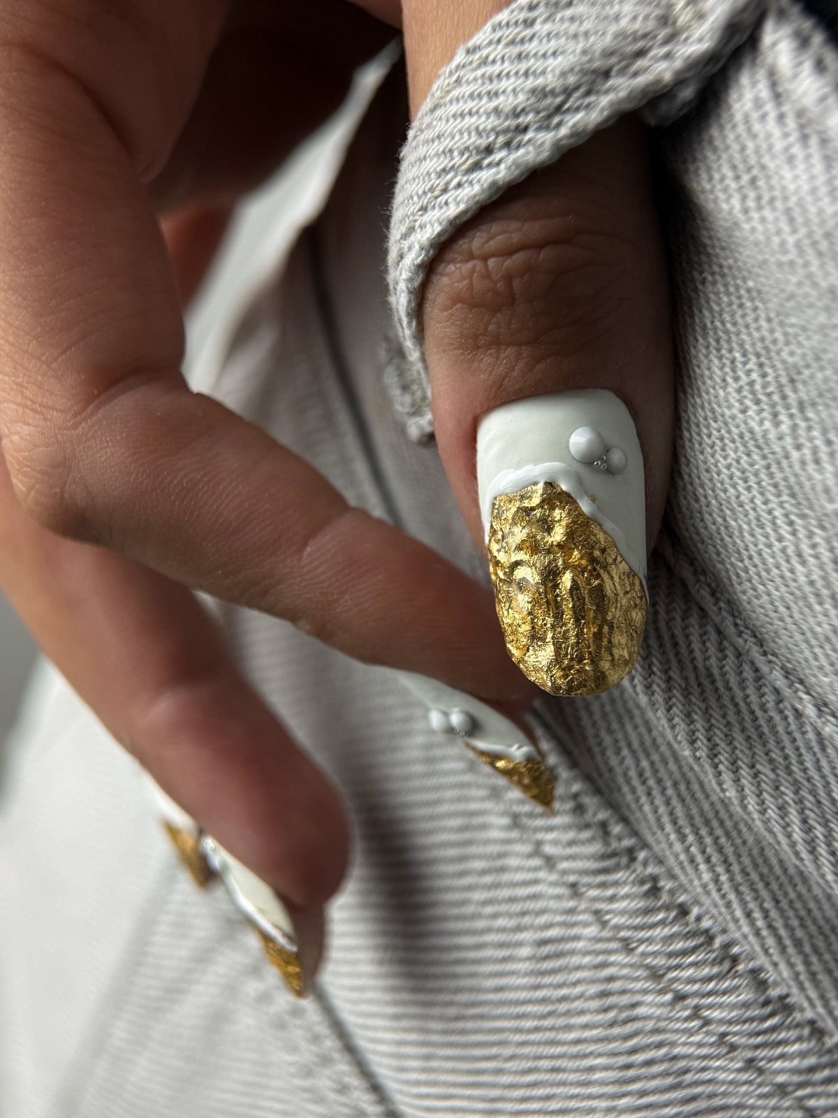 Текстурний манікюр: біла штукатурка із золотими нитками