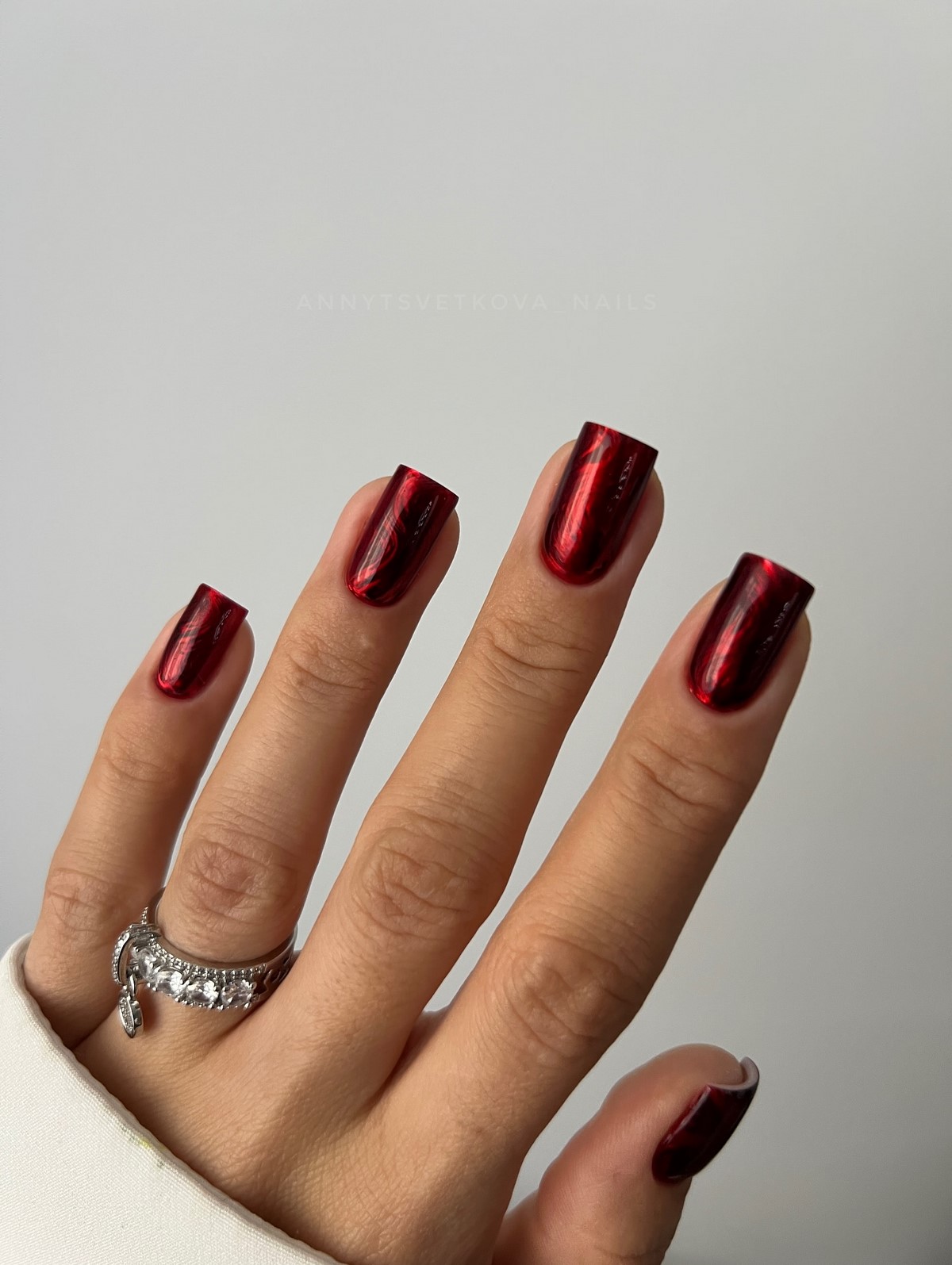Такий дизайн ідеально підкреслює вечірні образи і блискучі тканини — паєтки, шовк, оксамит. Особливо ефектно металевий манікюр виглядає на коротких нігтях квадратної форми. Для особливого ефекту можна зробити акцент на одному або двох нігтях, виділивши їх більш насиченим тоном.