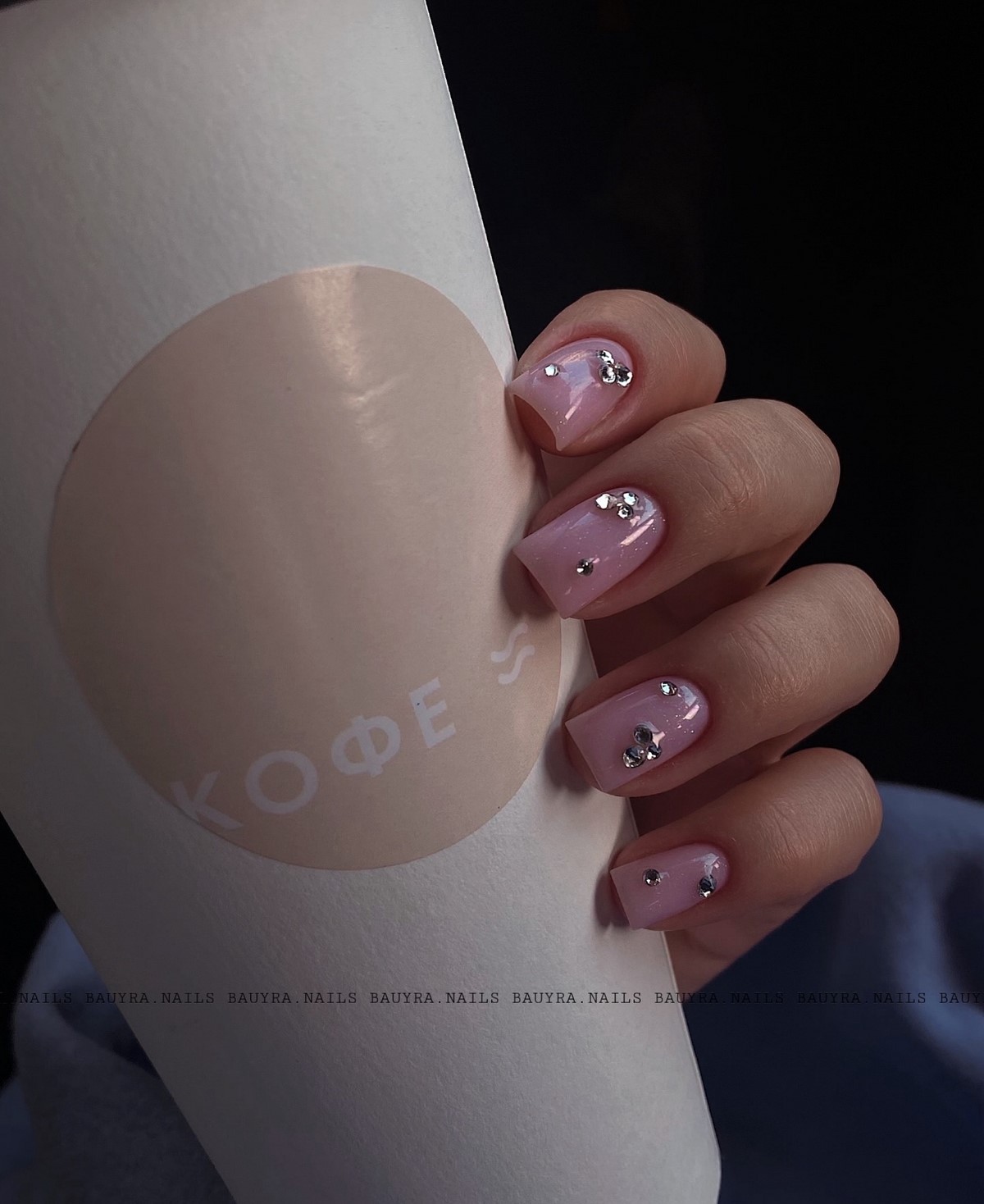 У сезоні 2026 стрази стають делікатними — ніяких масивних композицій. Тренд — мінімалізм і витонченість: кілька маленьких кристалів в зоні кутикули або вздовж нігтя на нюдовій або бежевій основі.