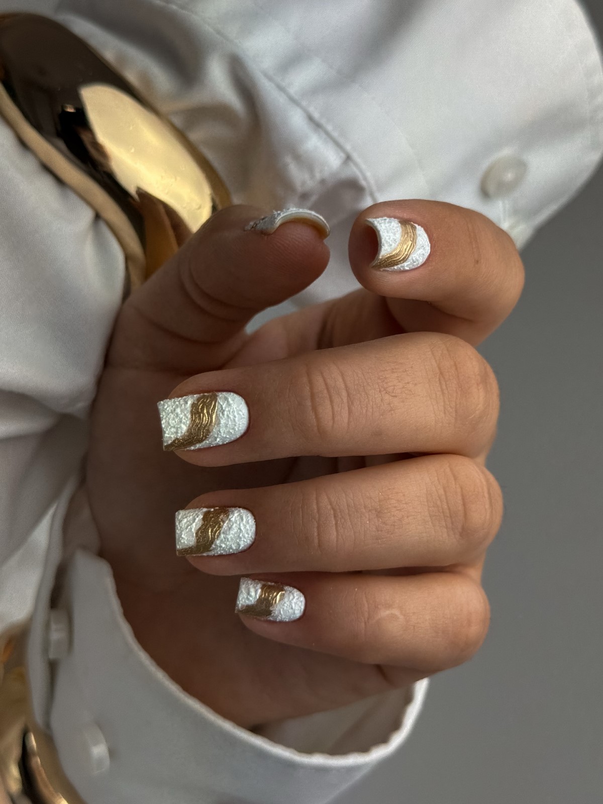 Текстурний манікюр: біла штукатурка із золотими нитками