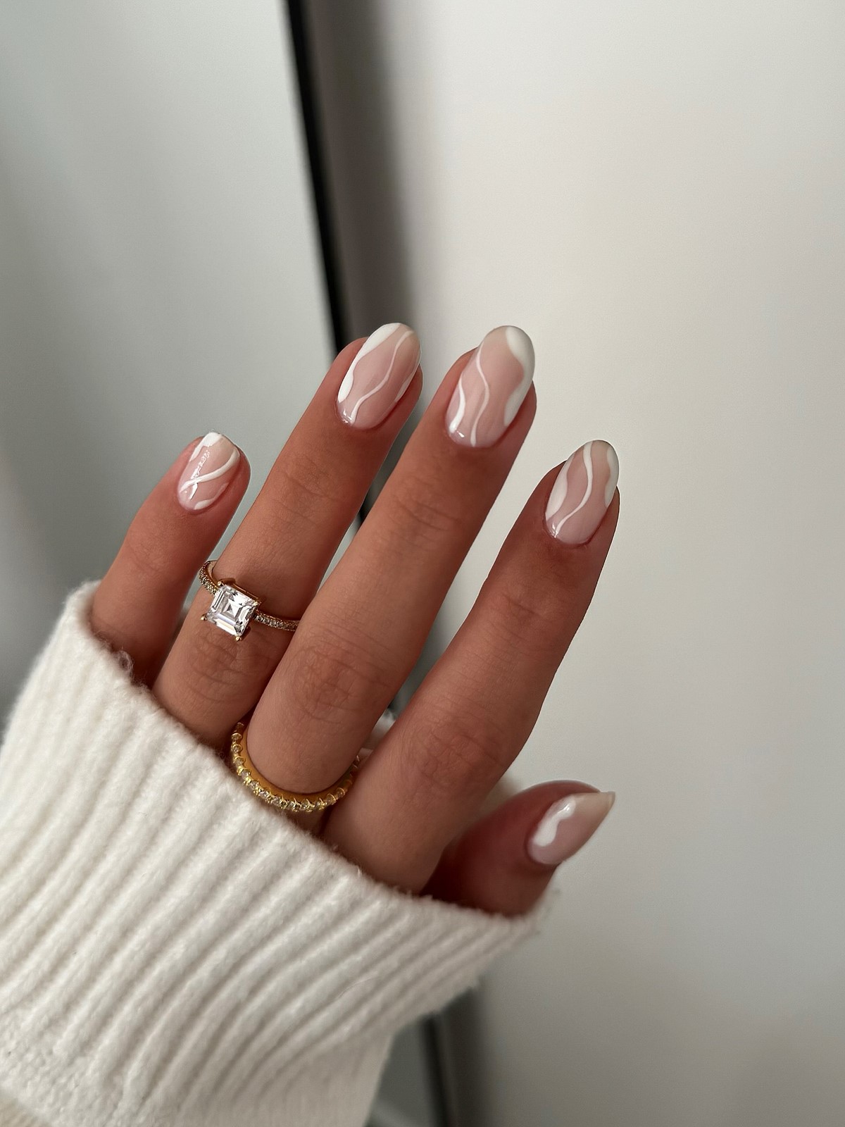 Цей дизайн особливо красиво виглядає на коротких або середньої довжини нігтях овальної форми. Він відмінно підходить для тих, хто віддає перевагу спокійній базі з акцентом біля кутикули.