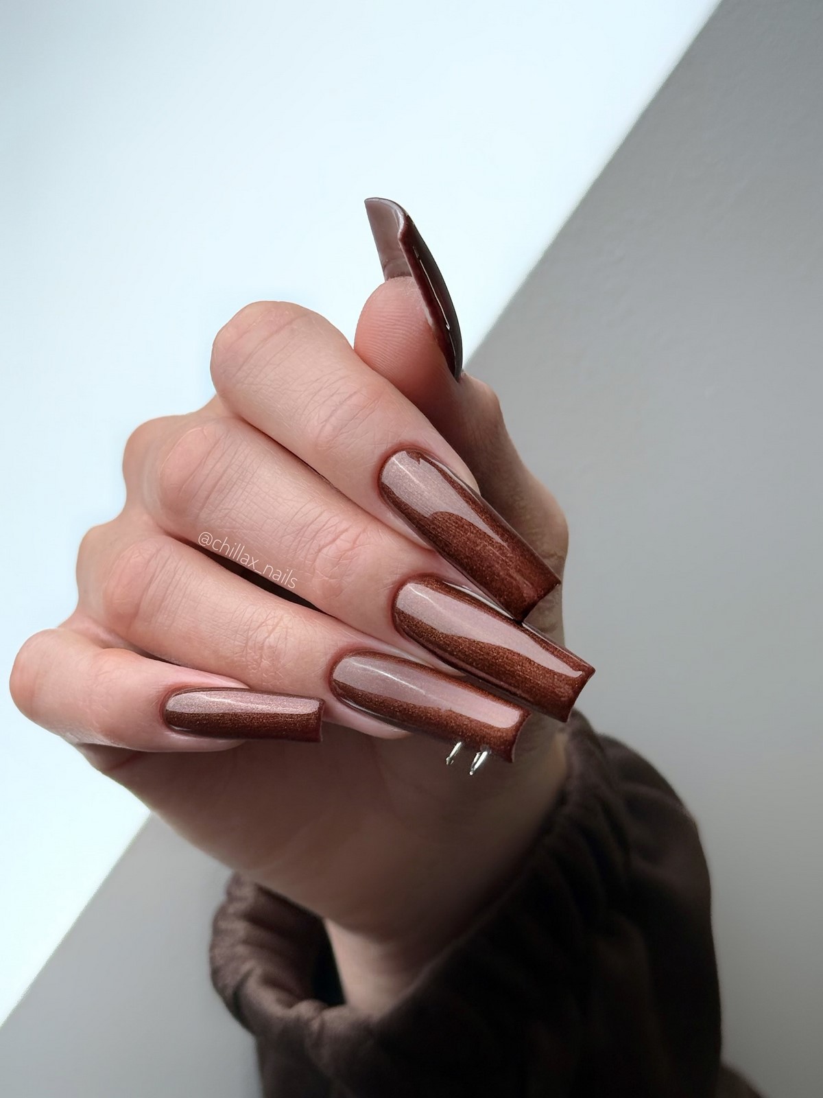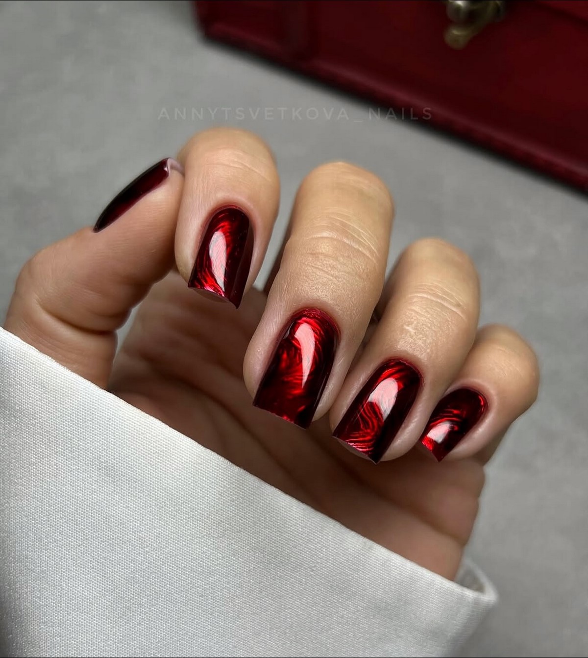 Такий дизайн ідеально підкреслює вечірні образи і блискучі тканини — паєтки, шовк, оксамит. Особливо ефектно металевий манікюр виглядає на коротких нігтях квадратної форми. Для особливого ефекту можна зробити акцент на одному або двох нігтях, виділивши їх більш насиченим тоном.