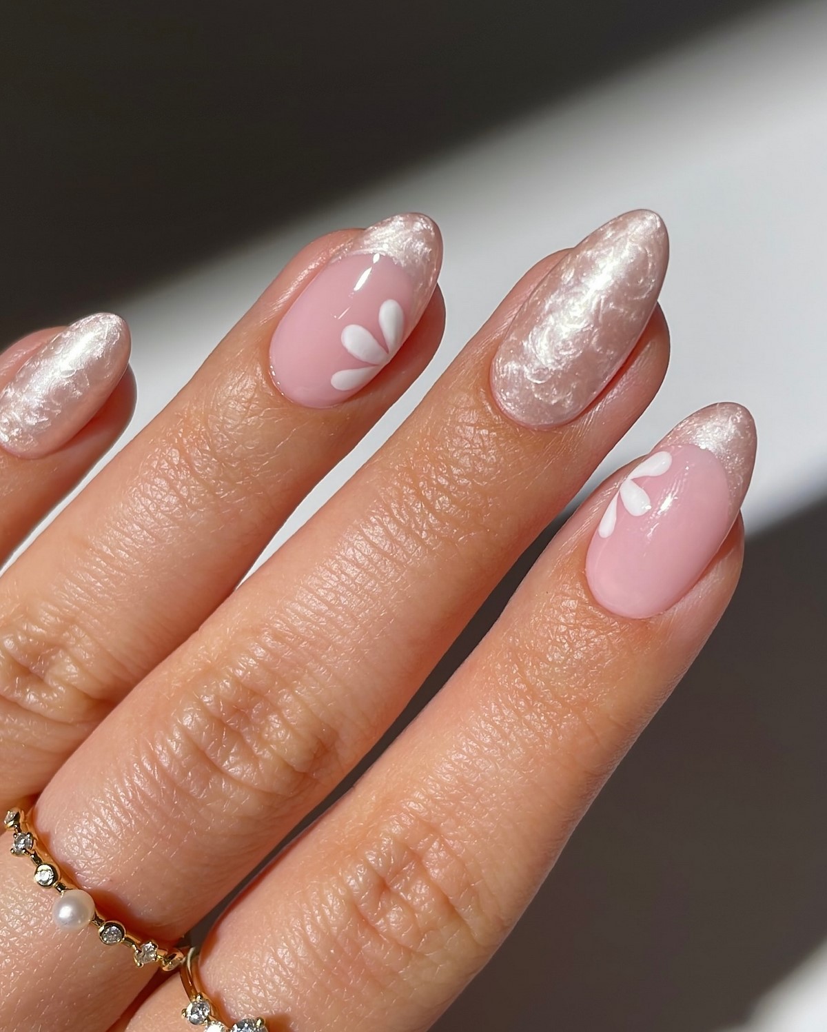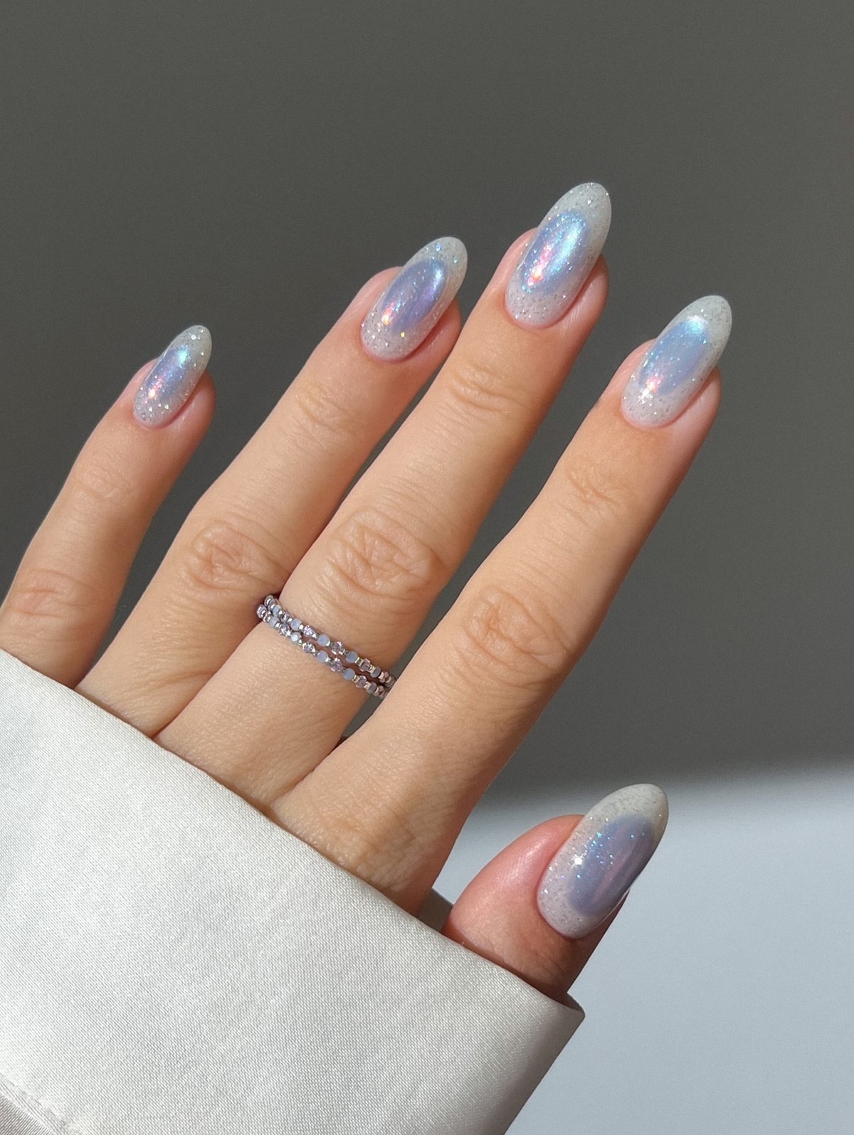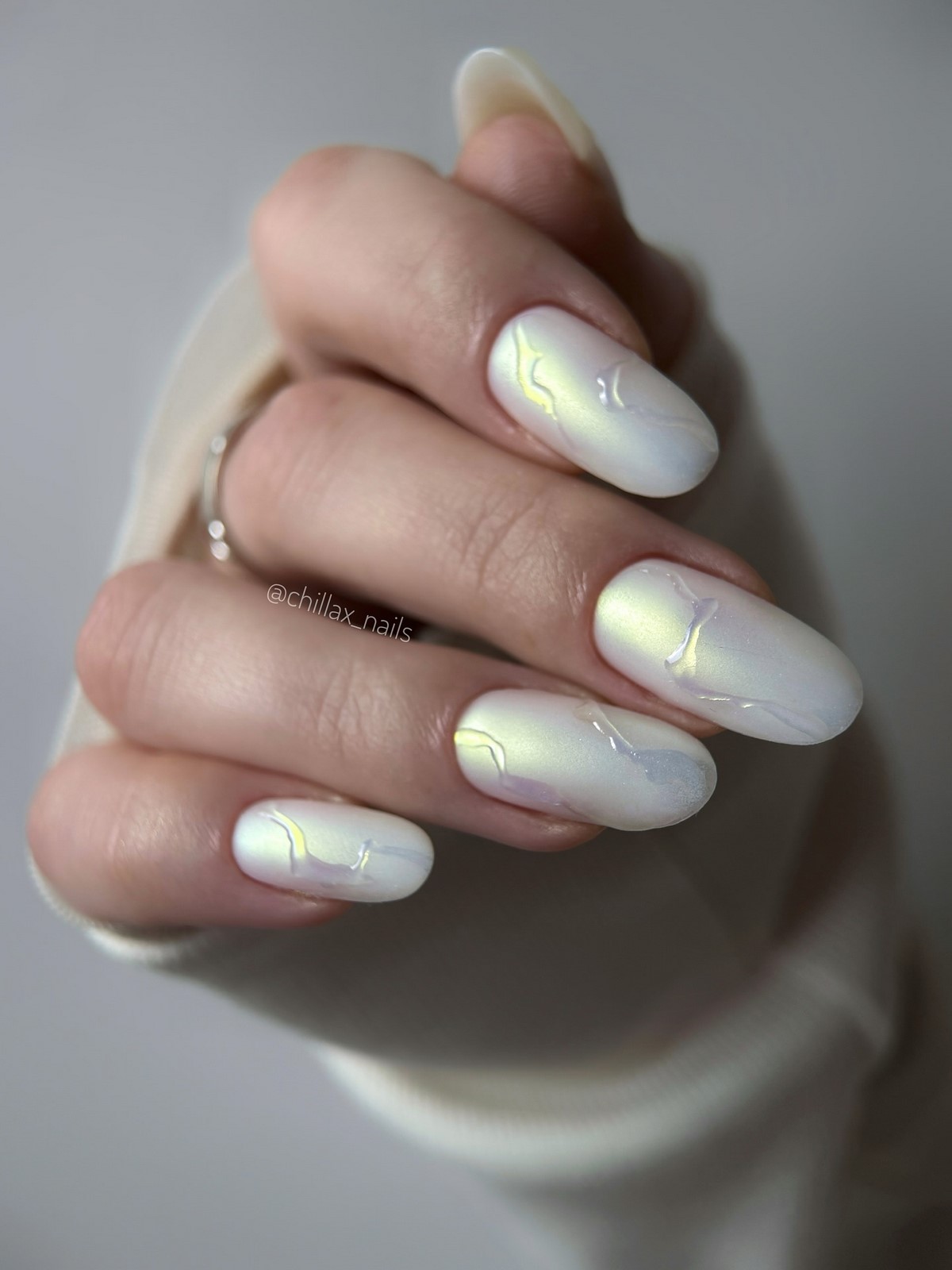 Перламутрові нігті — це головний тренд зими 2025–2026. М’яке, переливчасте сяйво створює ефект ранкового інею і ідеально підходить для святкового образу. Відтінки варіюються від молочного і перлового до ніжно-рожевого і золотистого. Такий манікюр надає рукам доглянутий, жіночний вигляд і гармонійно поєднується з блискучими сукнями, сатиновими вбраннями та аксесуарами.