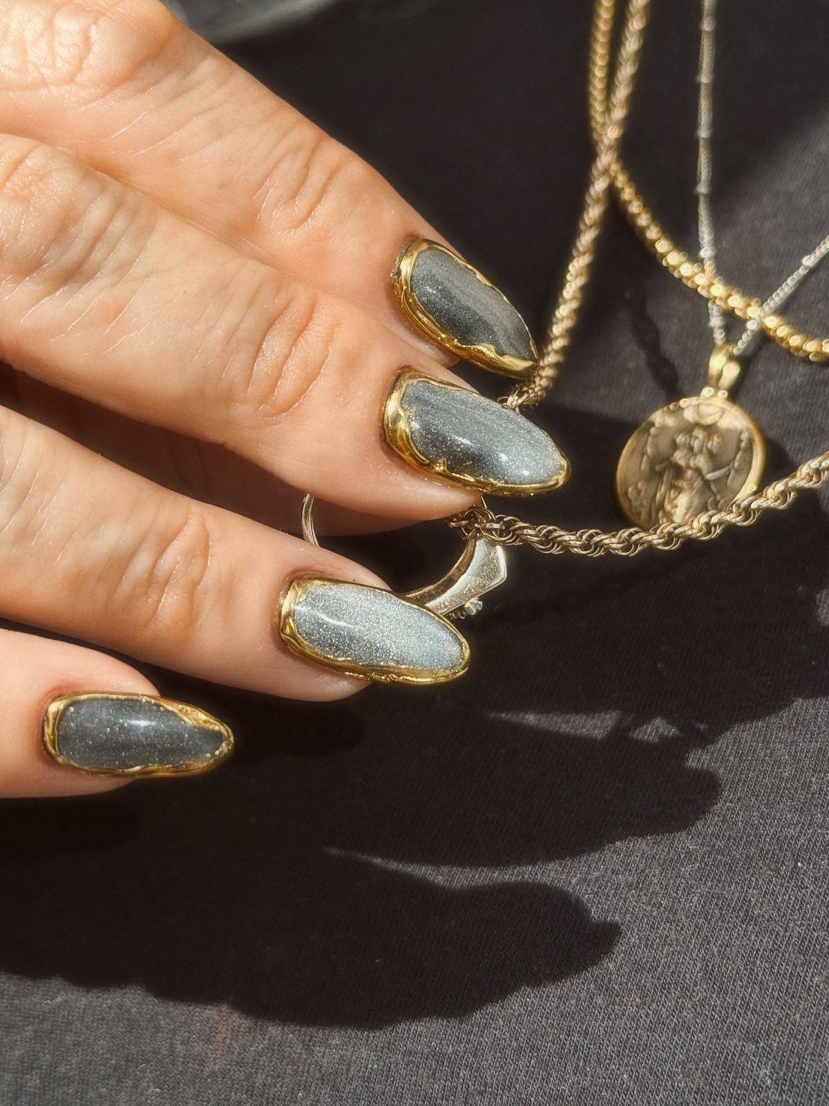Металевий манікюр продовжує підкорювати fashion-подіуми і nail-тренди. У новорічній версії він стає більш м’яким і вишуканим: срібло, платина, рожеве золото і графітові відтінки надають нігтям дзеркальне сяйво.