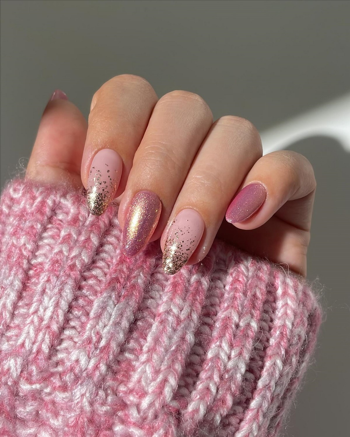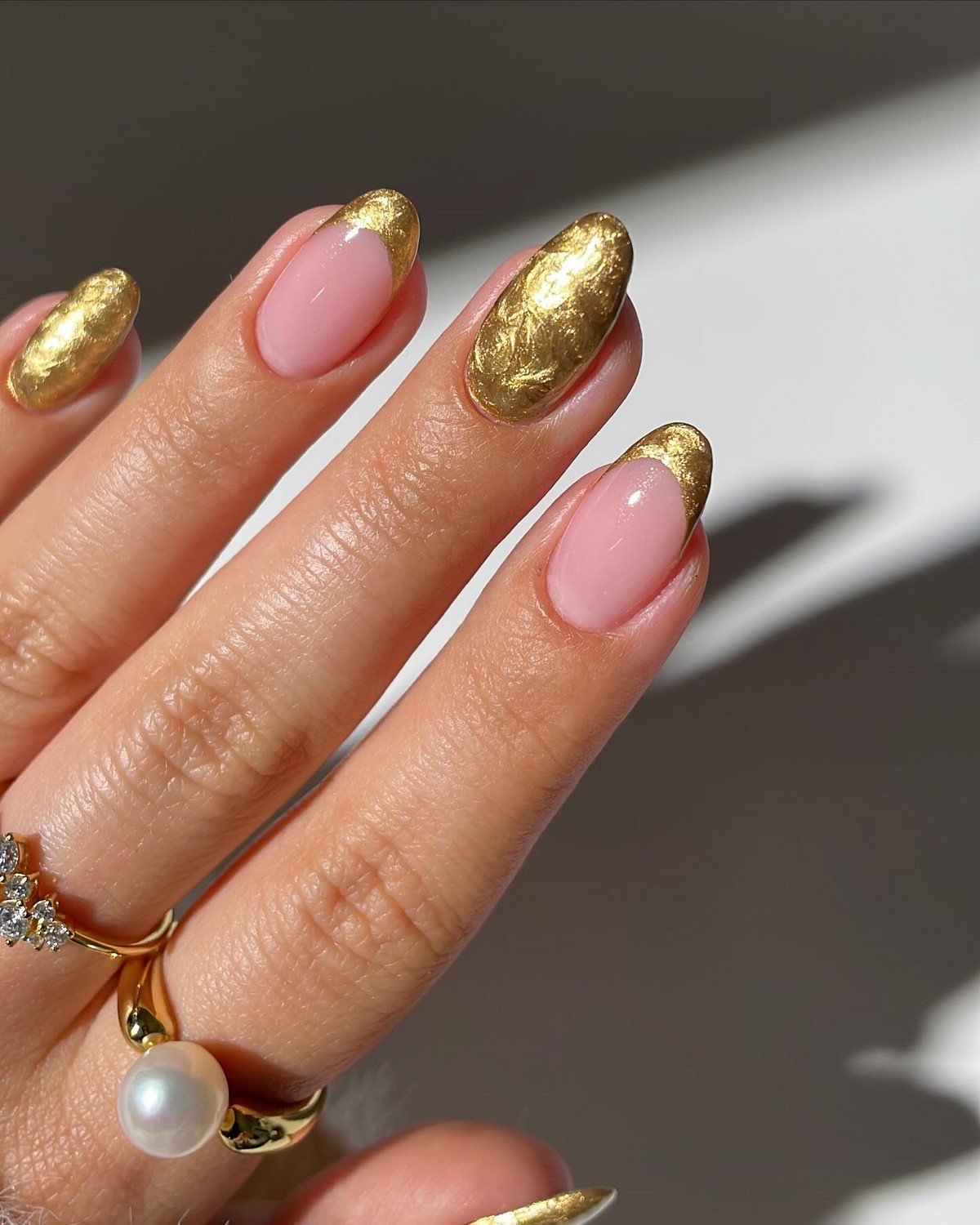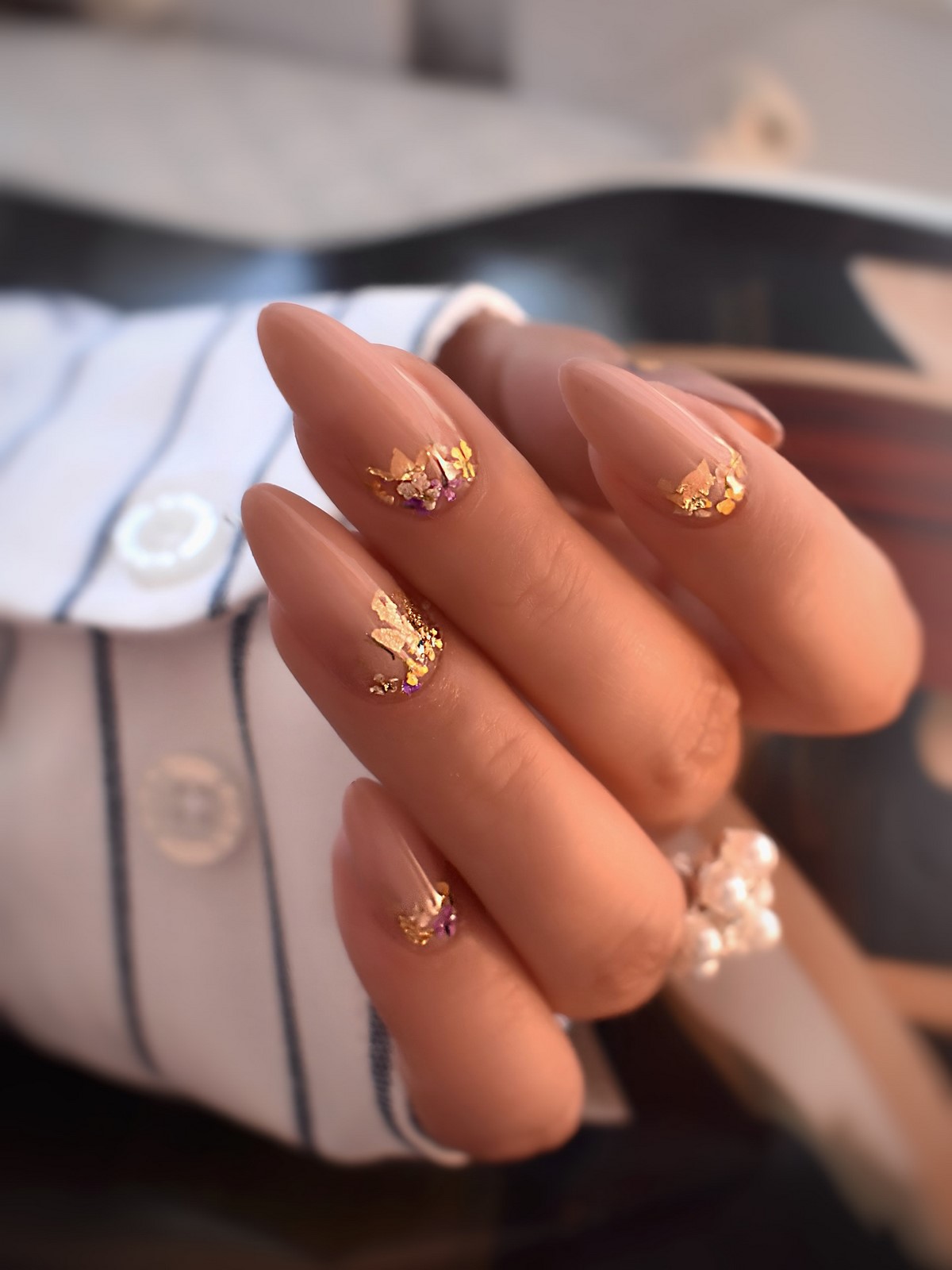 Базовий нюдовий манікюр у сезоні-2026 отримує святкове оновлення. Тепер до нього додають розсип блискіток біля основи нігтя, шматочки золотої або срібної поталі, тонкі фрагменти фольги або каміфубукі. Таке поєднання виглядає дорого, але не вигадливо — ідеальний баланс між елегантністю і сяйвом.