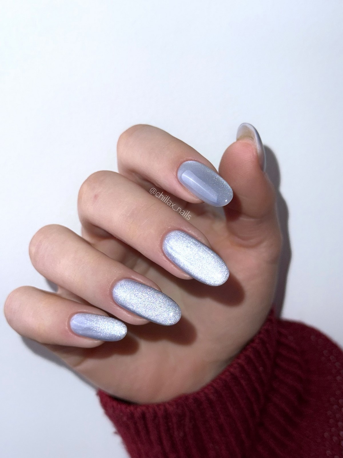 Цей дизайн особливо красиво виглядає при вечірньому освітленні, коли відблиск оживає на нігтях, створюючи ефект руху. Блакитний Cat Eye можна комбінувати з білим, сріблястим або молочним покриттям, створюючи м’який перехід між відтінками. Такий манікюр виглядає дорого і ідеально вписується в новорічну естетику.