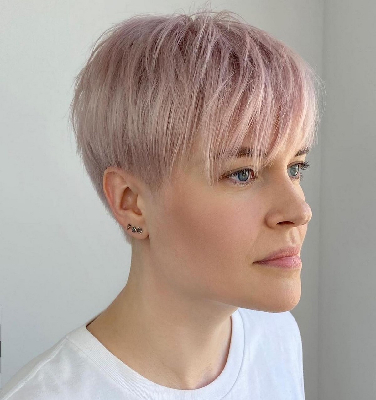 Асиметрична піксі з подовженим пасмом біля обличчя створює цікавий контраст і дозволяє коригувати форму обличчя, додаючи образу вишуканості та оригінальності.