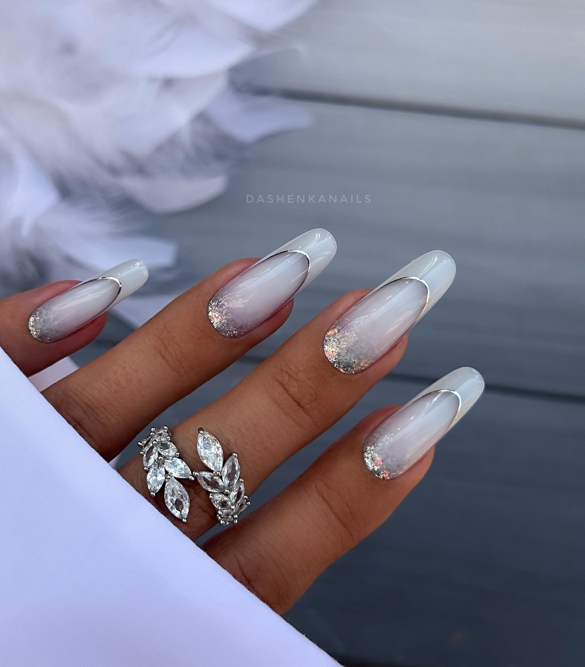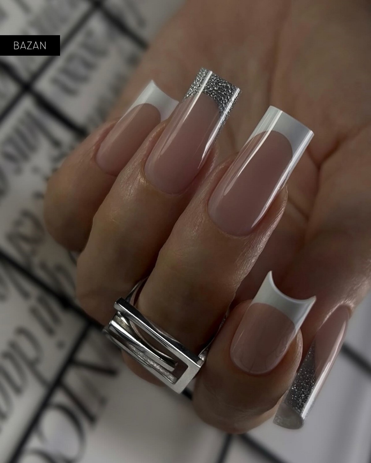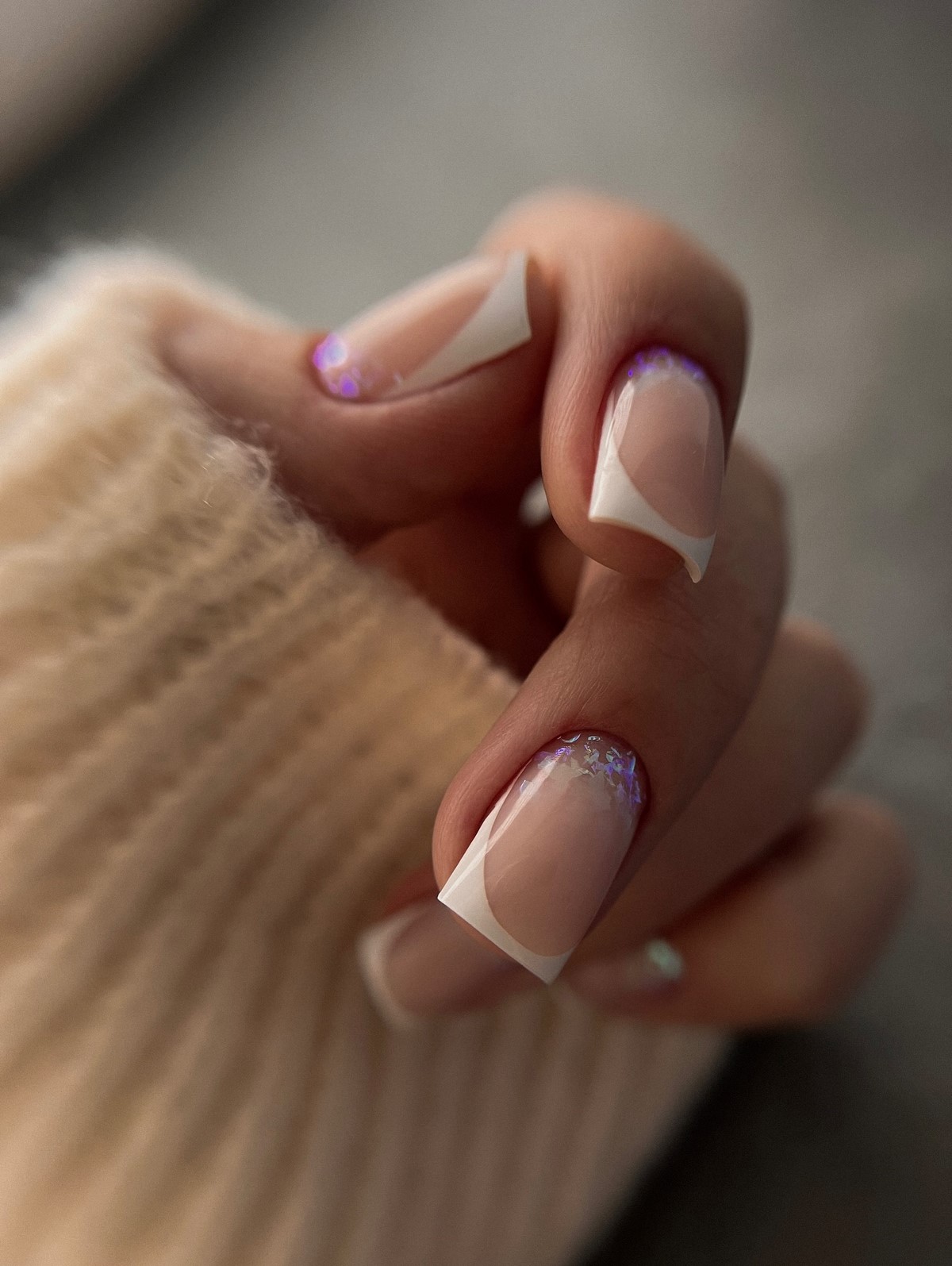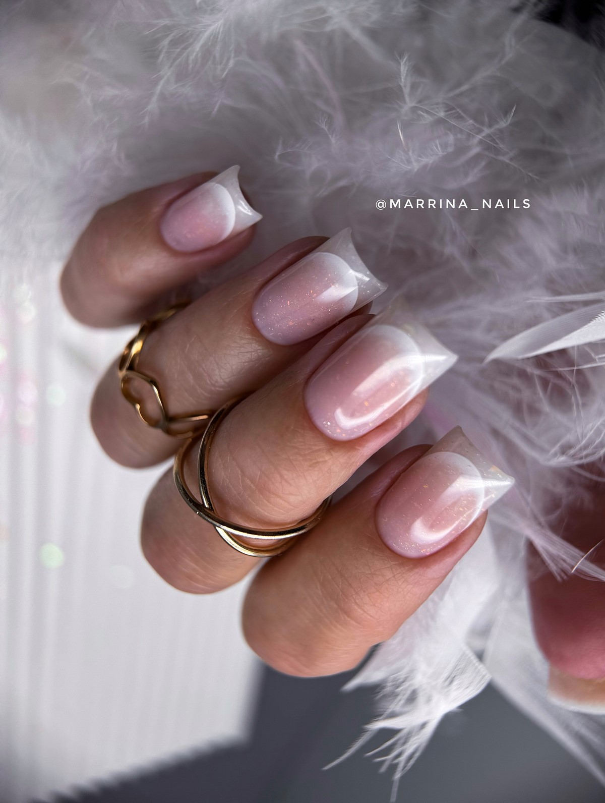 Френч з блискучими акцентами — один з головних хітів сезону. «Посмішка» може бути повністю виконана з глітера або доповнена блискучою пудрою. Такий манікюр освіжає образ і підходить як для вечірки, так і для повсякденного стилю, якщо використовувати приглушені відтінки.