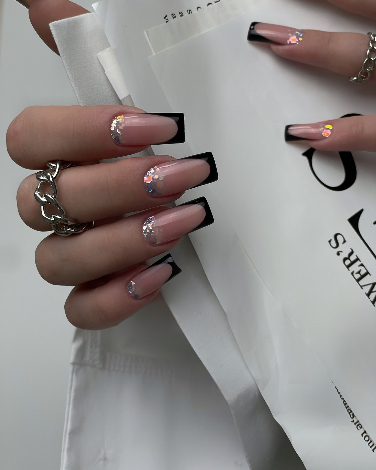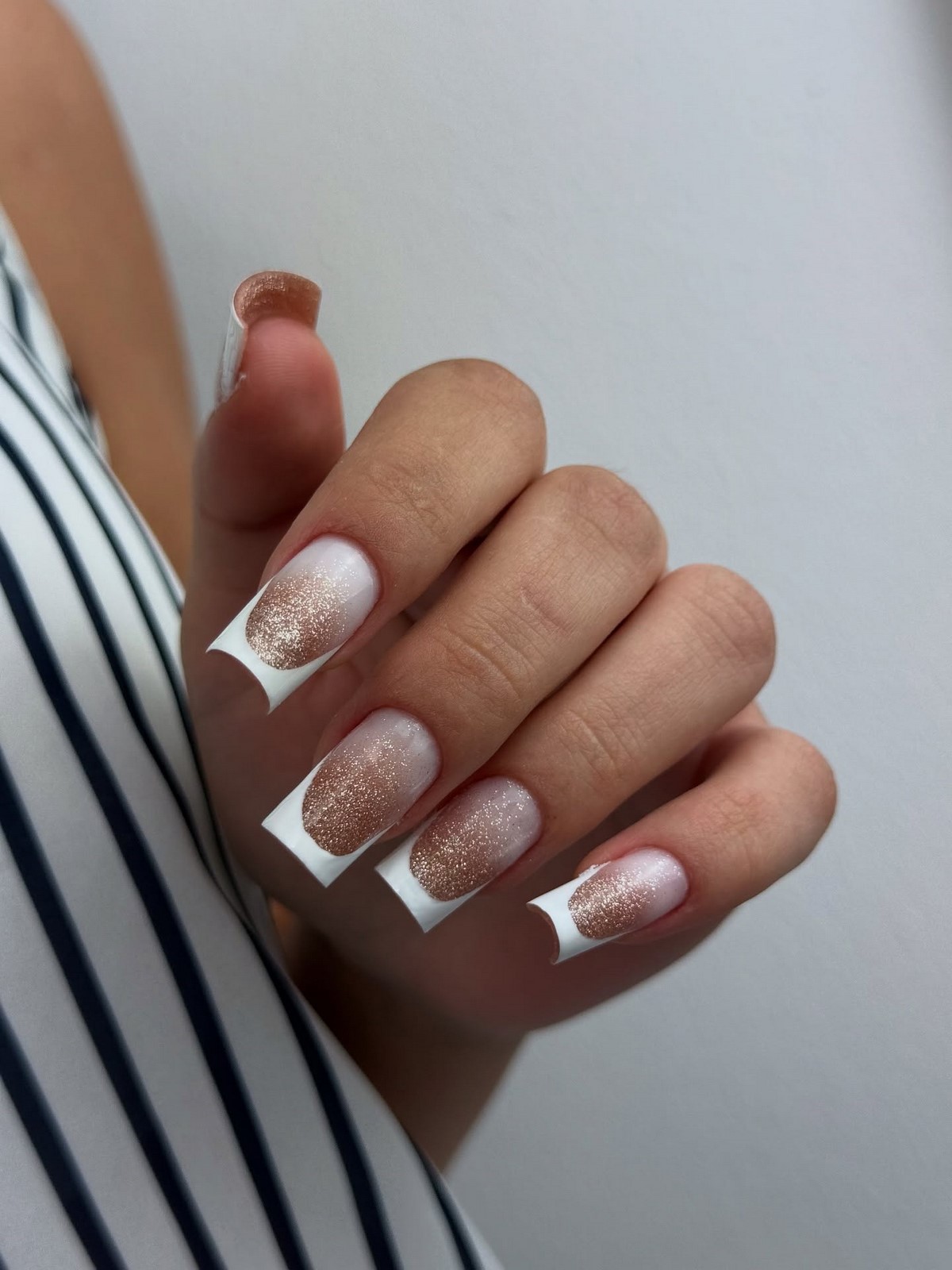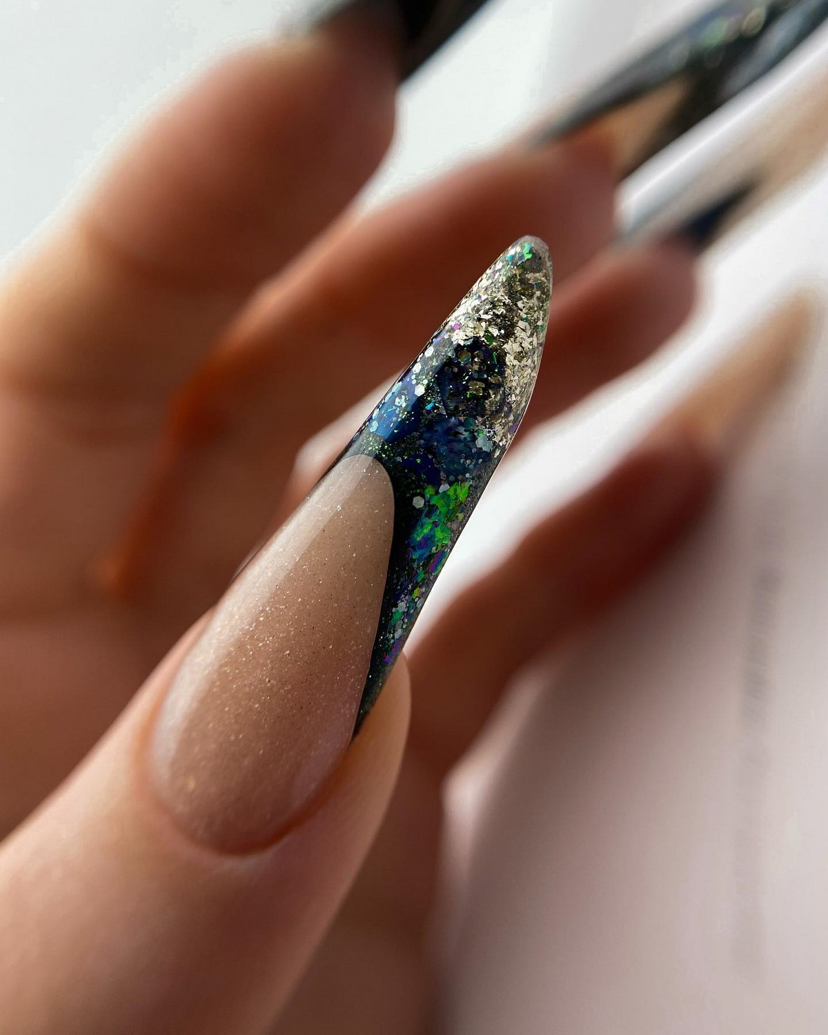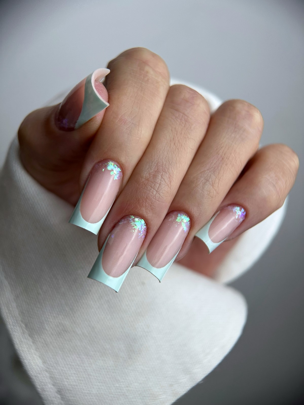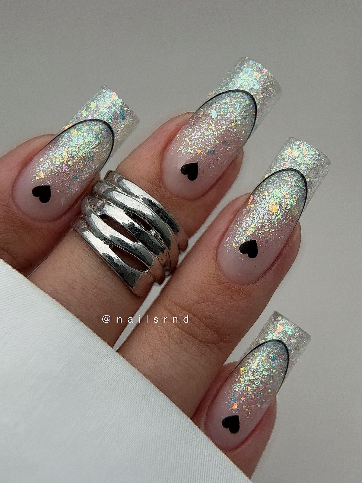 Френч з блискучими акцентами — один з головних хітів сезону. «Посмішка» може бути повністю виконана з глітера або доповнена блискучою пудрою. Такий манікюр освіжає образ і підходить як для вечірки, так і для повсякденного стилю, якщо використовувати приглушені відтінки.