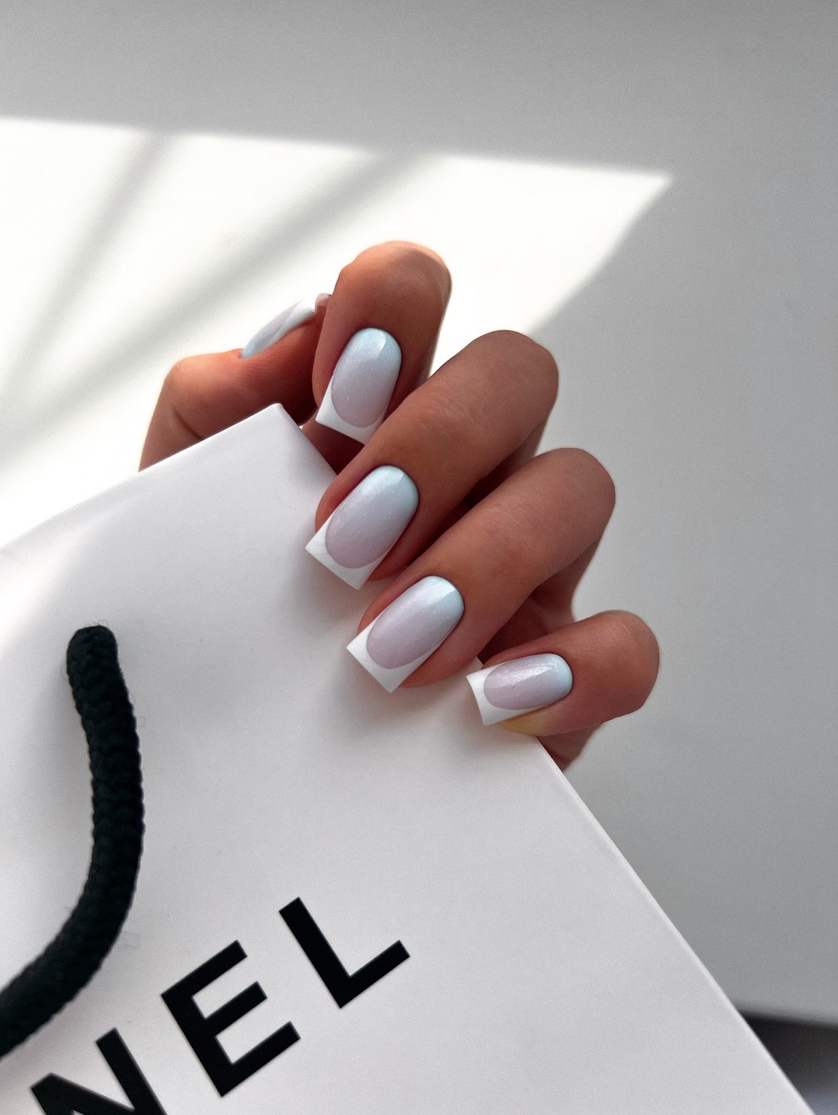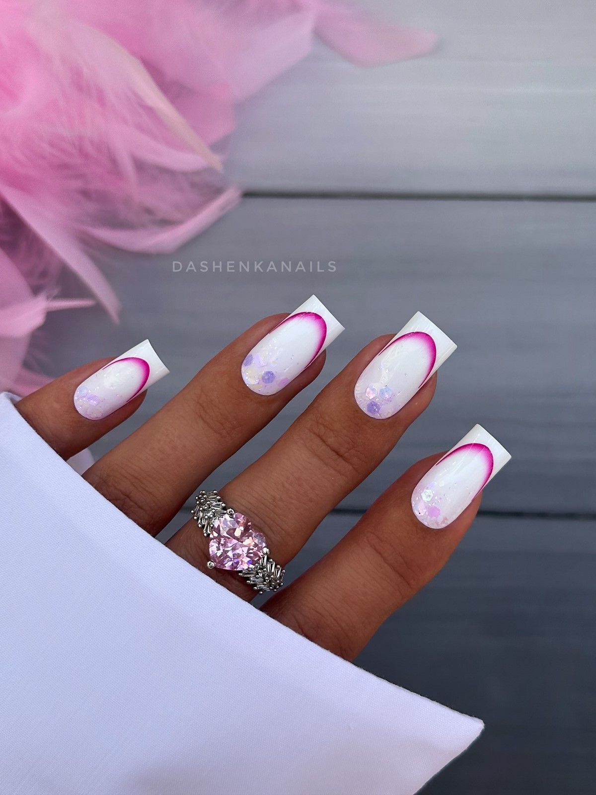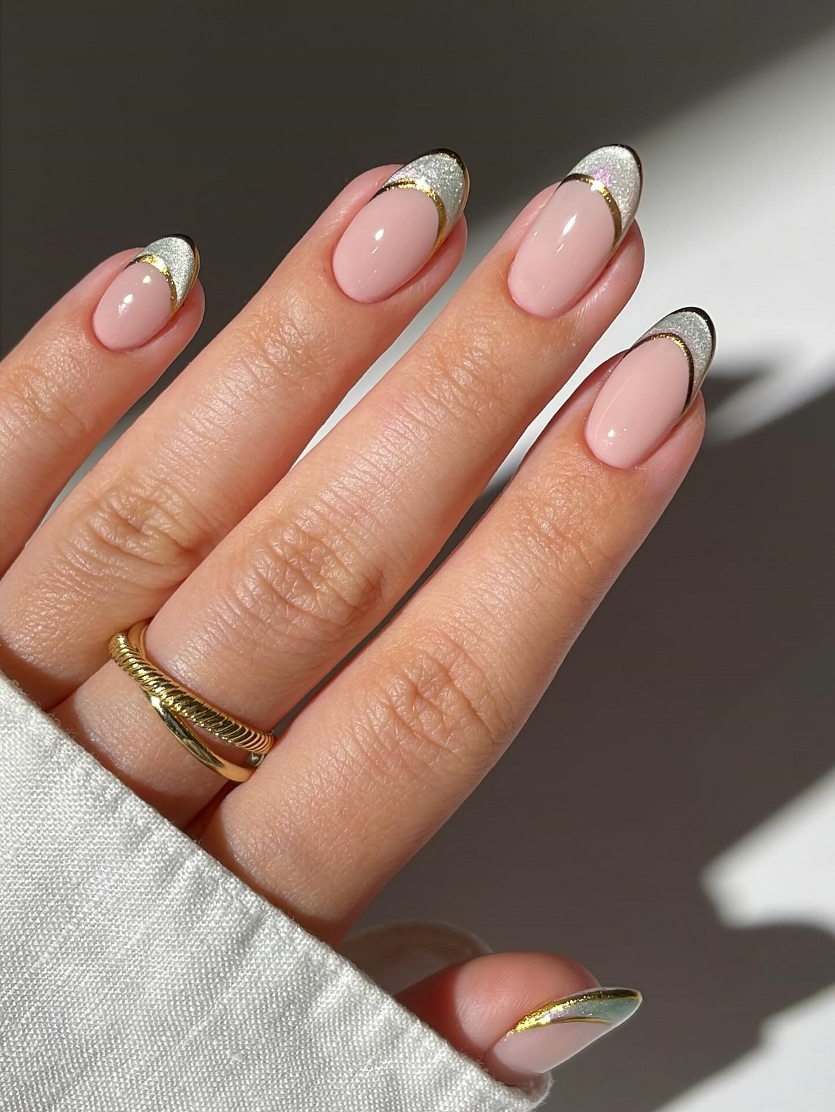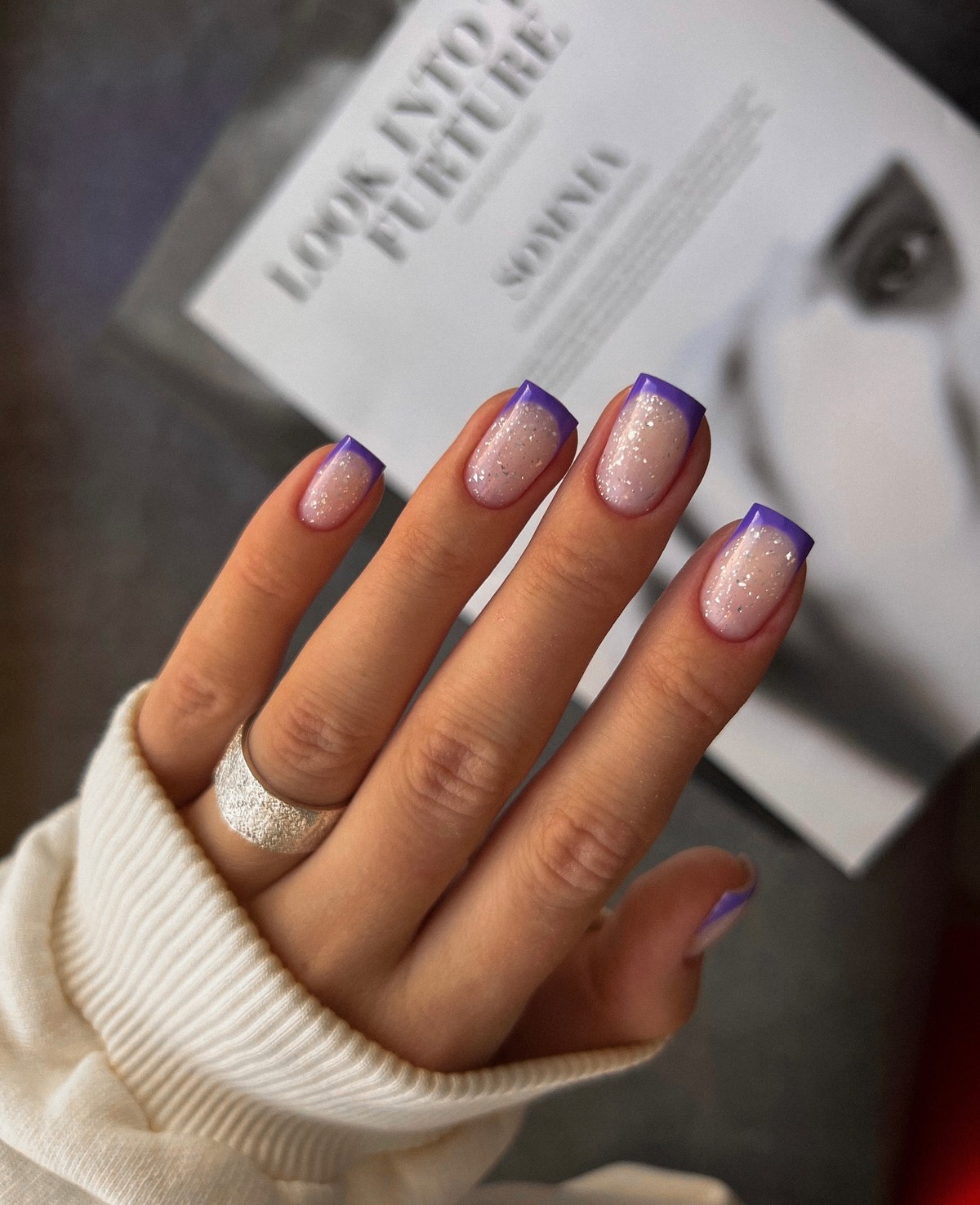 Френч з блискучими акцентами — один з головних хітів сезону. «Посмішка» може бути повністю виконана з глітера або доповнена блискучою пудрою. Такий манікюр освіжає образ і підходить як для вечірки, так і для повсякденного стилю, якщо використовувати приглушені відтінки.