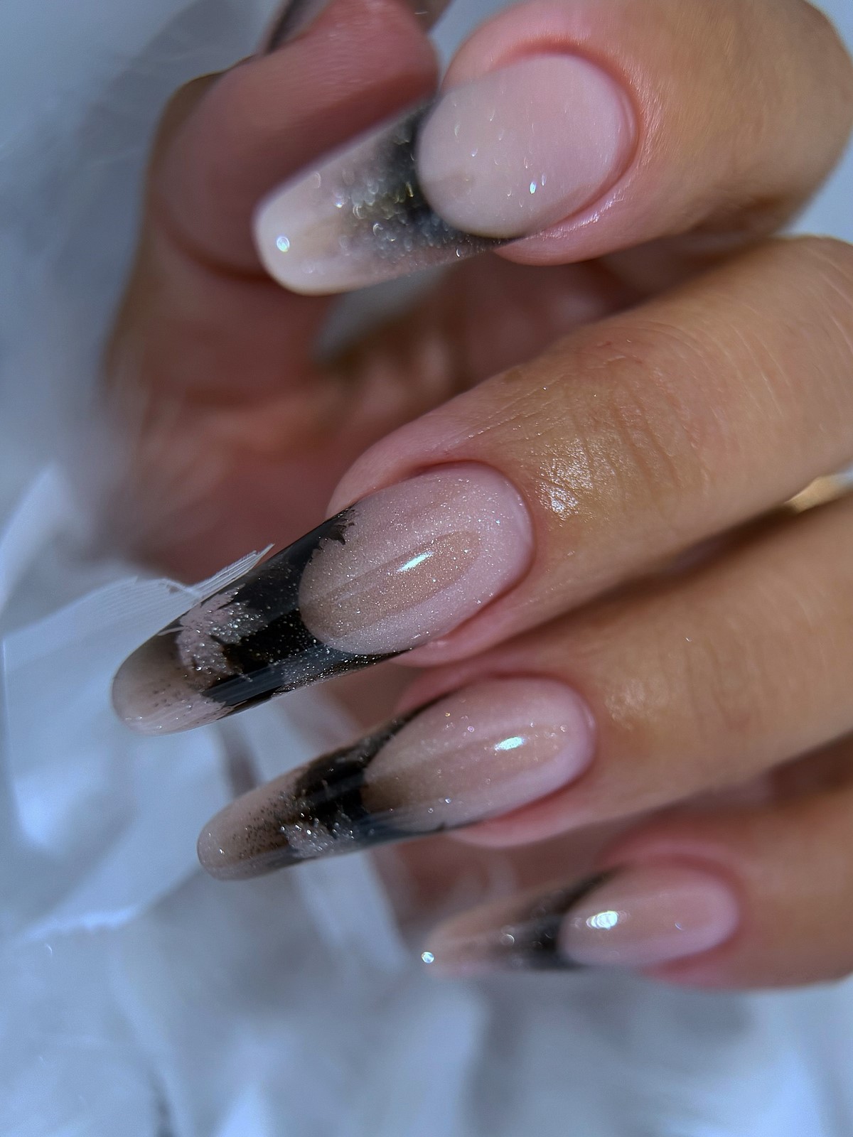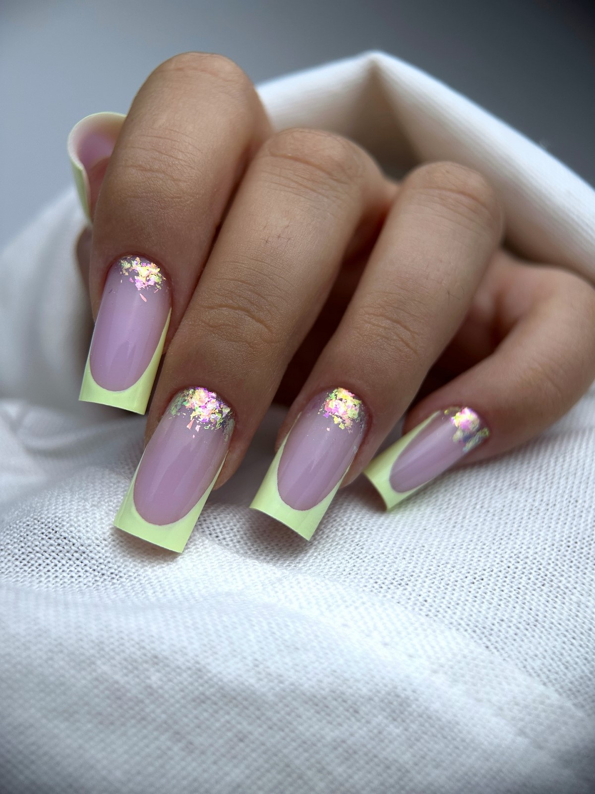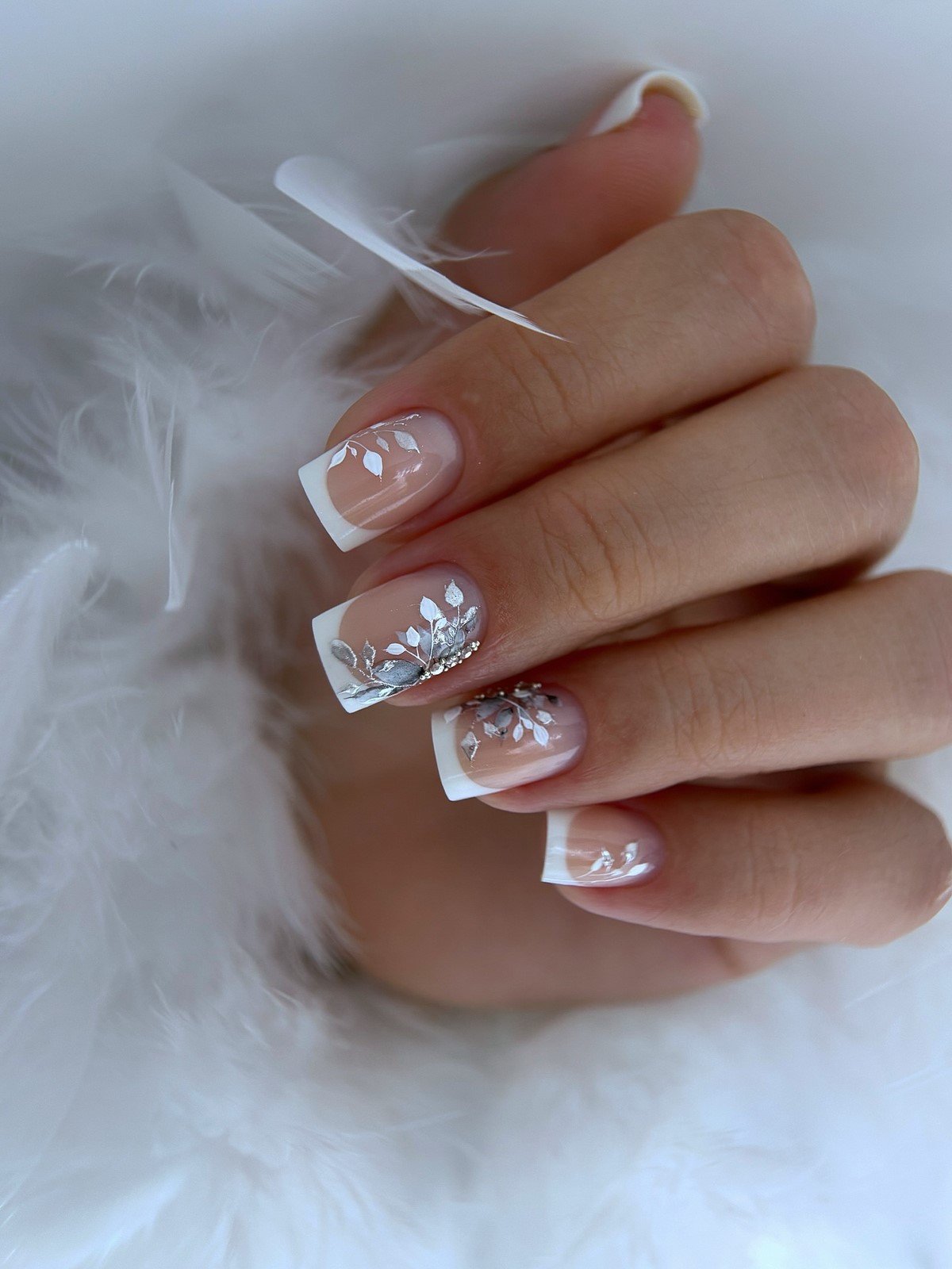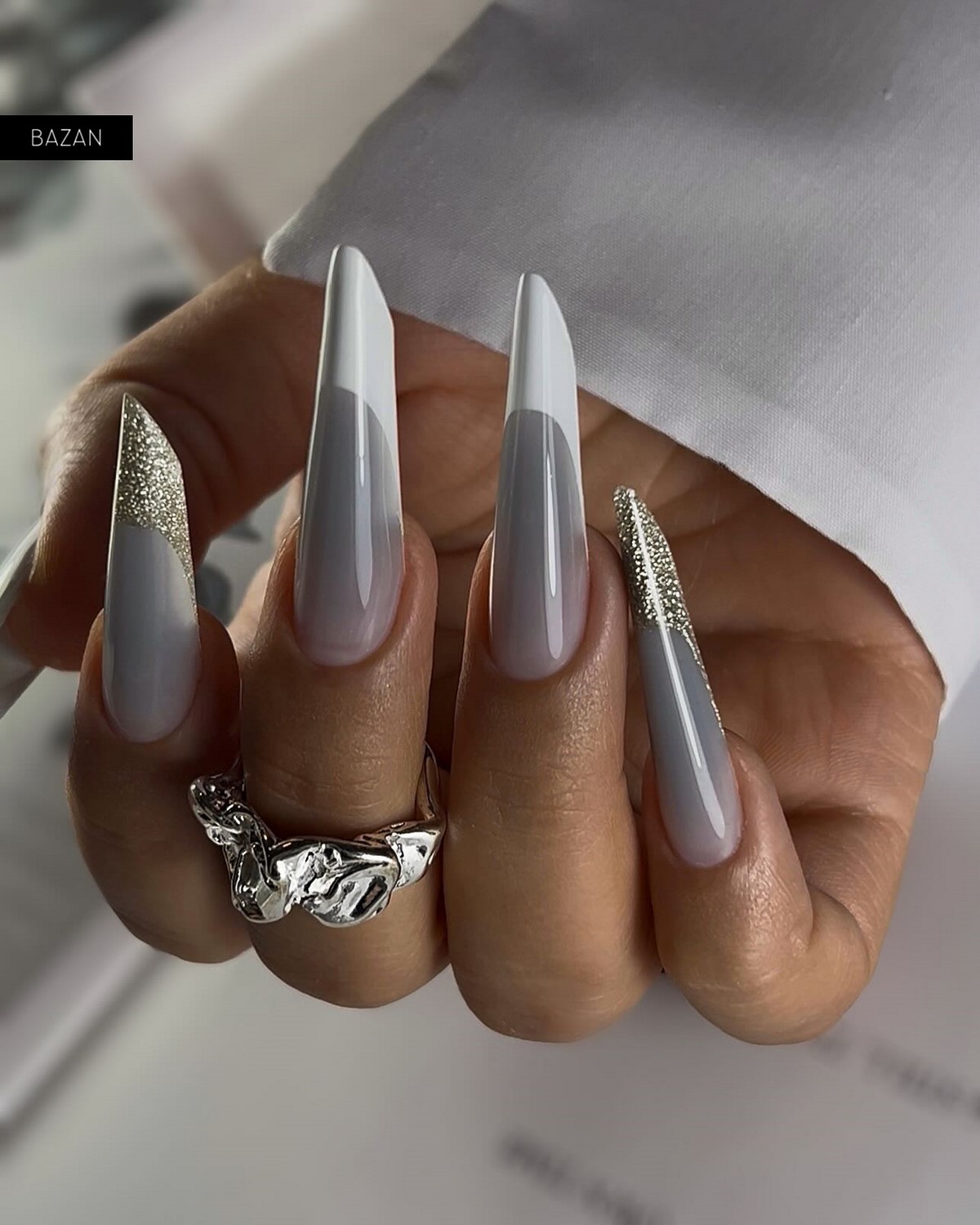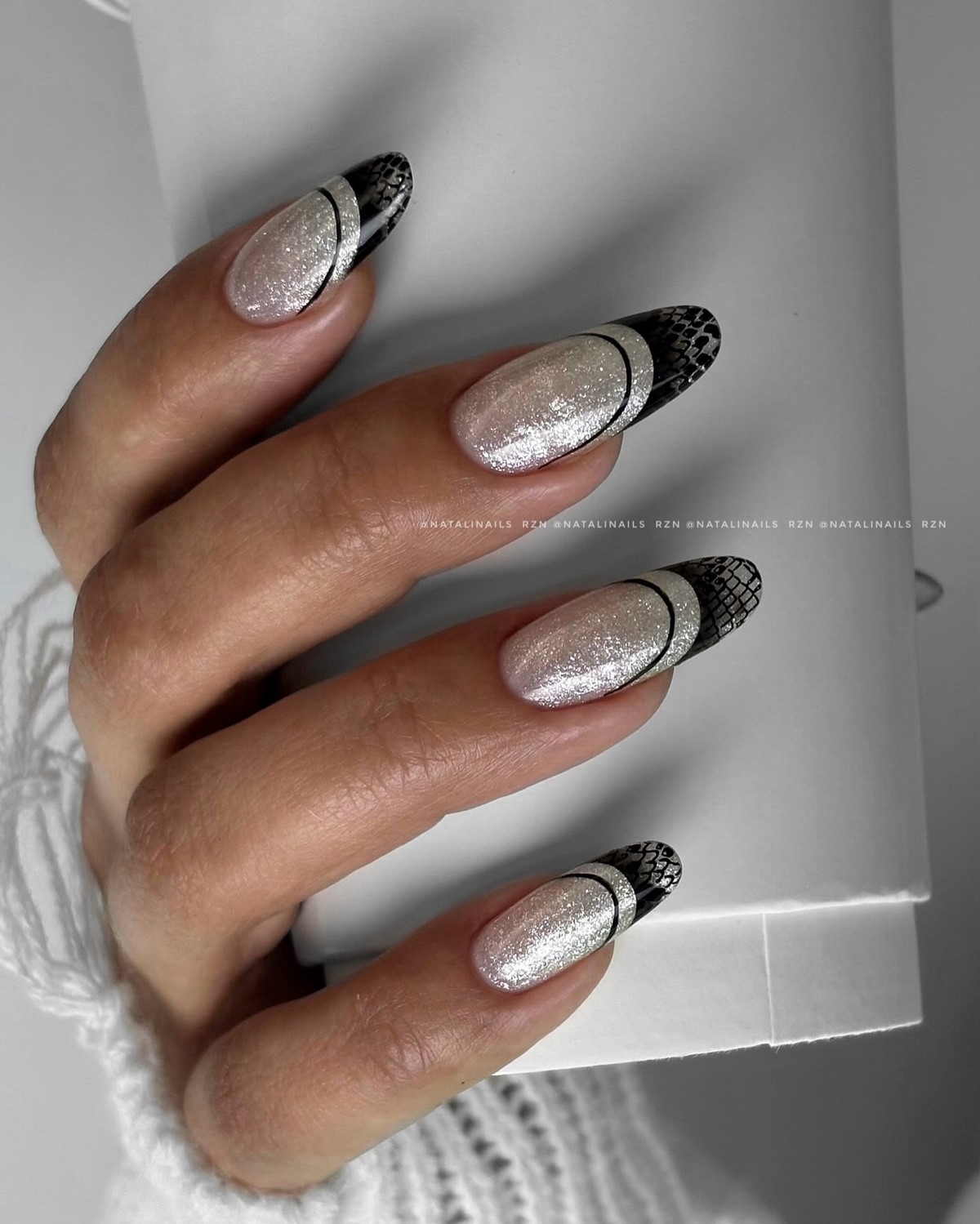 Френч з блискучими акцентами — один з головних хітів сезону. «Посмішка» може бути повністю виконана з глітера або доповнена блискучою пудрою. Такий манікюр освіжає образ і підходить як для вечірки, так і для повсякденного стилю, якщо використовувати приглушені відтінки.