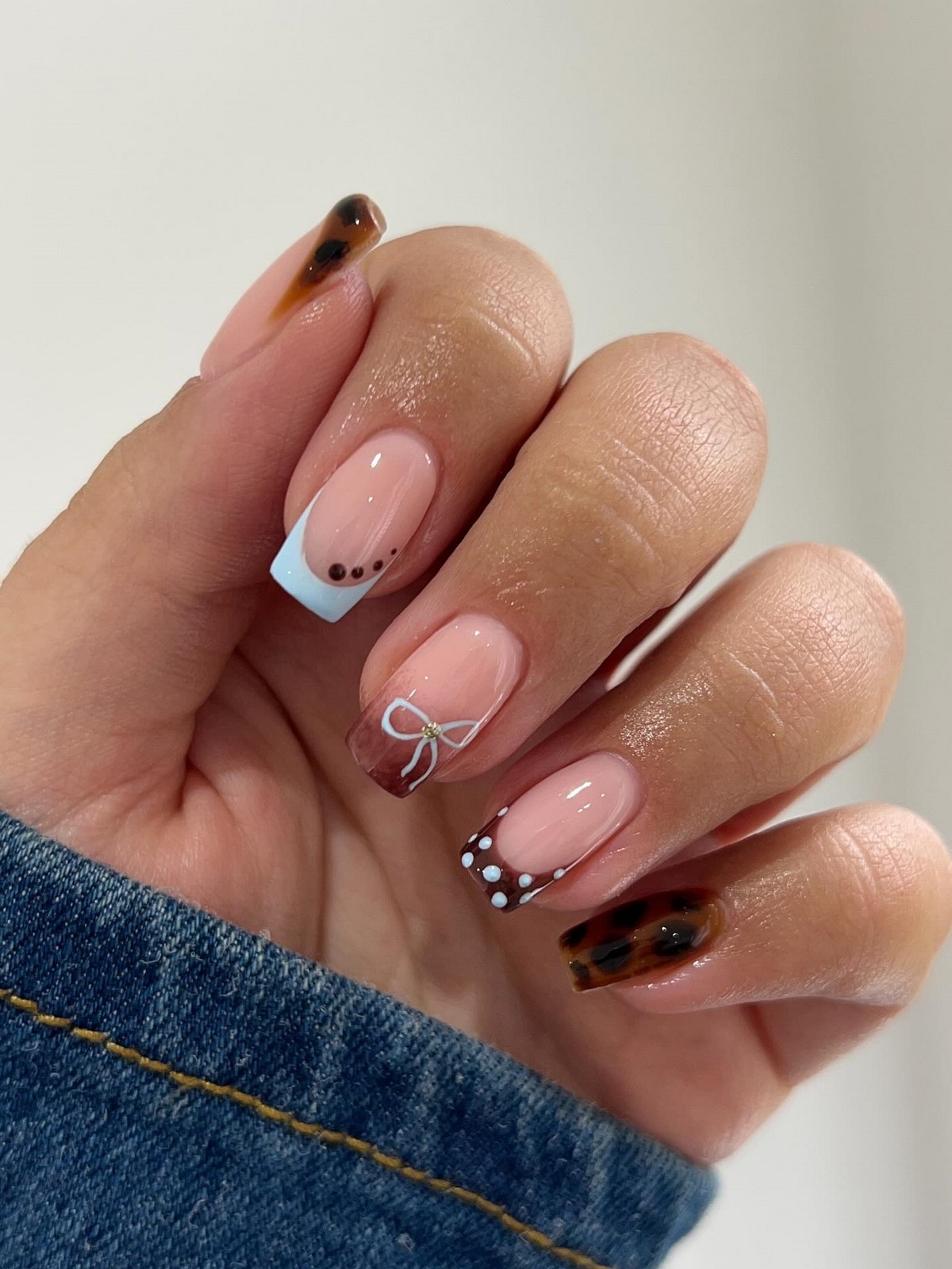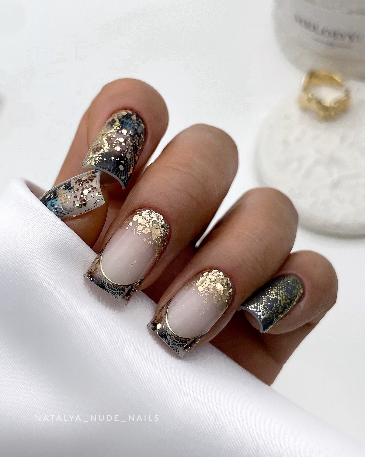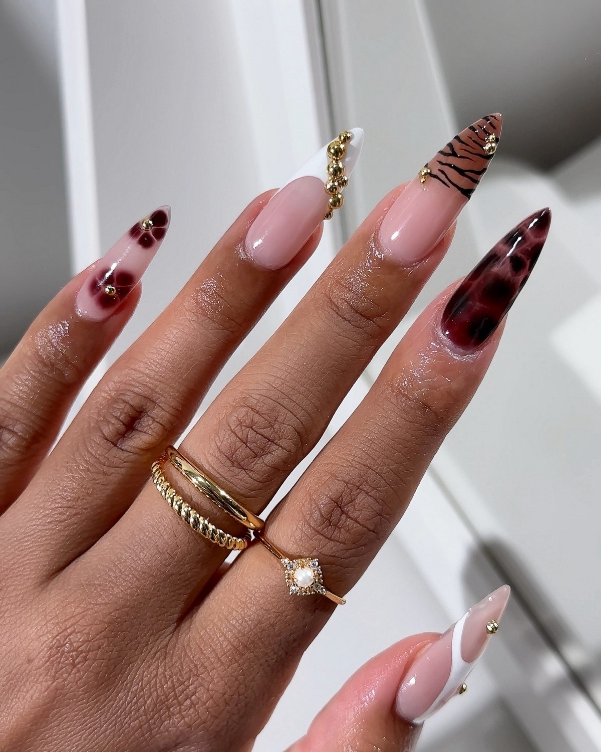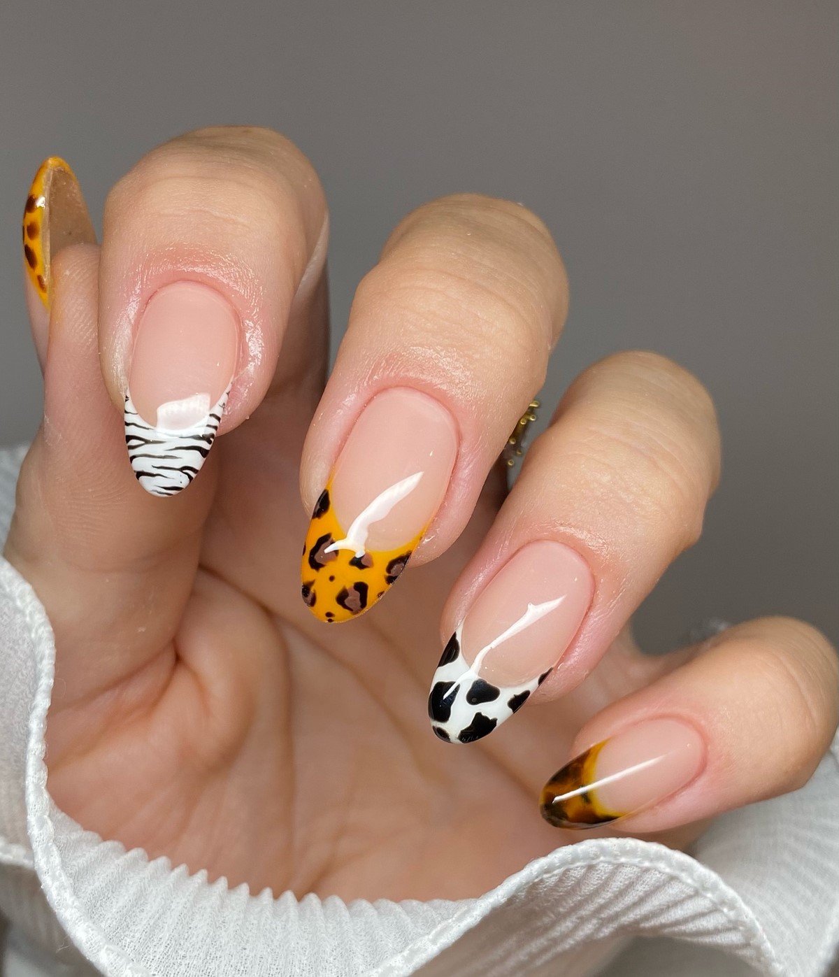 Тваринні візерунки знову в центрі уваги. Восени 2025 модниці будуть носити френч з тигровими, зебровими, леопардовими і навіть зміїними мотивами. Кожен ніготь можна оформити в різній стилістиці, що робить дизайн ще більш оригінальним. Такий варіант ідеально підійде тим, хто любить сміливі і виразні рішення.
