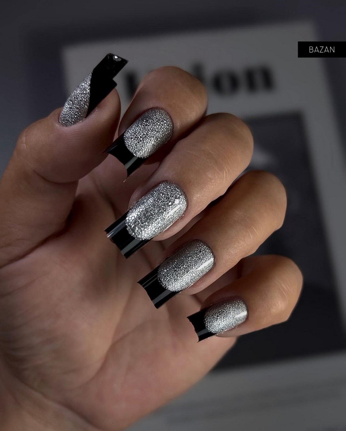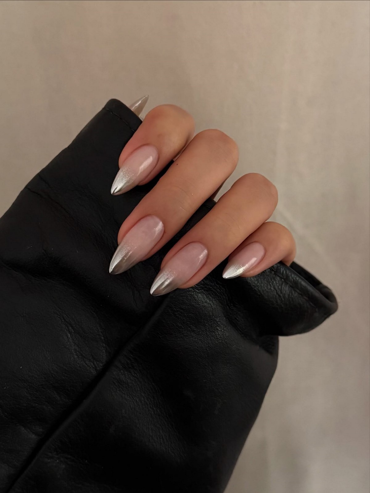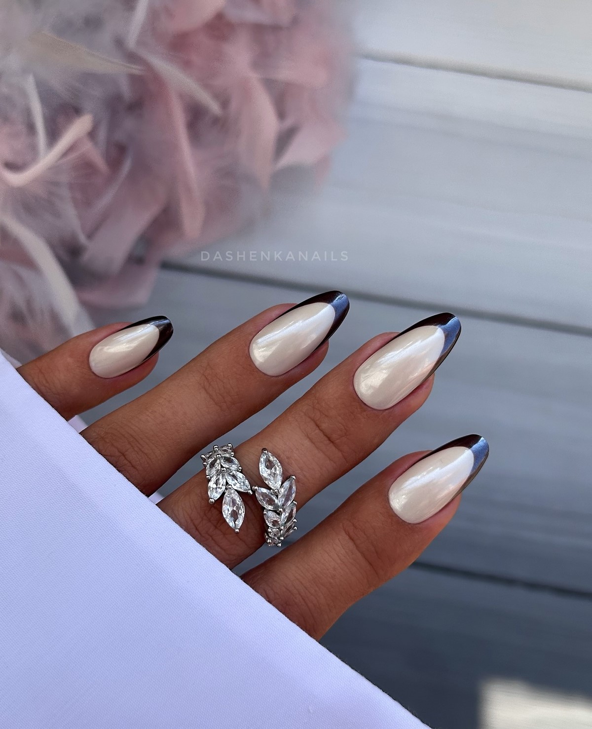 Дзеркальний блиск — фаворит сезону. Френч з металевим ефектом в сріблястих або бронзових відтінках виглядає особливо сучасно. Такий дизайн ідеально підкреслить осінні аутфіти в стилі casual і grunge, додаючи образу сміливості.