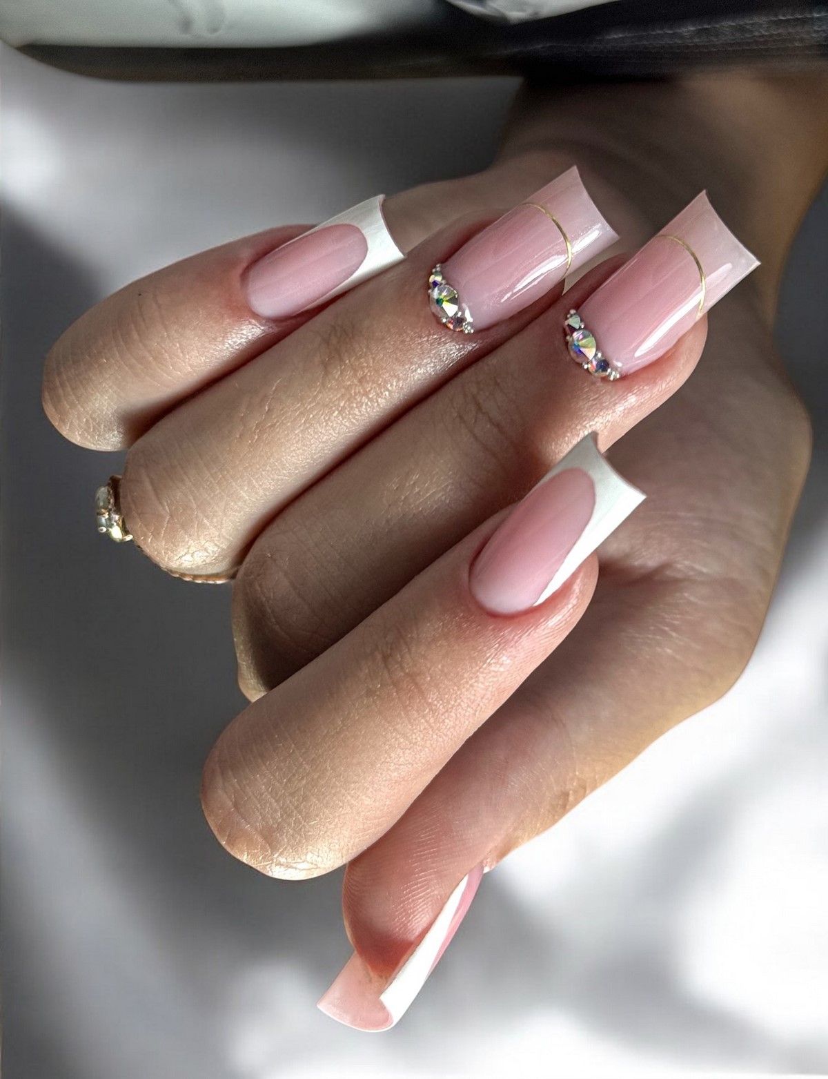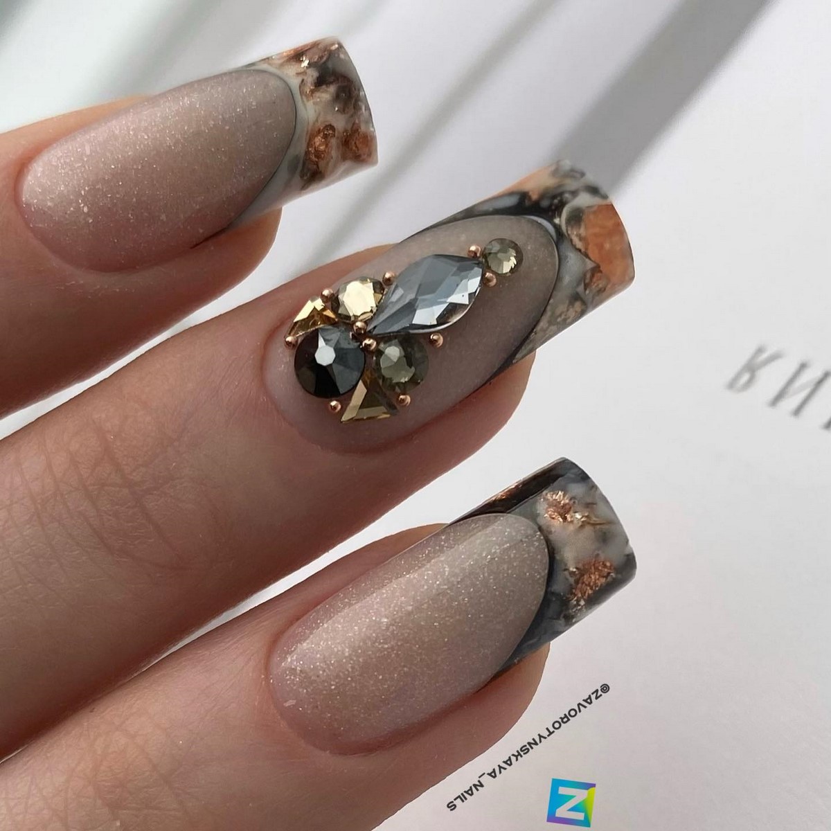 Камені в манікюрі продовжують залишатися в моді, але в осінньому сезоні вони стають більш делікатними. Френч можна прикрасити мінімалістичними стразами в куточку нігтя або тонкою доріжкою вздовж лінії «посмішки». Такий варіант додає манікюру святковості, не перевантажуючи його.