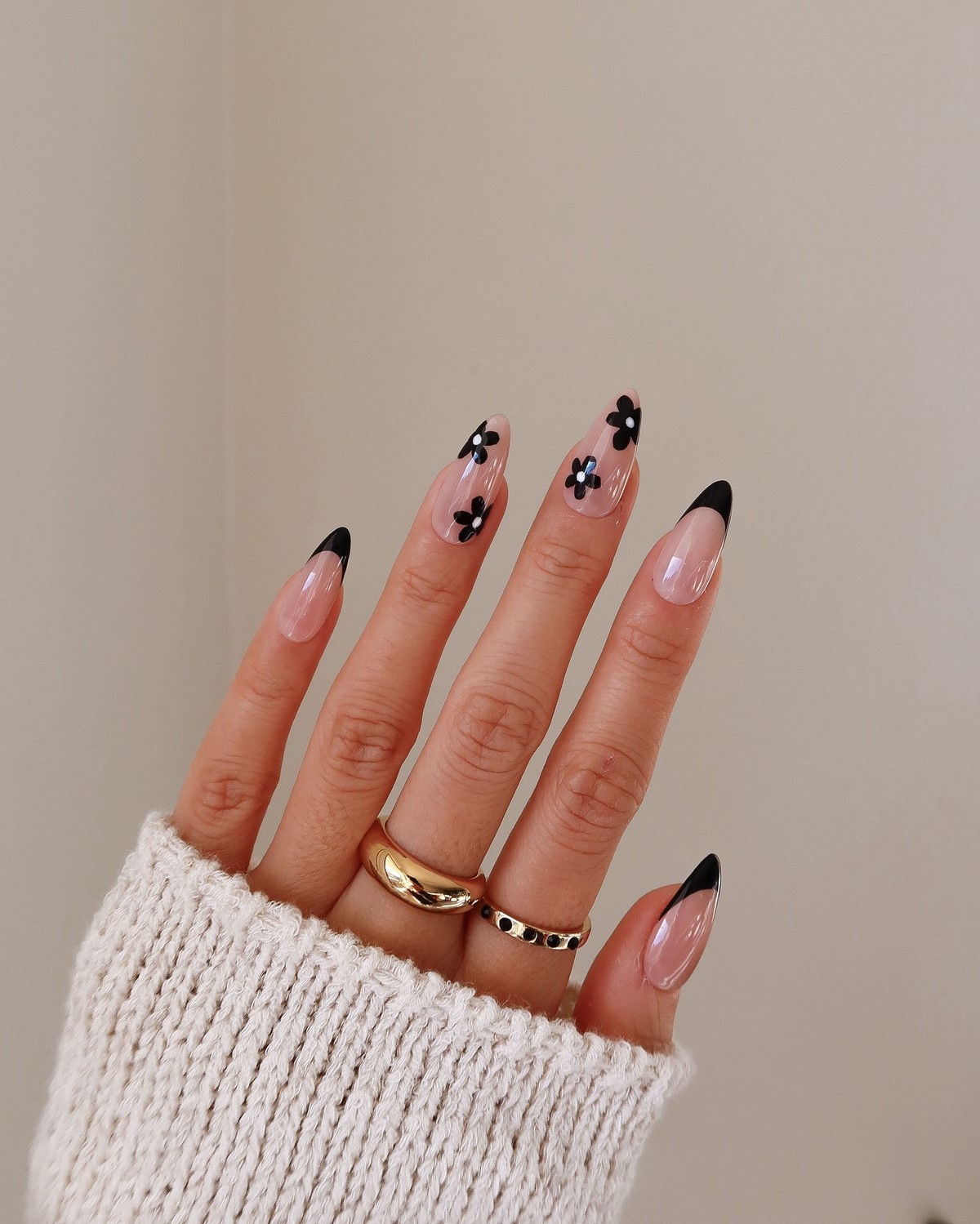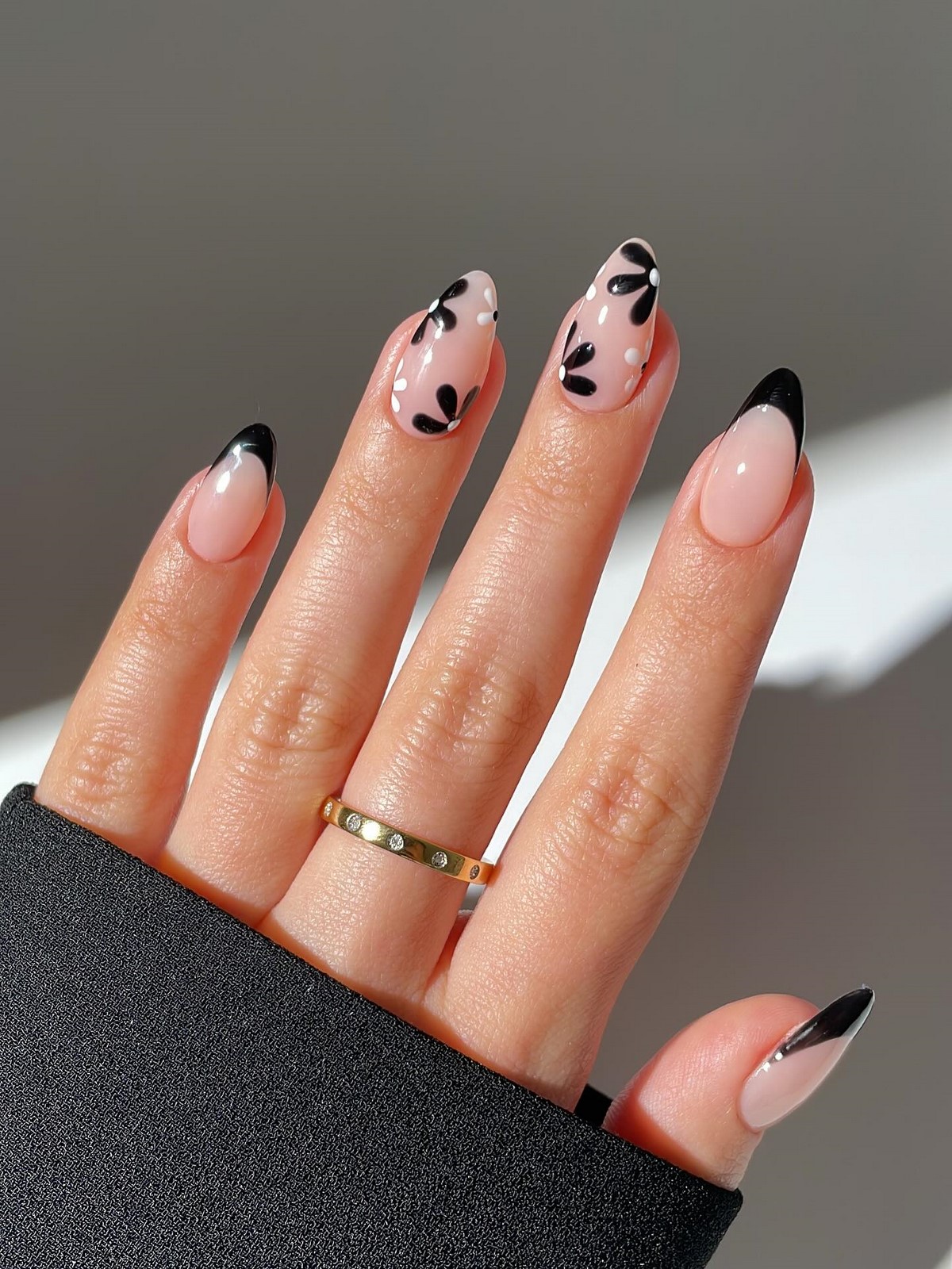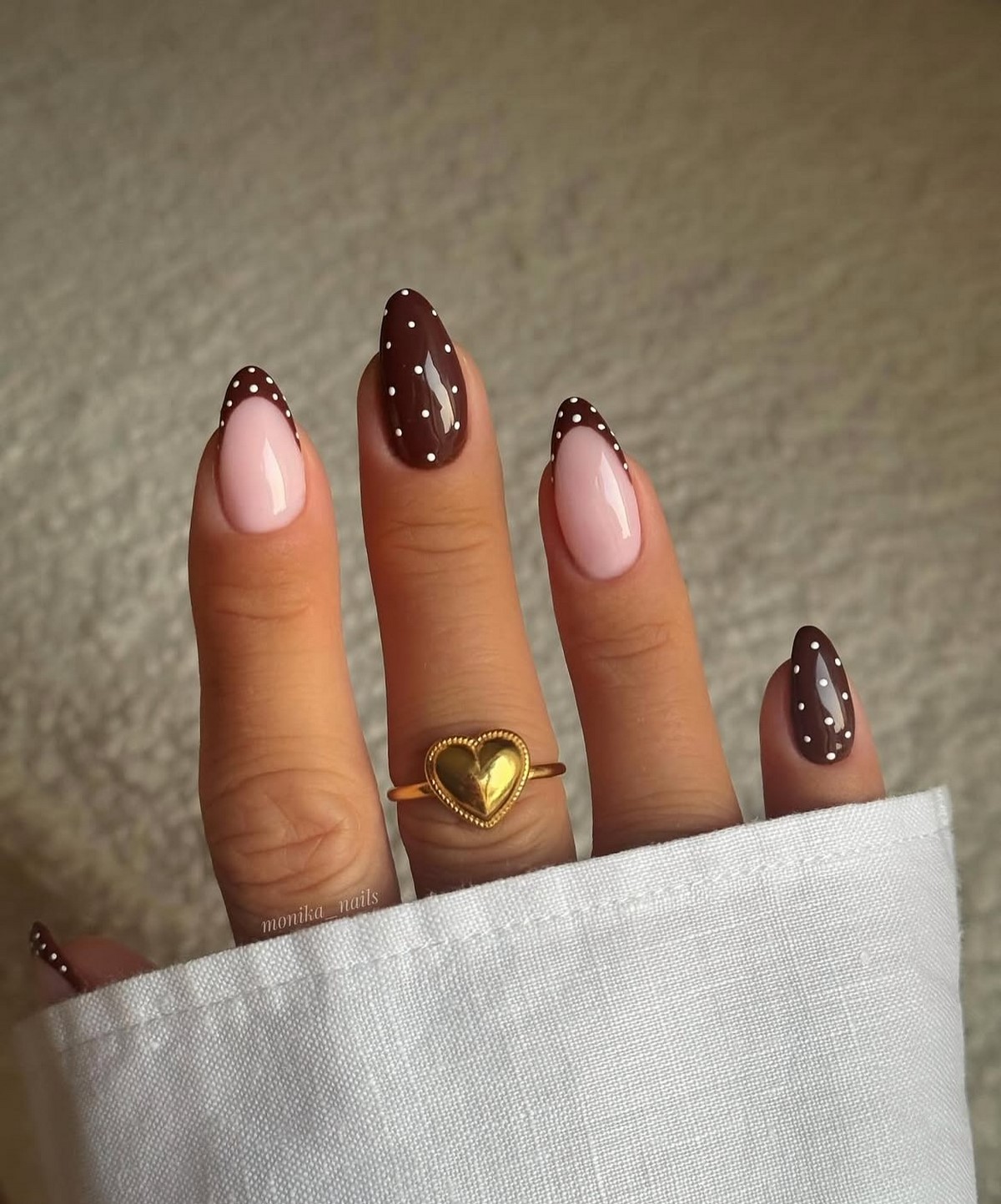 Френч з гороховими акцентами — playful-тренд, який додає образу трохи ретро-настрою. Горох може бути як дрібним і акуратним, так і більшим, створюючи акцент на одному-двох нігтях. Особливо ефектно виглядає поєднання чорного гороху з нюдовим френчем.