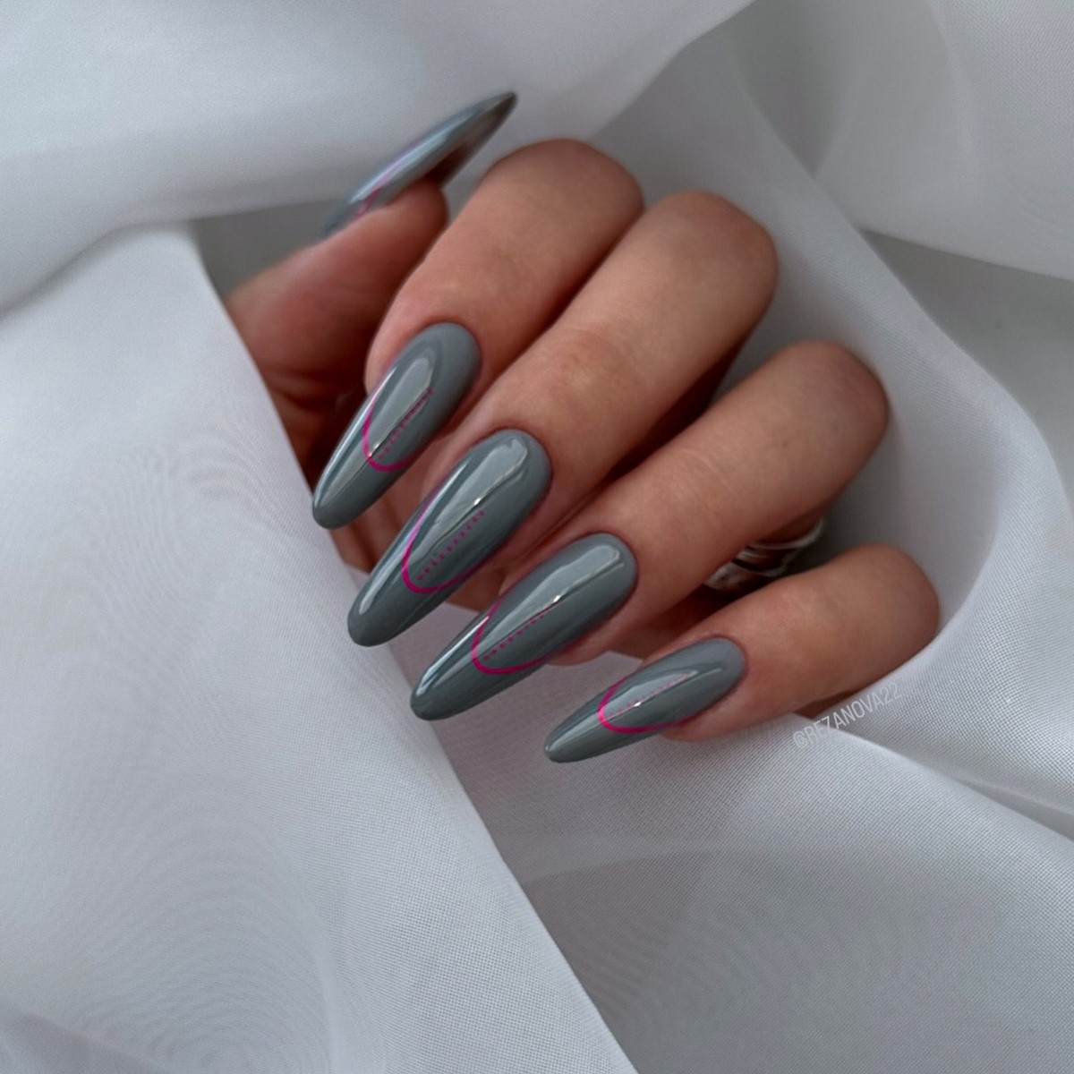Мінімалізм в манікюрі стає все популярнішим. Тонка лінія «посмішки» в яскравому кольорі на спокійній базі виглядає свіжо і стильно. У сезоні осінь 2025 модниці будуть вибирати комбінацію темно-сірого з акцентом фуксії — елегантне, але виразне рішення для тих, хто цінує лаконічність.