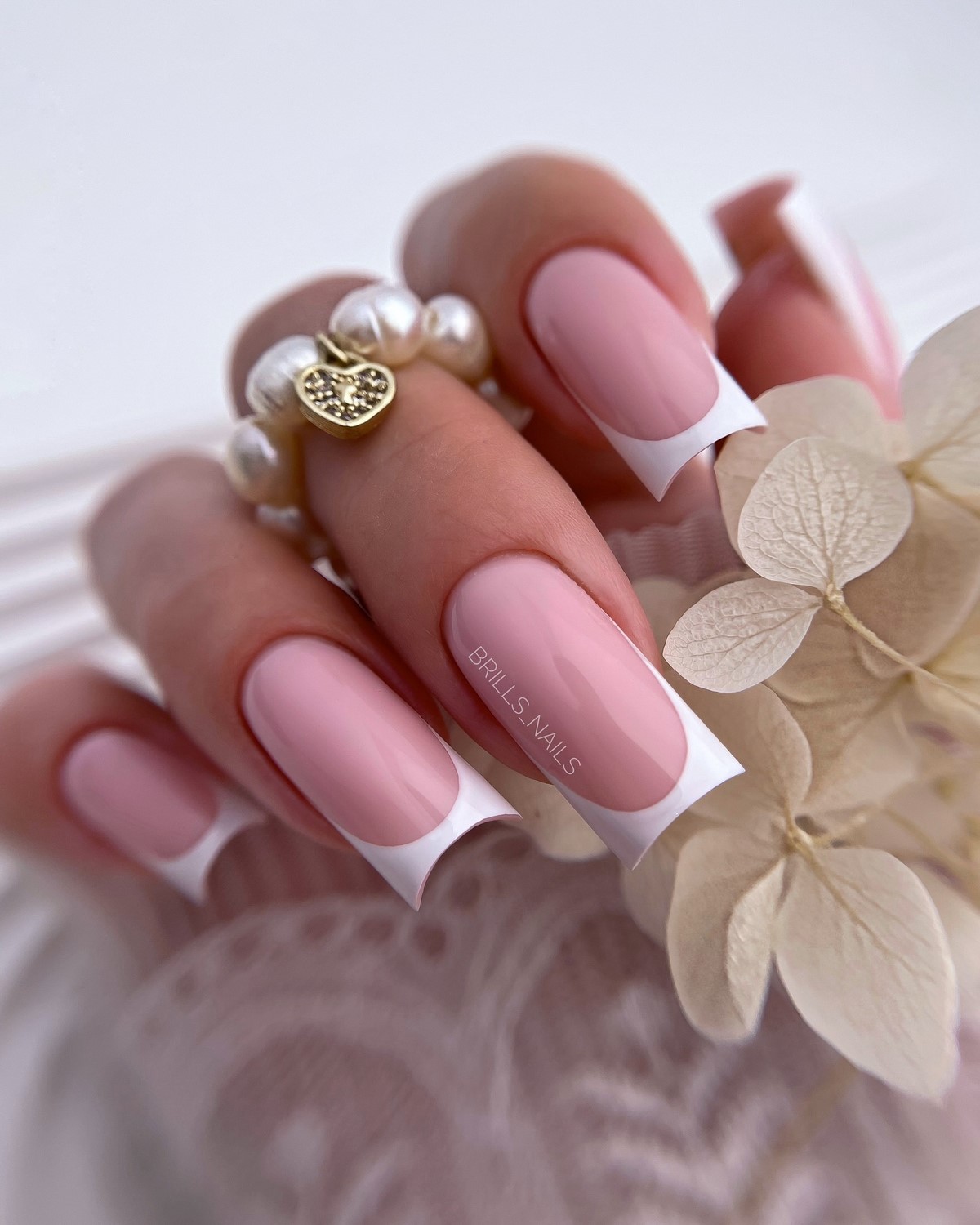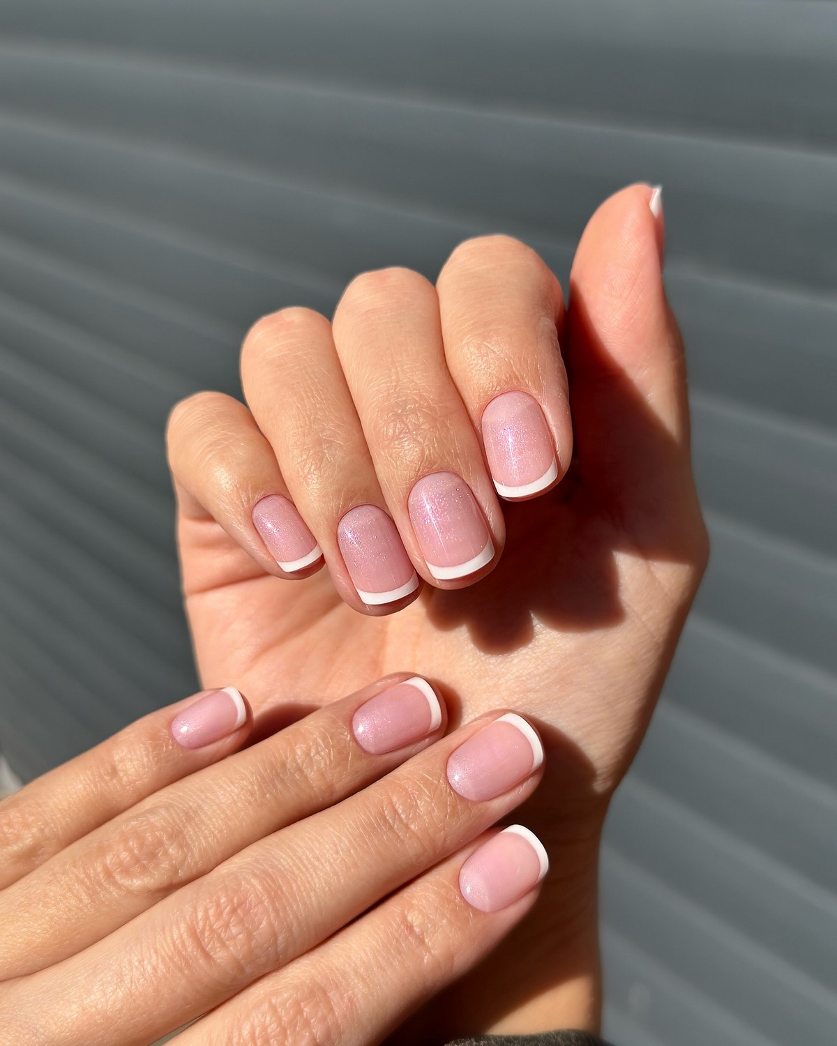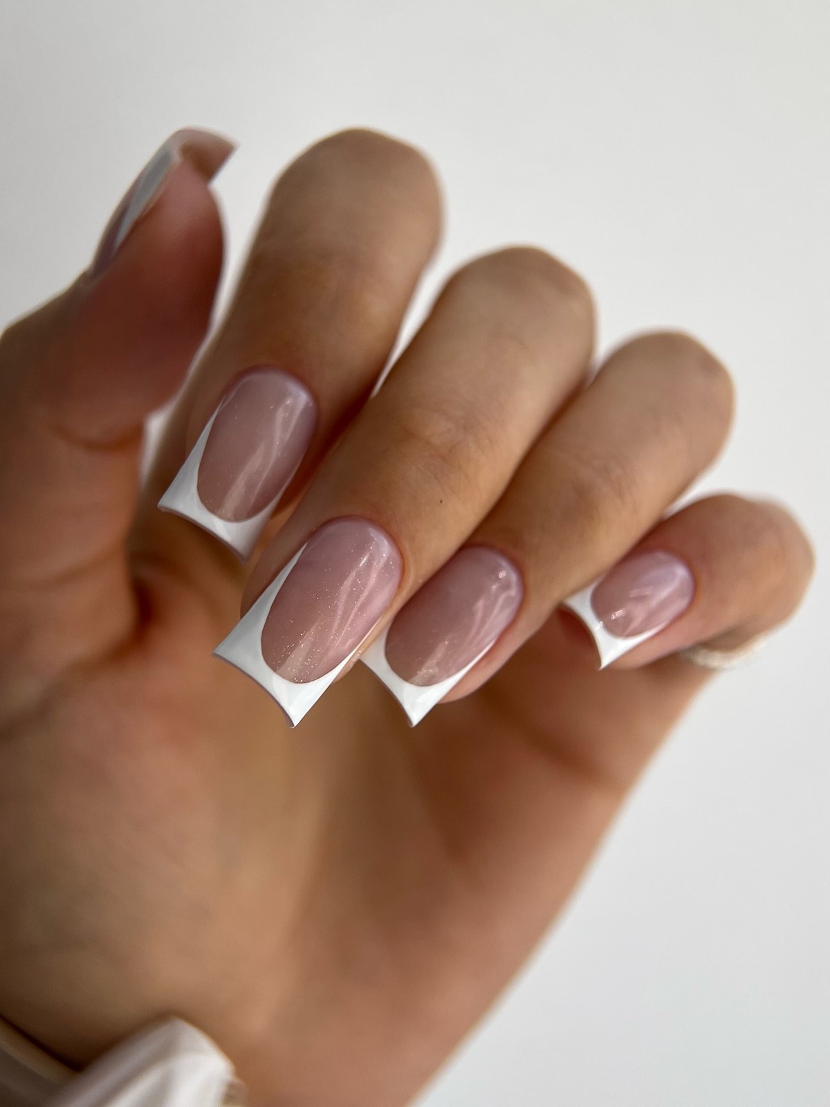 Перлинне сяйво на нігтях надає м’якості та аристократичності. В осінньому френчі 2025 перлова втирка частіше використовується на нюдовій базі з акцентом на «посмішку». Такий манікюр виглядає дорого і елегантно, ідеально підходить для офісних і урочистих луків.