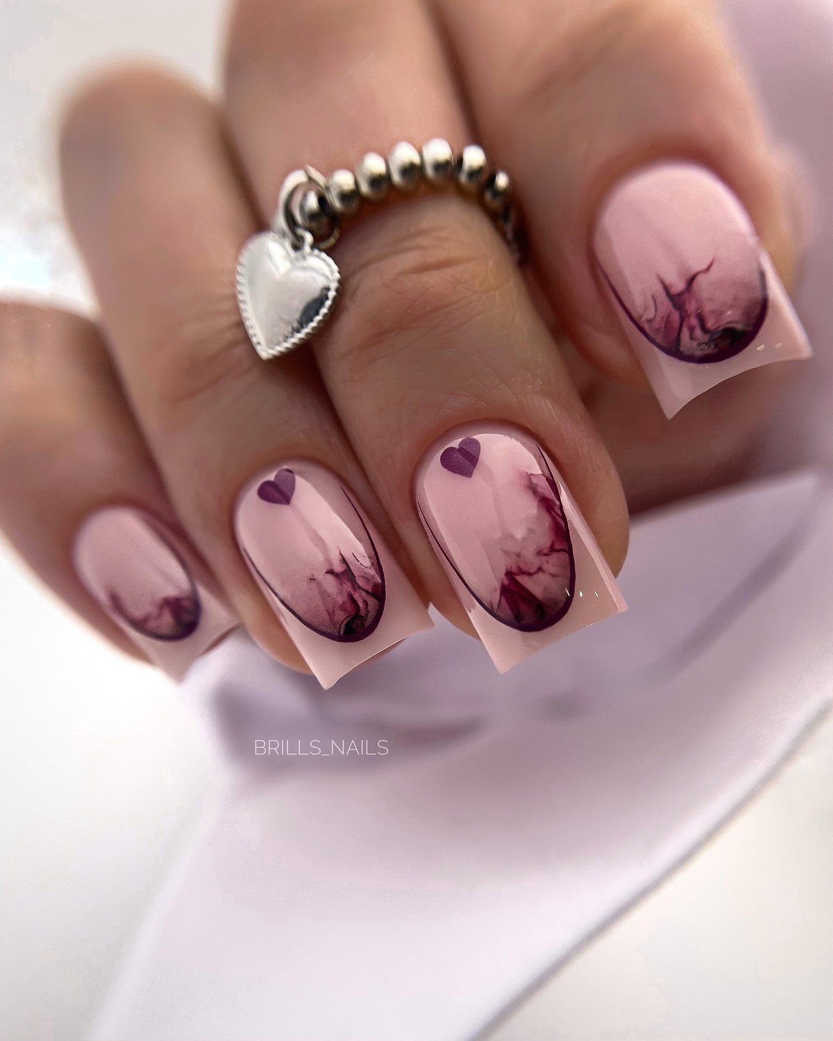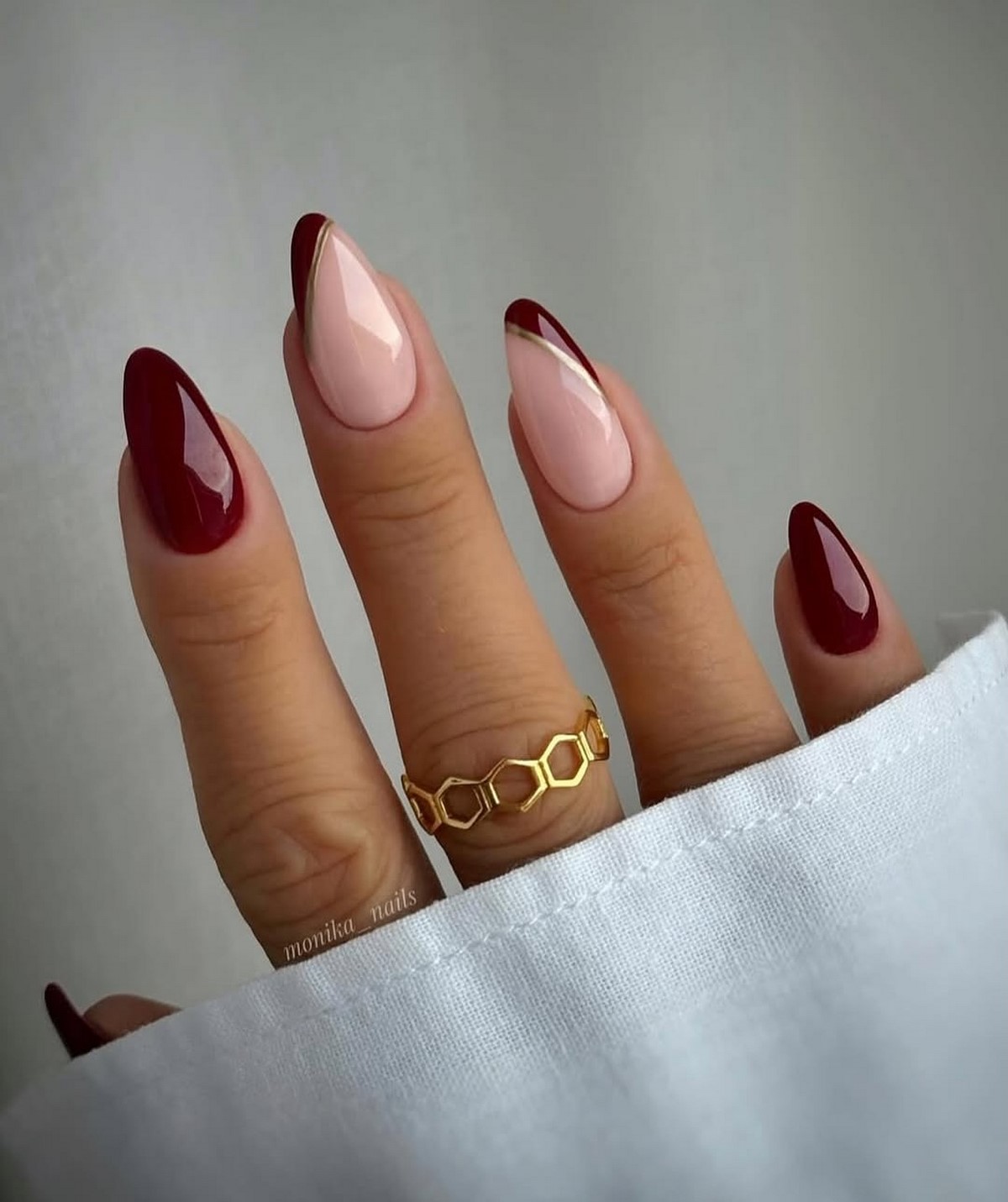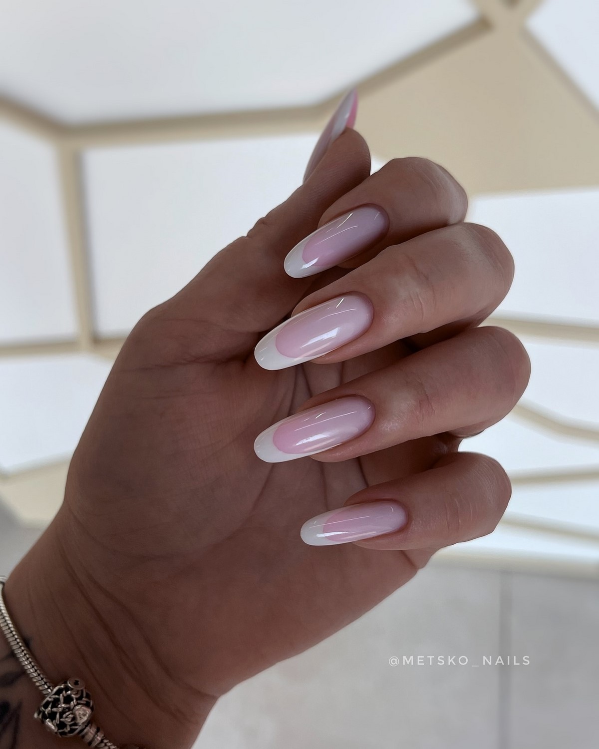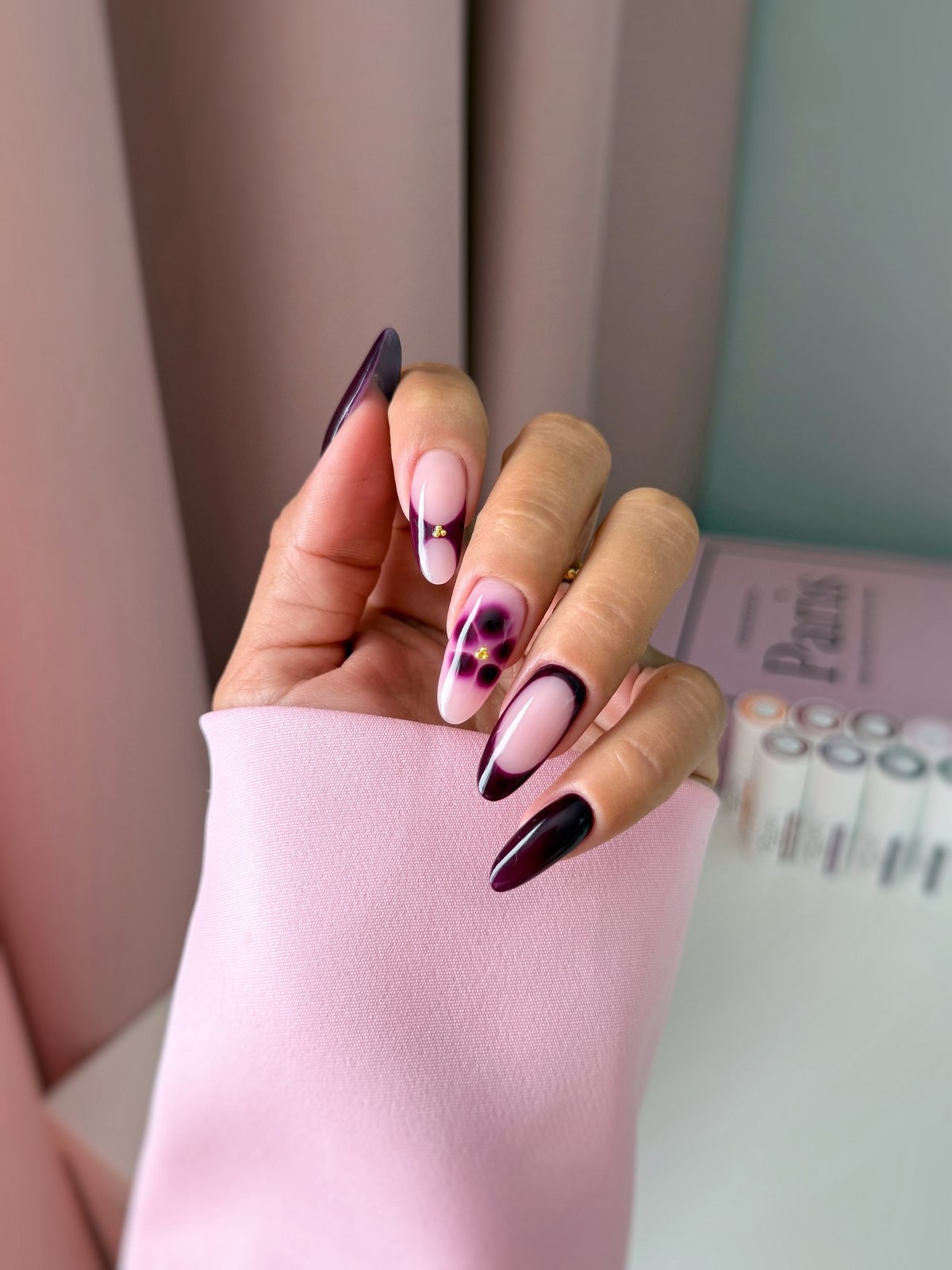 Плавні переходи відтінків в зоні «посмішки» надають нігтям м’якість і глибину. Особливо красиво восени виглядають градієнти в бордових, кавових, золотистих і сливових тонах. Такий дизайн нагадує гру осінніх фарб і підійде як для повсякденного образу, так і для святкового заходу.