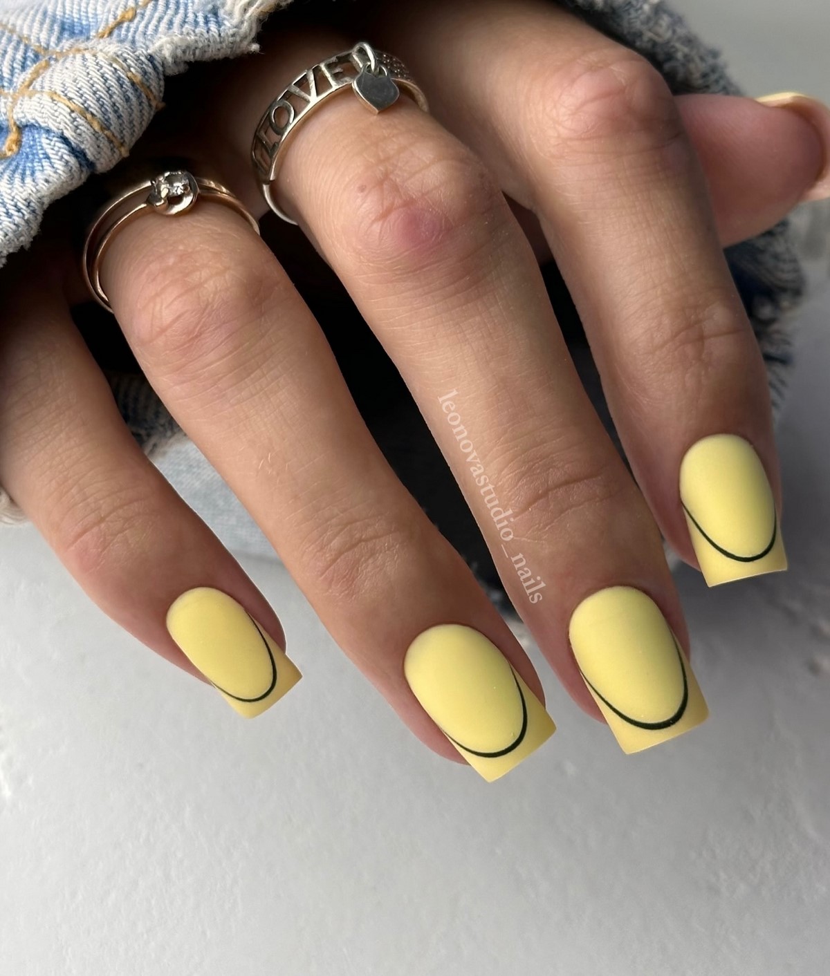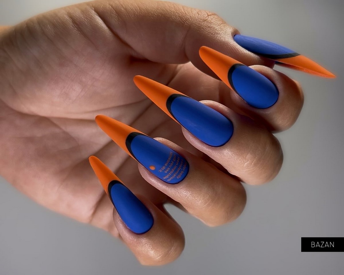 Матове покриття робить френч особливо стильним і витонченим. Восени 2025 актуальні глибокі матові відтінки — винний, графітовий, синій сапфір. У поєднанні з тонкою яскравою лінією «посмішки» матовий френч виглядає незвично і елегантно.