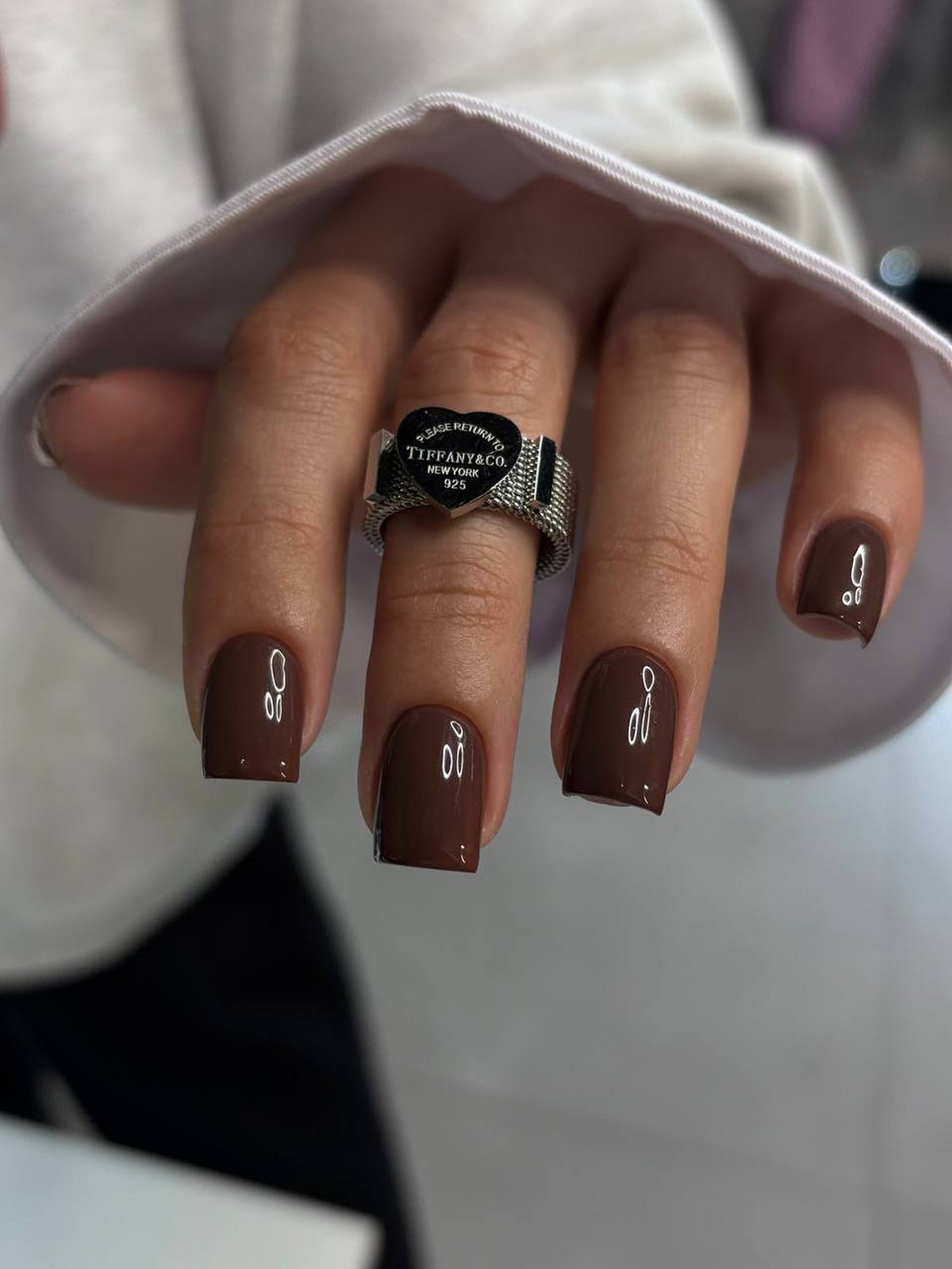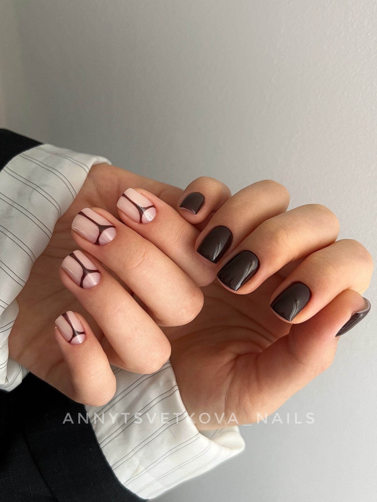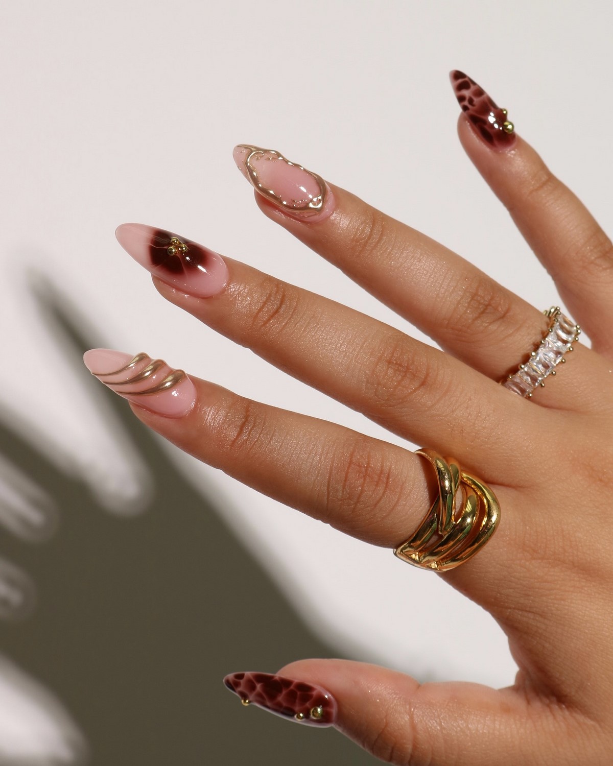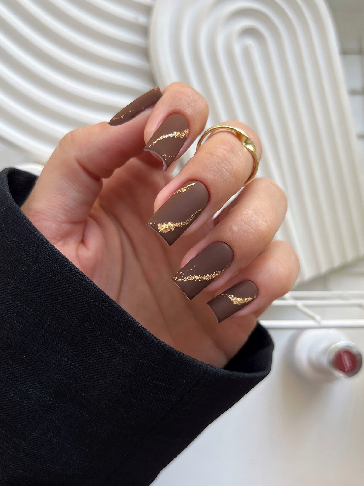 Розкішне поєднання матового шоколадного покриття з делікатними золотими акцентами стає хітом сезону. Золота поталь наноситься фрагментарно, створюючи ефект дорогоцінного металу на оксамитовій поверхні. Такий дизайн ідеально підходить для вечірніх образів і особливих випадків, підкреслюючи вишуканість і елегантність.