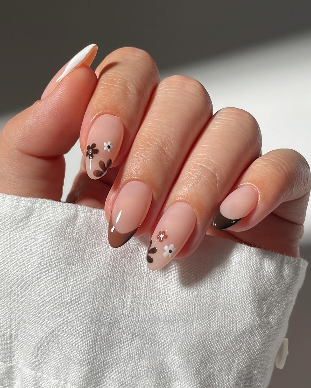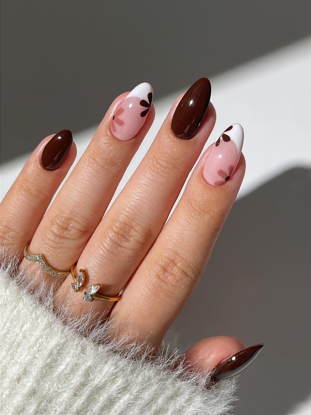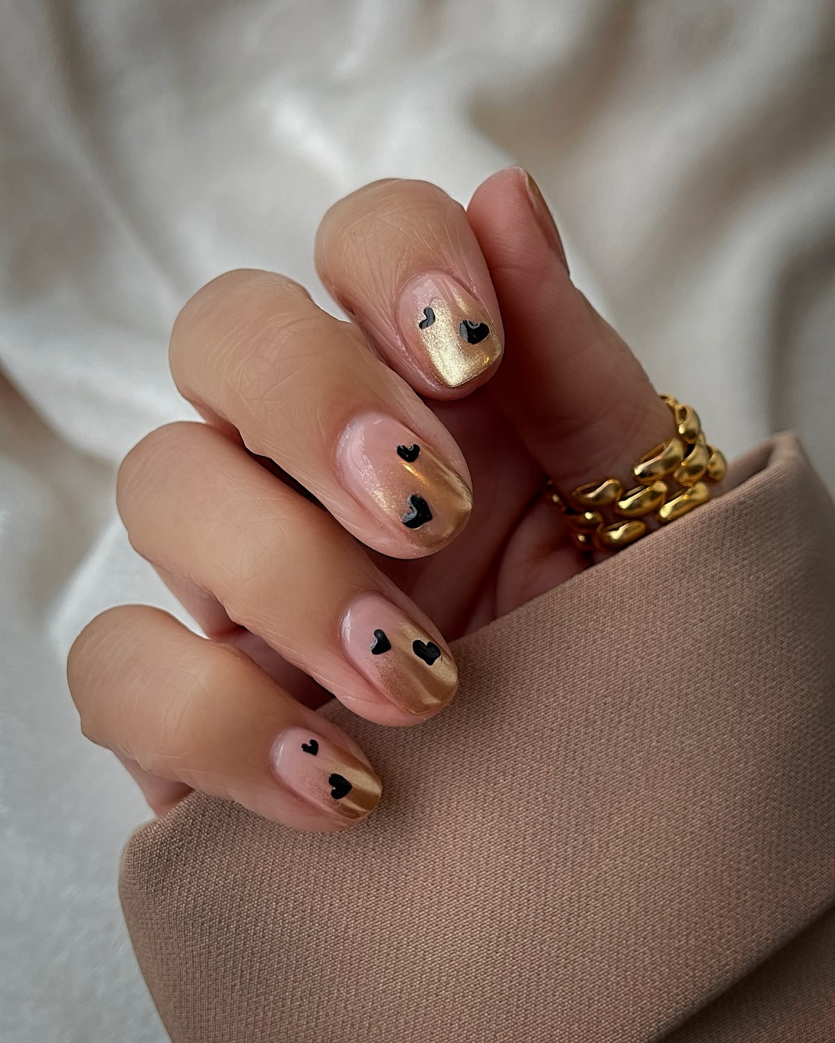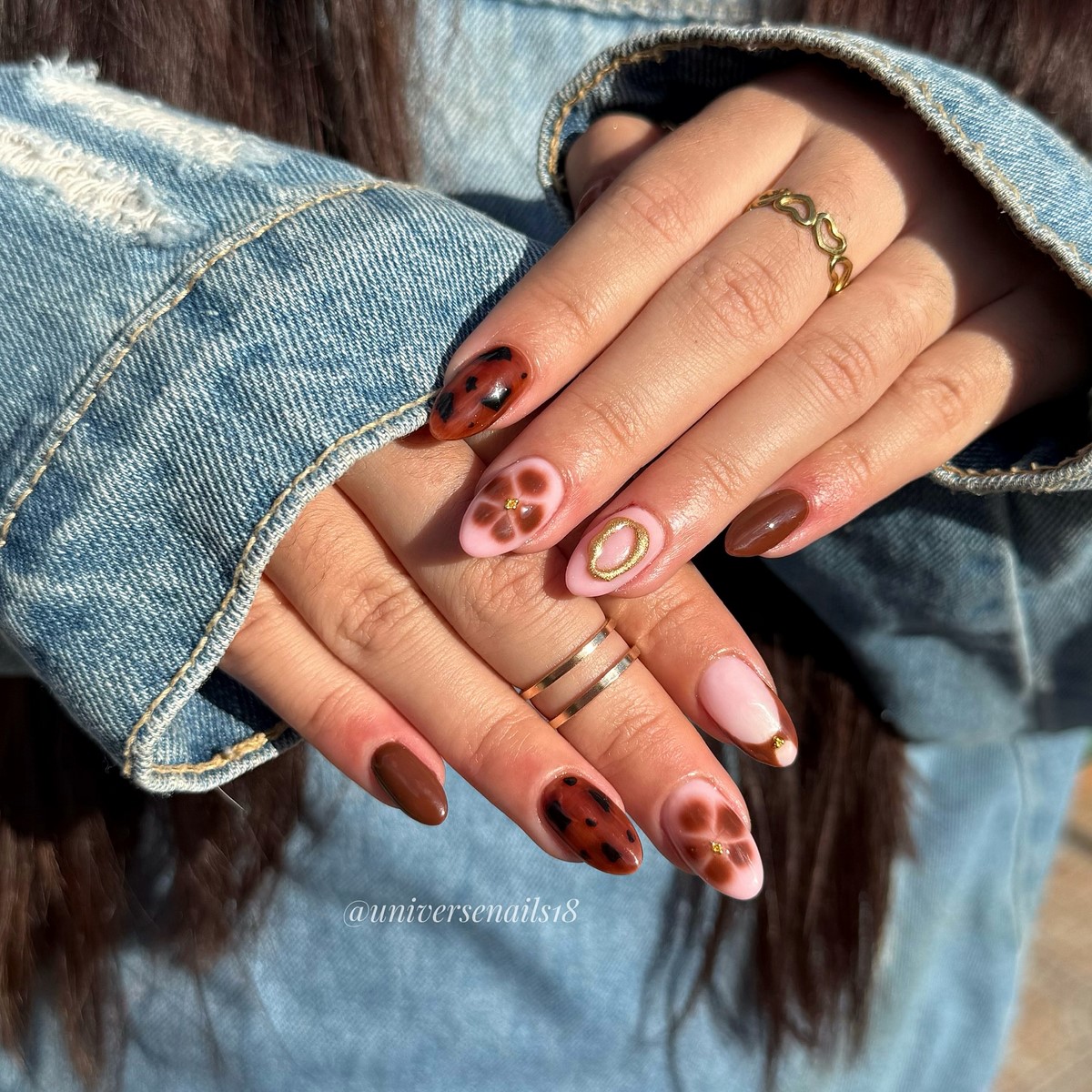 Розкішне поєднання матового шоколадного покриття з делікатними золотими акцентами стає хітом сезону. Золота поталь наноситься фрагментарно, створюючи ефект дорогоцінного металу на оксамитовій поверхні. Такий дизайн ідеально підходить для вечірніх образів і особливих випадків, підкреслюючи вишуканість і елегантність.
