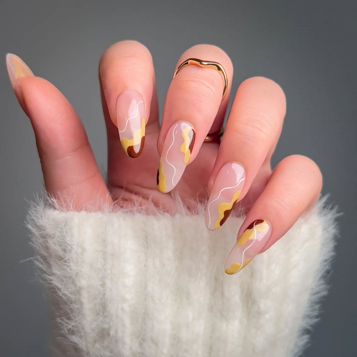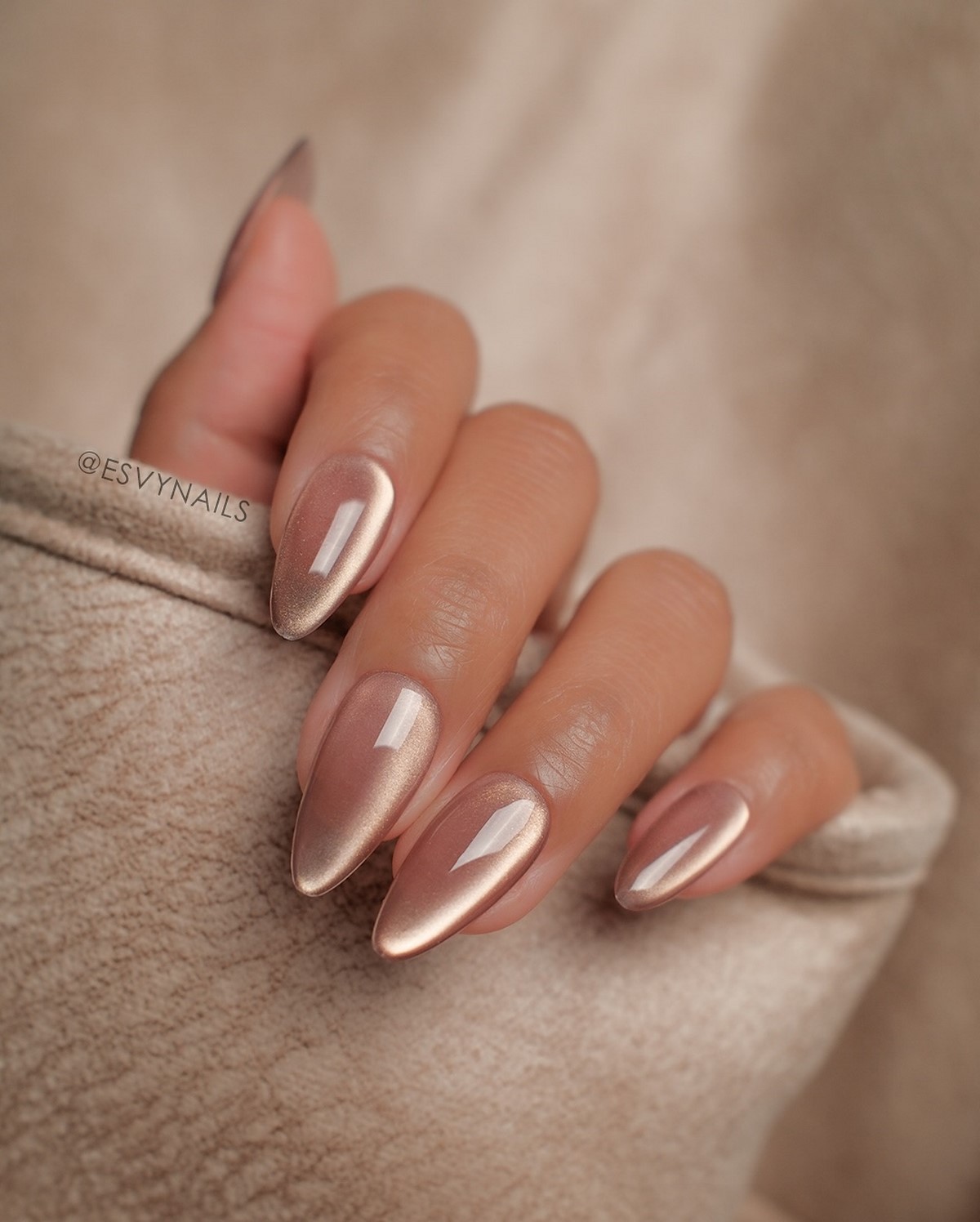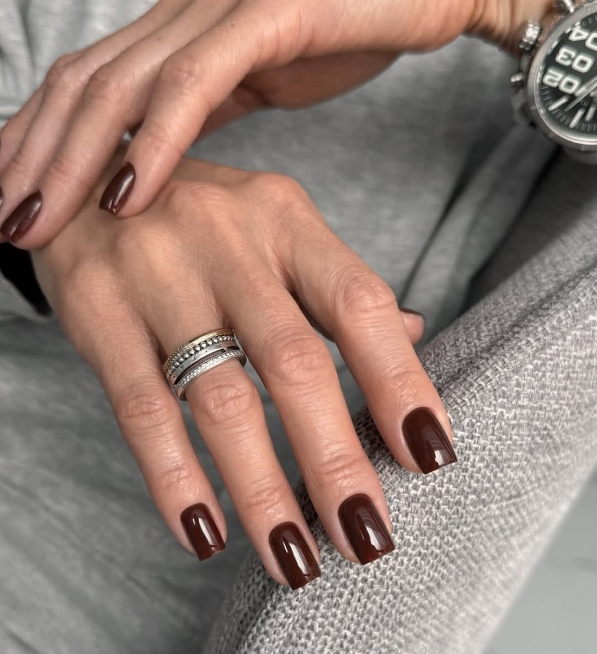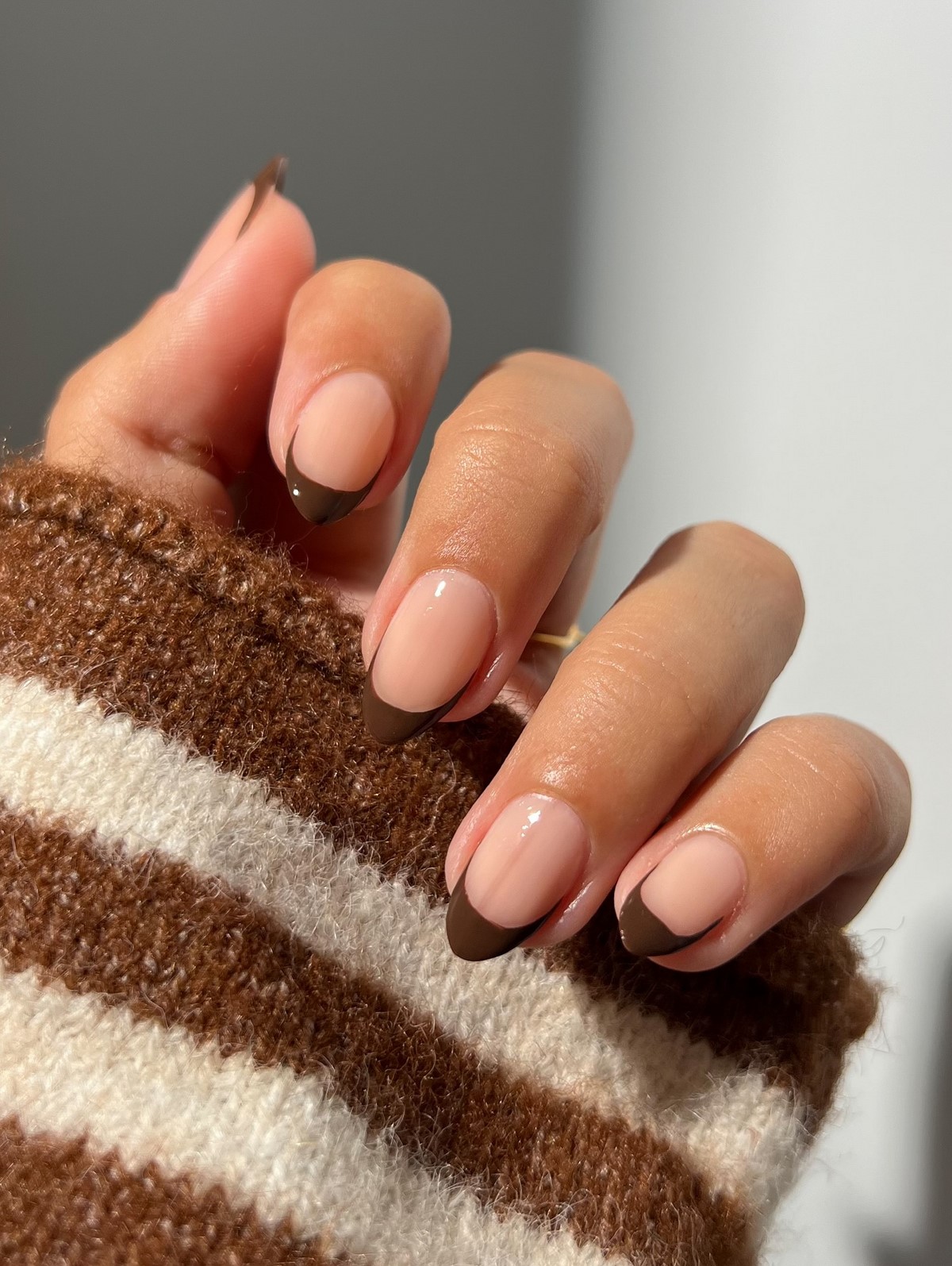 Розкішне поєднання матового шоколадного покриття з делікатними золотими акцентами стає хітом сезону. Золота поталь наноситься фрагментарно, створюючи ефект дорогоцінного металу на оксамитовій поверхні. Такий дизайн ідеально підходить для вечірніх образів і особливих випадків, підкреслюючи вишуканість і елегантність.