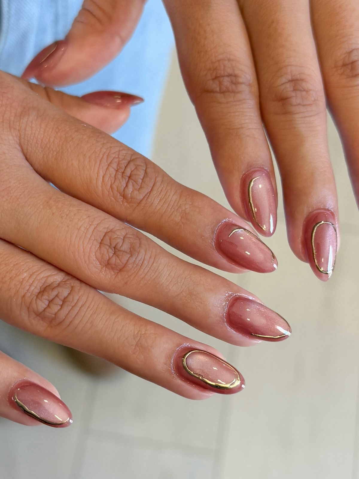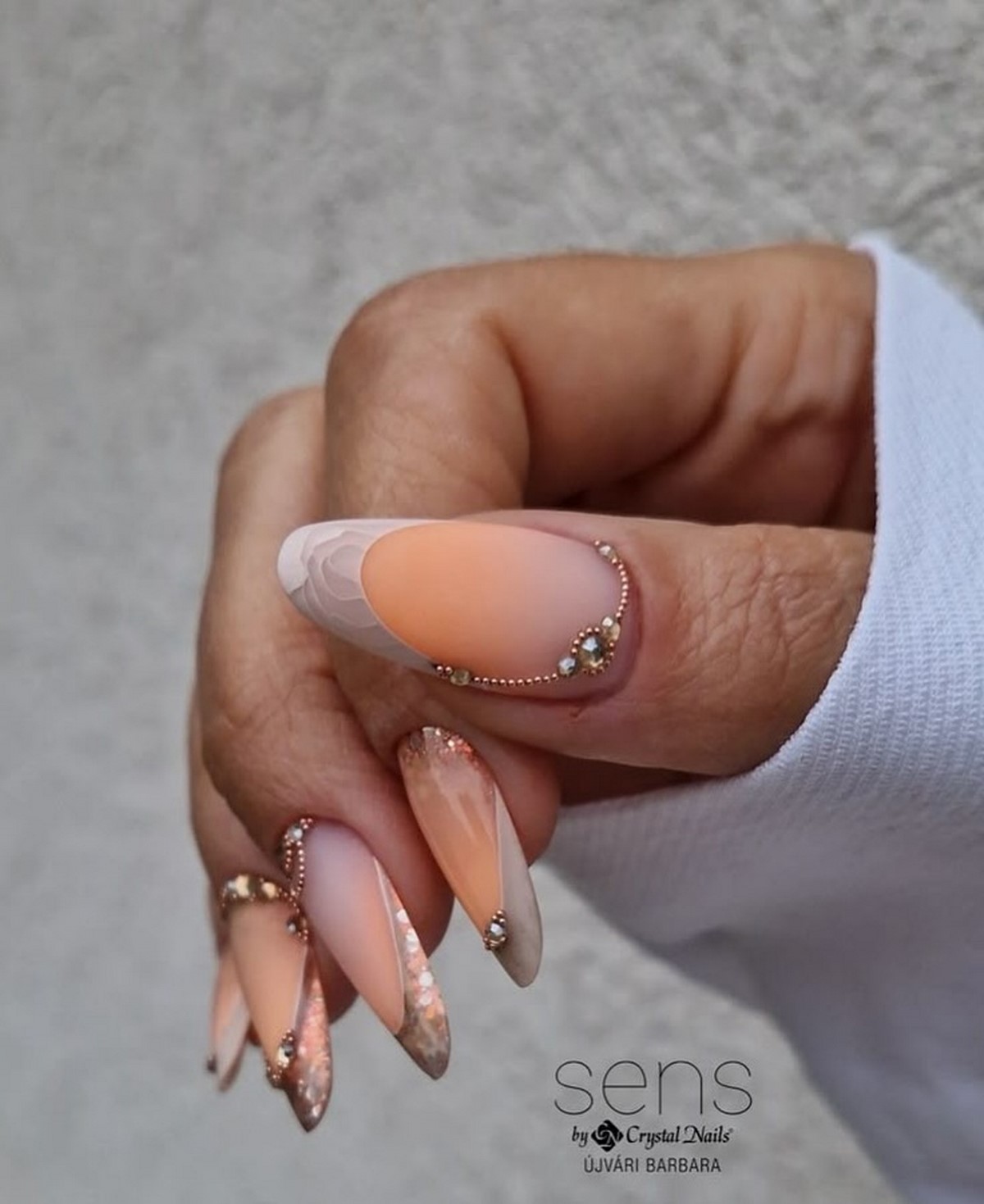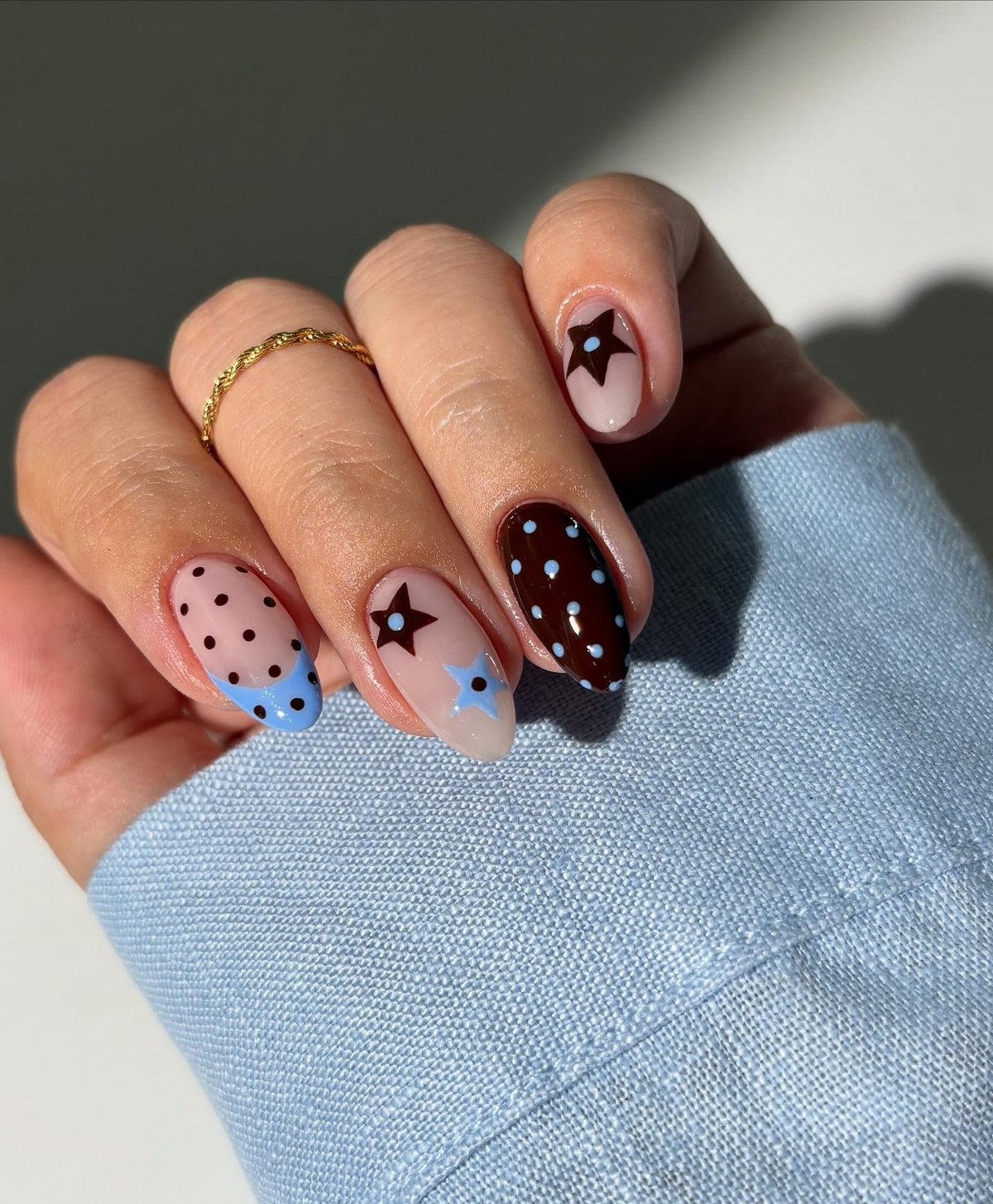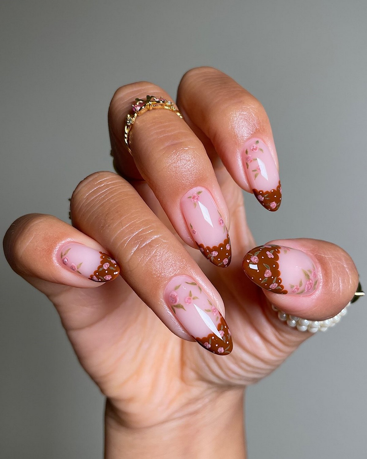 Розкішне поєднання матового шоколадного покриття з делікатними золотими акцентами стає хітом сезону. Золота поталь наноситься фрагментарно, створюючи ефект дорогоцінного металу на оксамитовій поверхні. Такий дизайн ідеально підходить для вечірніх образів і особливих випадків, підкреслюючи вишуканість і елегантність.