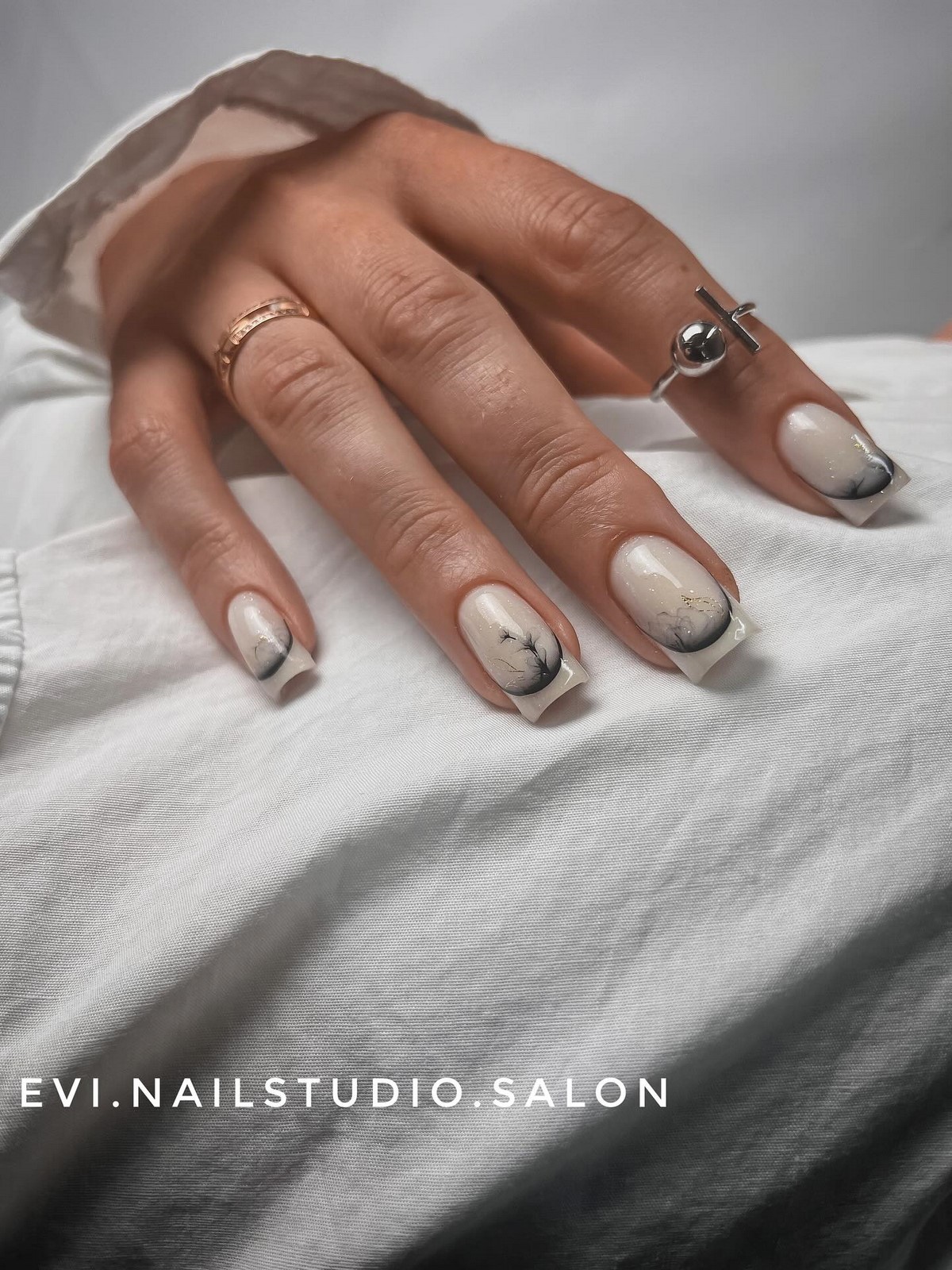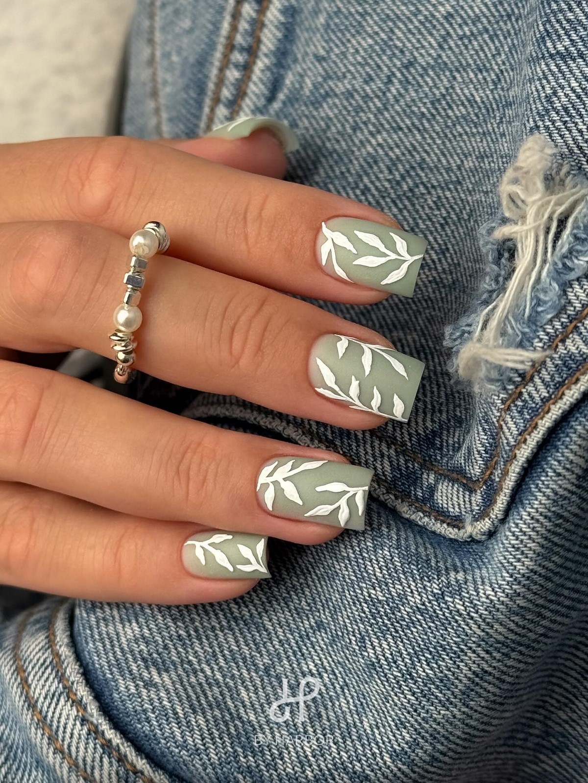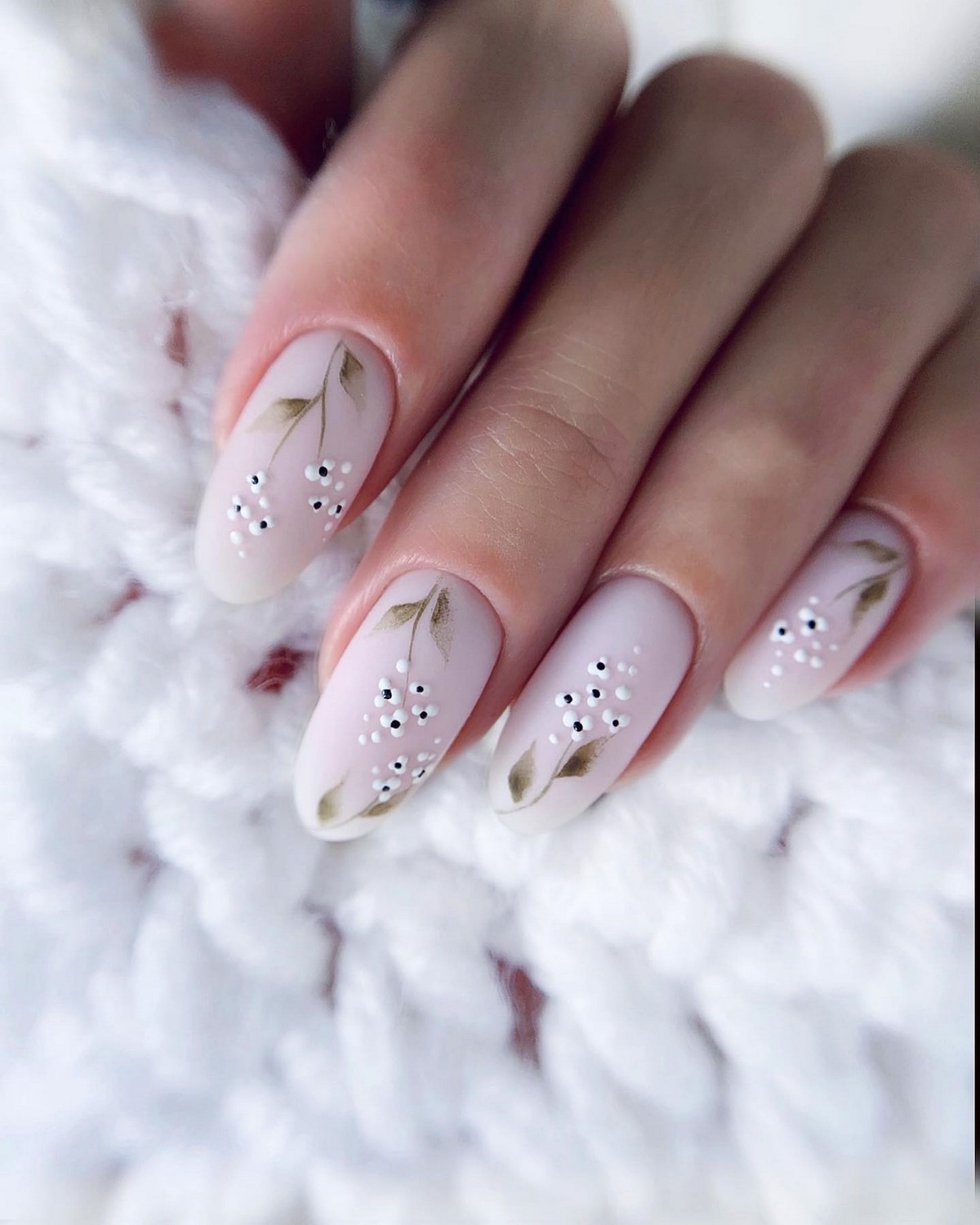 Ніжні мікроквіти на молочно-матовій основі створюють романтичний і витончений образ. Гілочки промальовуються тонкими лініями, імітуючи природні вигини рослин. Цей дизайн вимагає високої майстерності та використання якісних пензлів для деталізації, але результат виправдовує докладені зусилля.