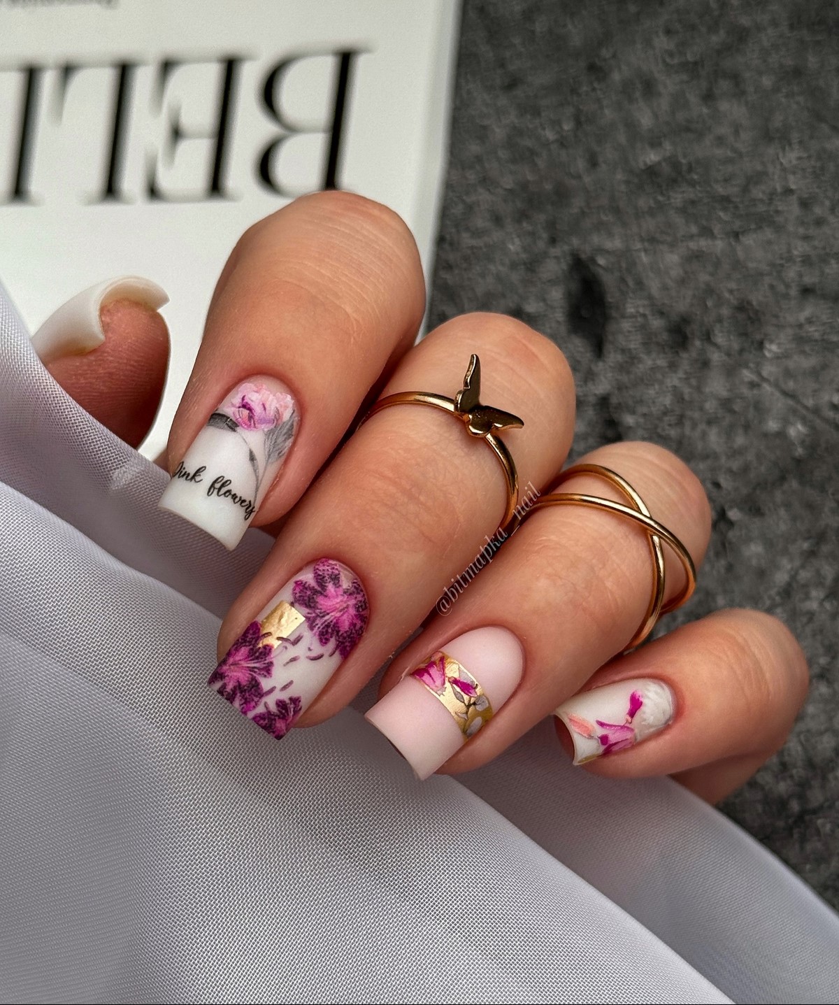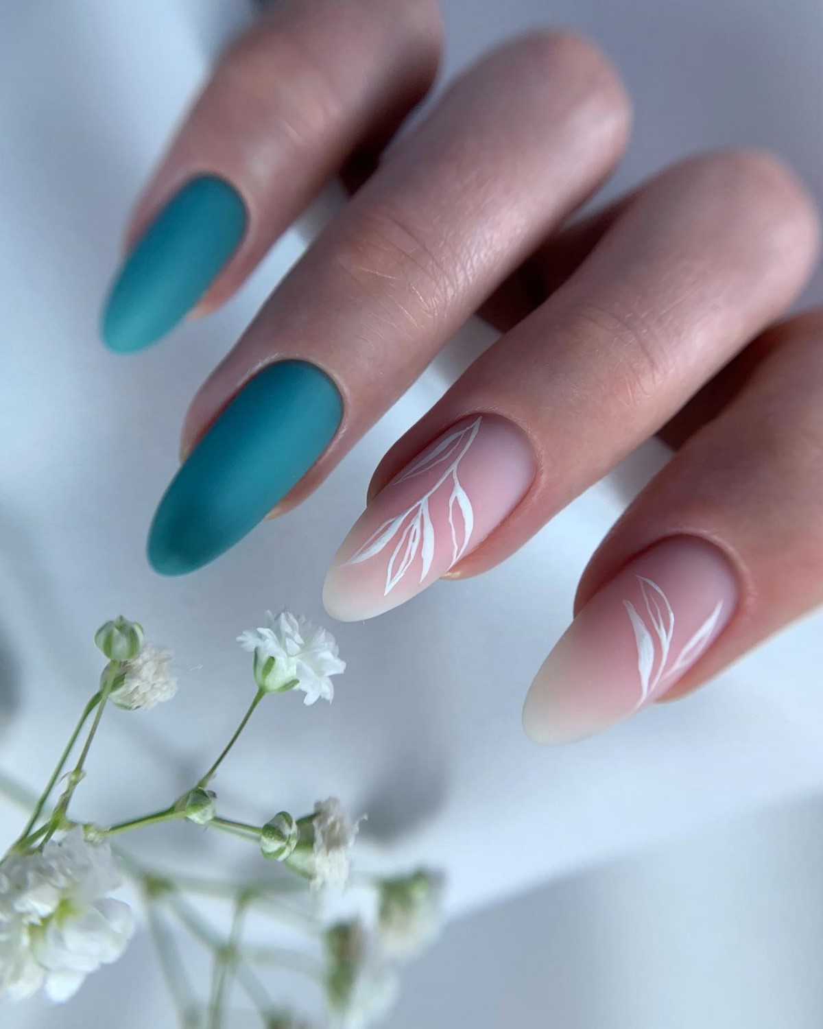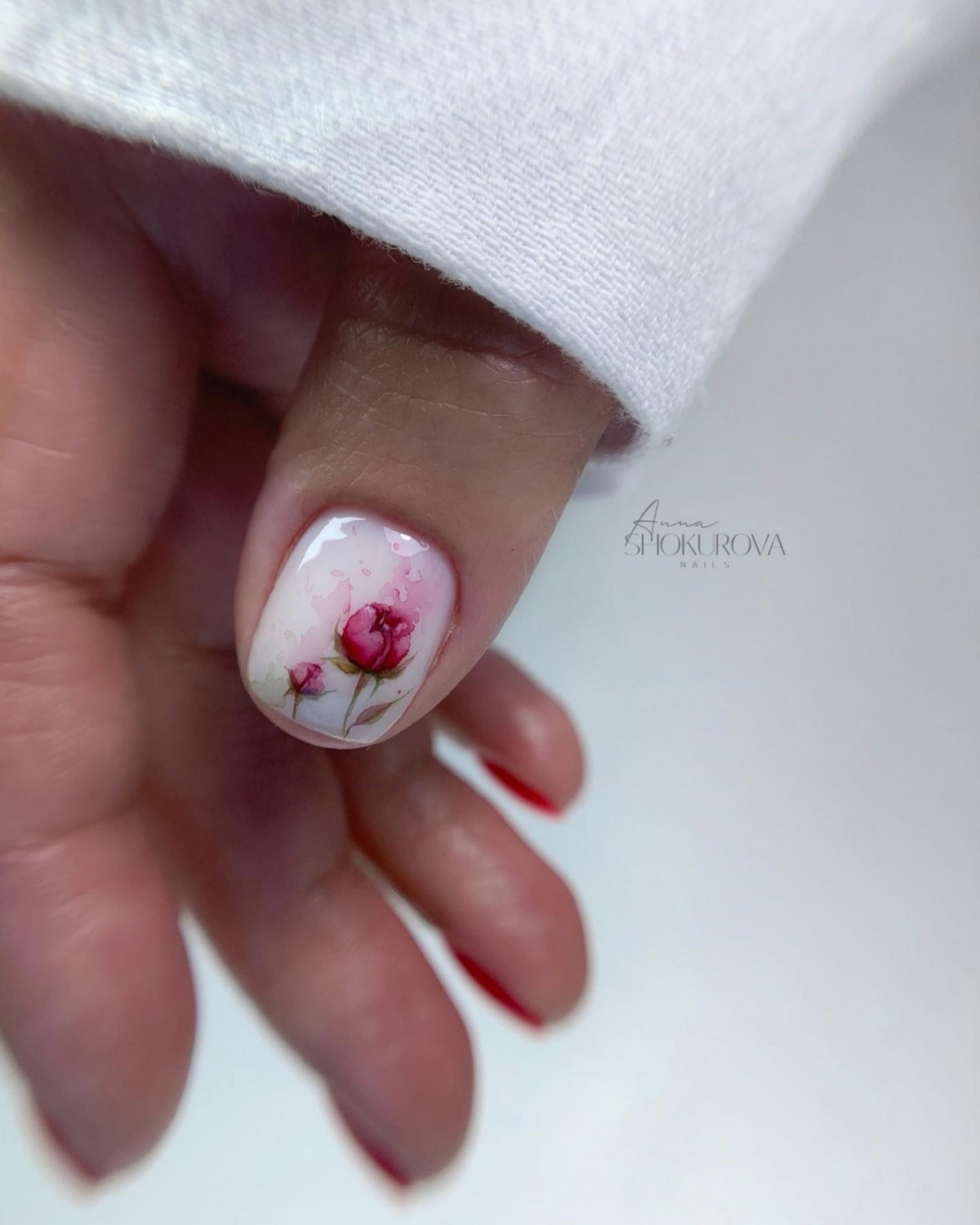 Ніжні мікроквіти на молочно-матовій основі створюють романтичний і витончений образ. Гілочки промальовуються тонкими лініями, імітуючи природні вигини рослин. Цей дизайн вимагає високої майстерності та використання якісних пензлів для деталізації, але результат виправдовує докладені зусилля.