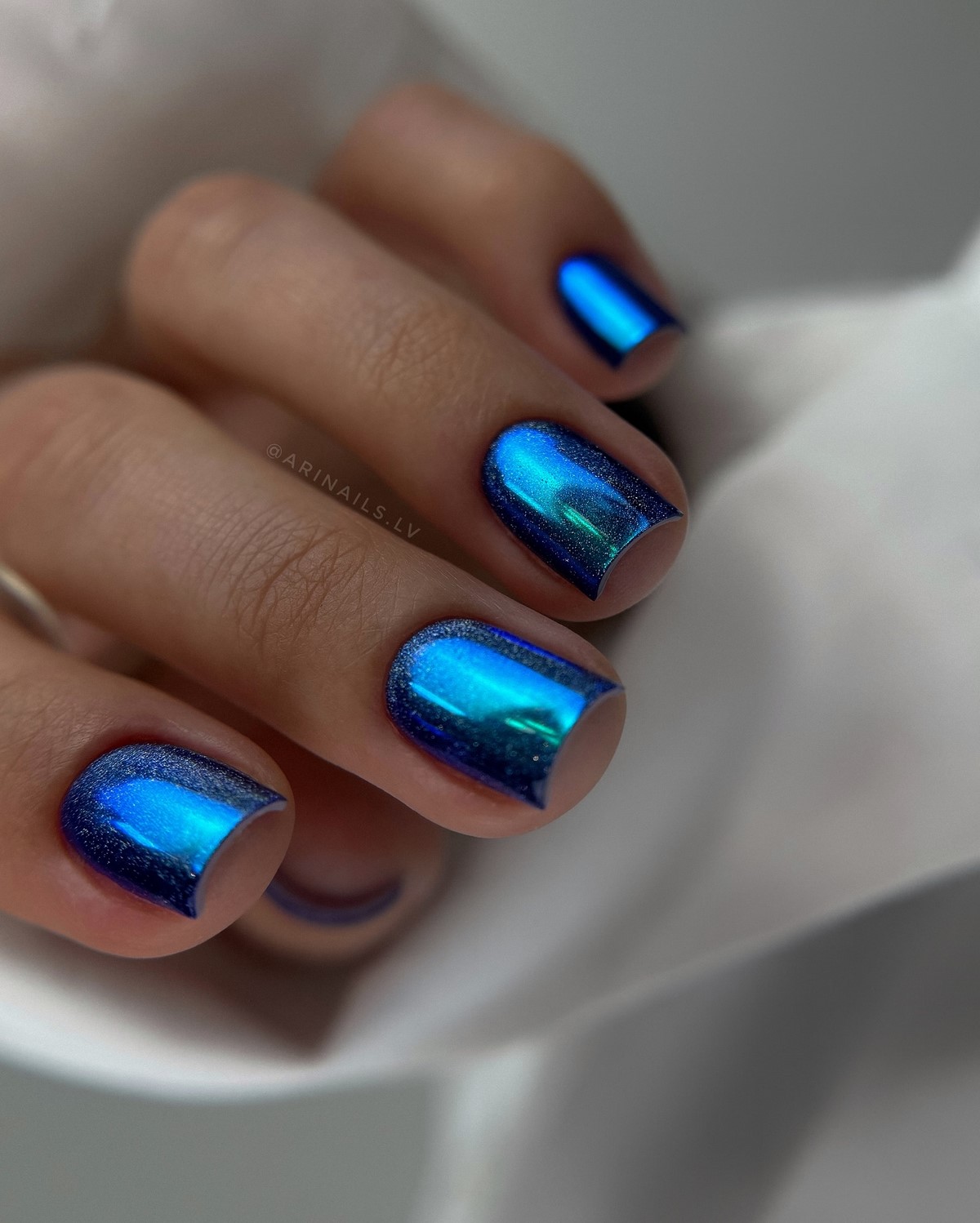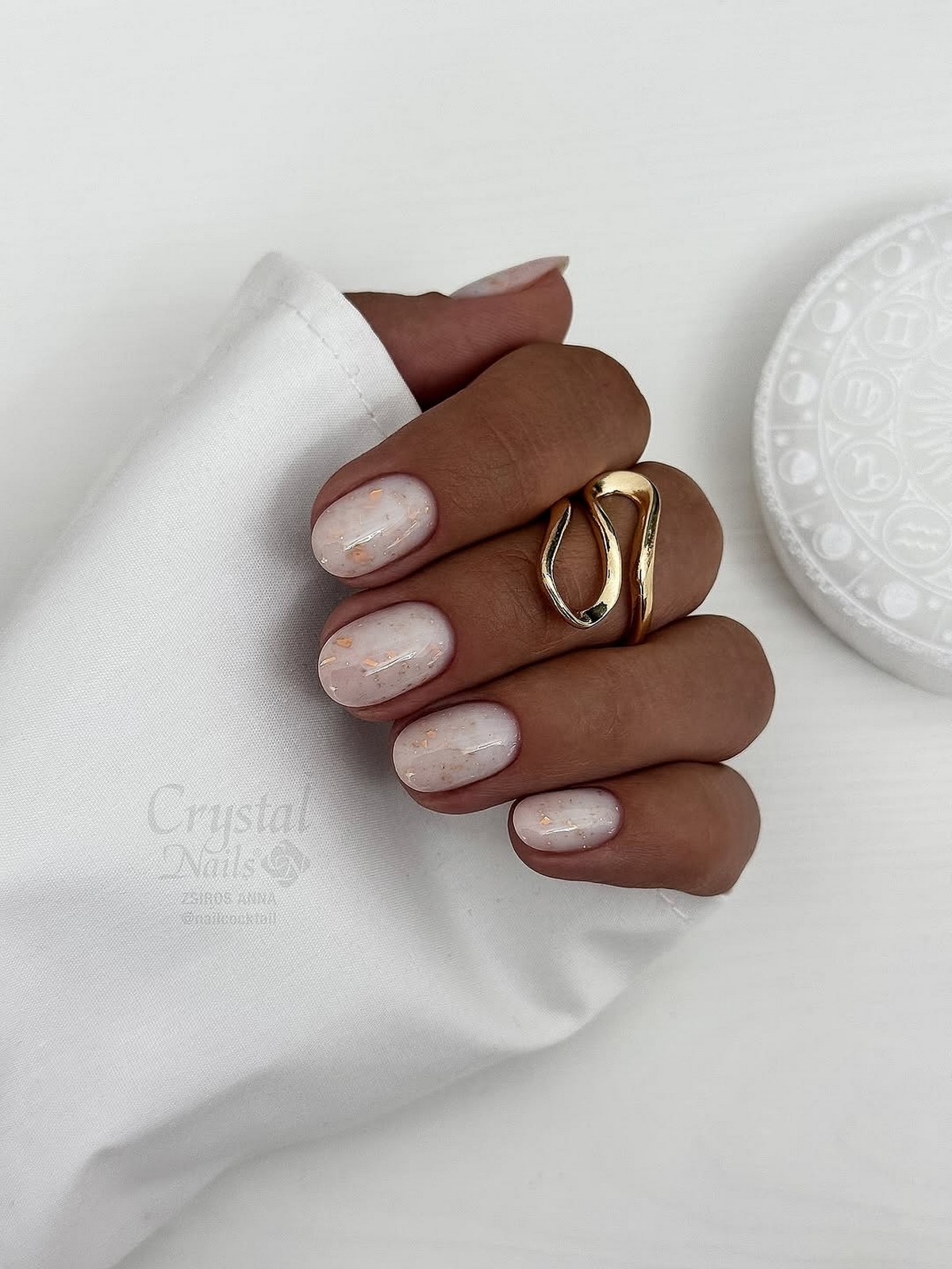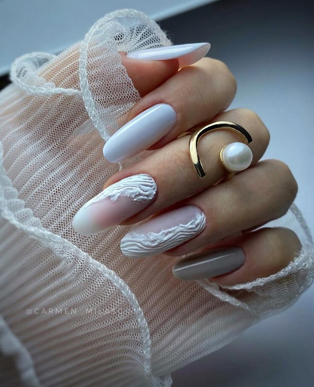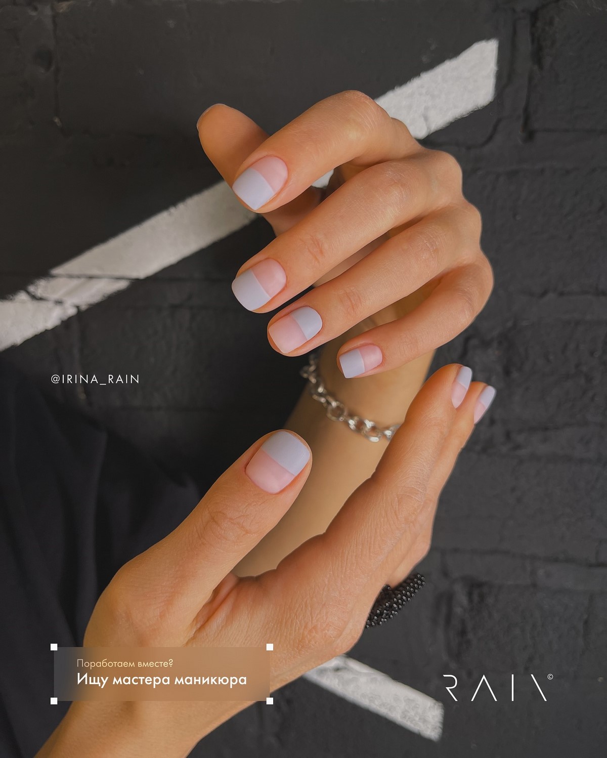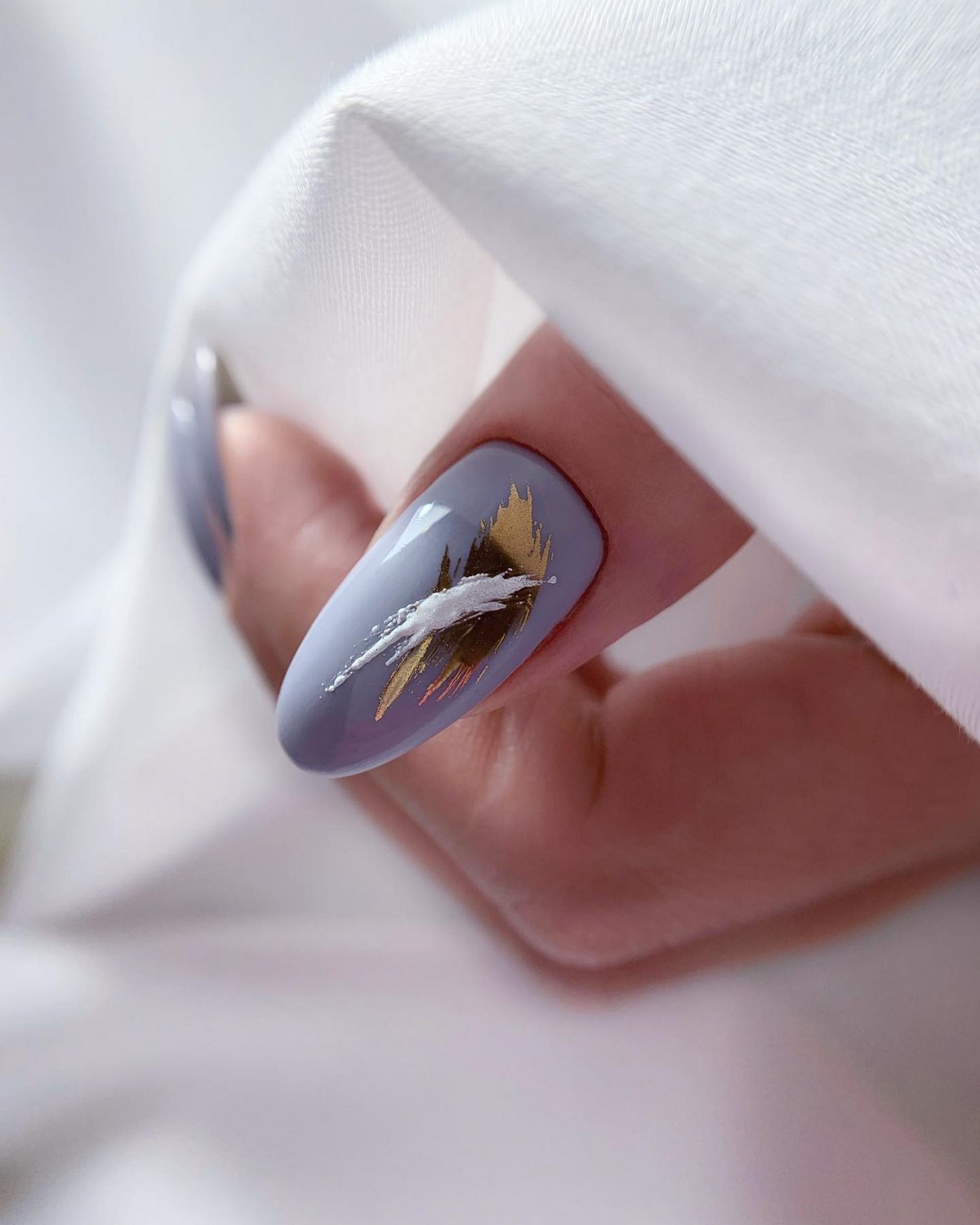 Делікатні молочно-блакитні тони в напівпрозорому виконанні з текстурою штукатурки створюють ефект «припудреності». Цей дизайн підходить тим, хто віддає перевагу стриманій елегантності. Техніка вимагає декількох шарів спеціального текстурного топа для досягнення потрібного ефекту матовості і тактильності.