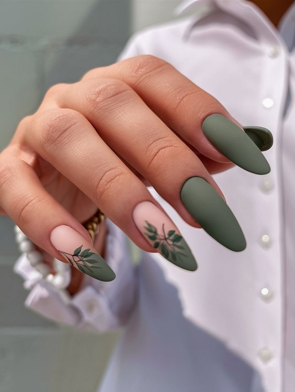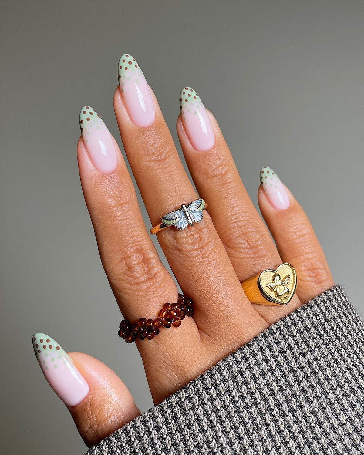 Класичний горошок отримує сучасне прочитання через поєднання глибокого смарагдового відтінку з контрастними світлими крапками. Цей дизайн створює грайливий настрій і відмінно поєднується з осінніми образами. Техніка виконується з використанням спеціальних трафаретів або дотса для створення ідеально рівних кружечків різного діаметру.