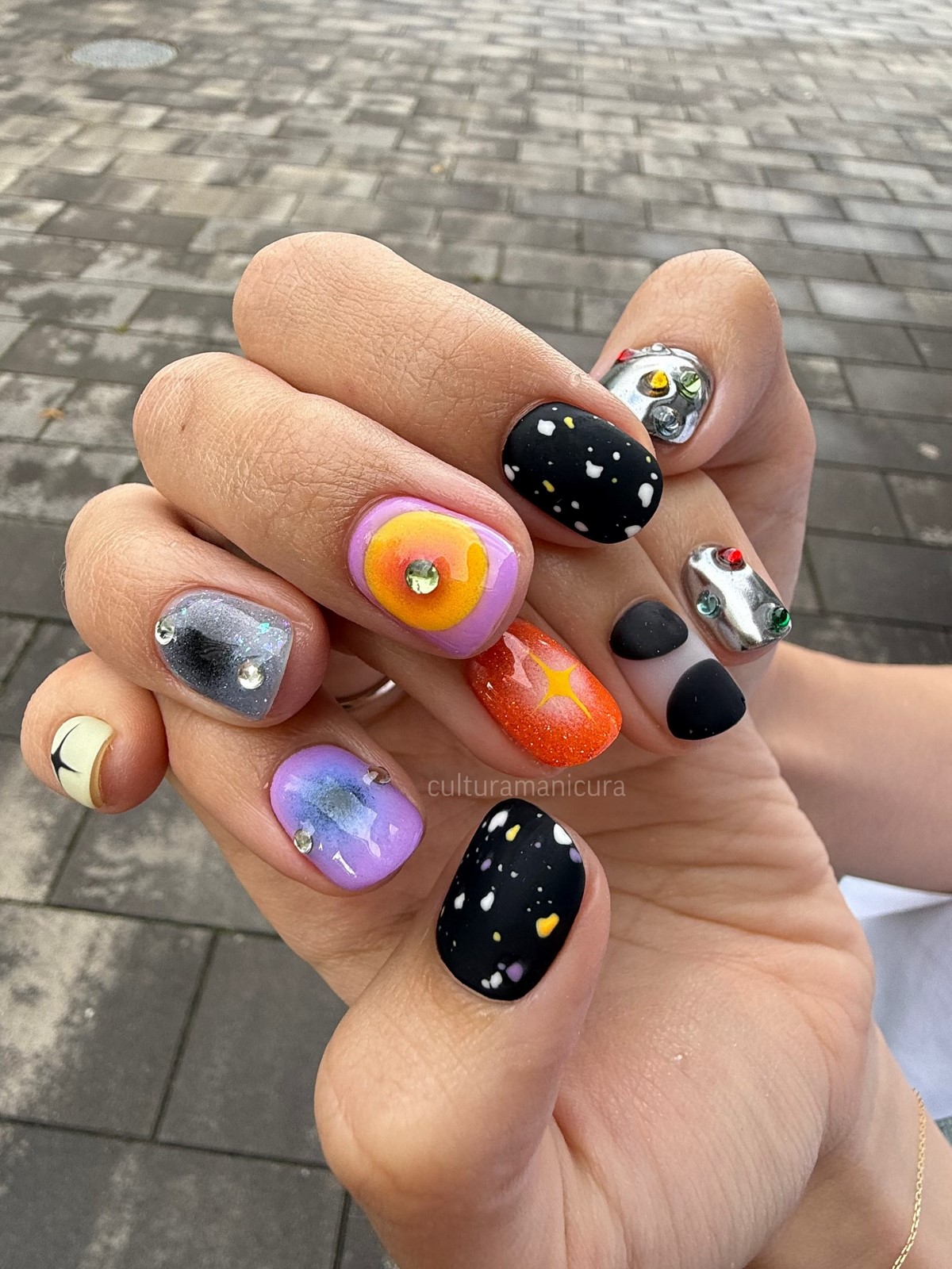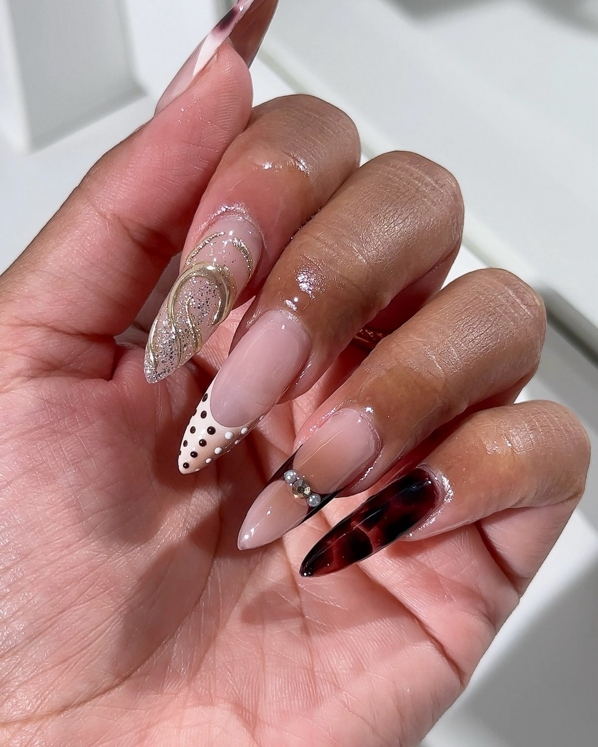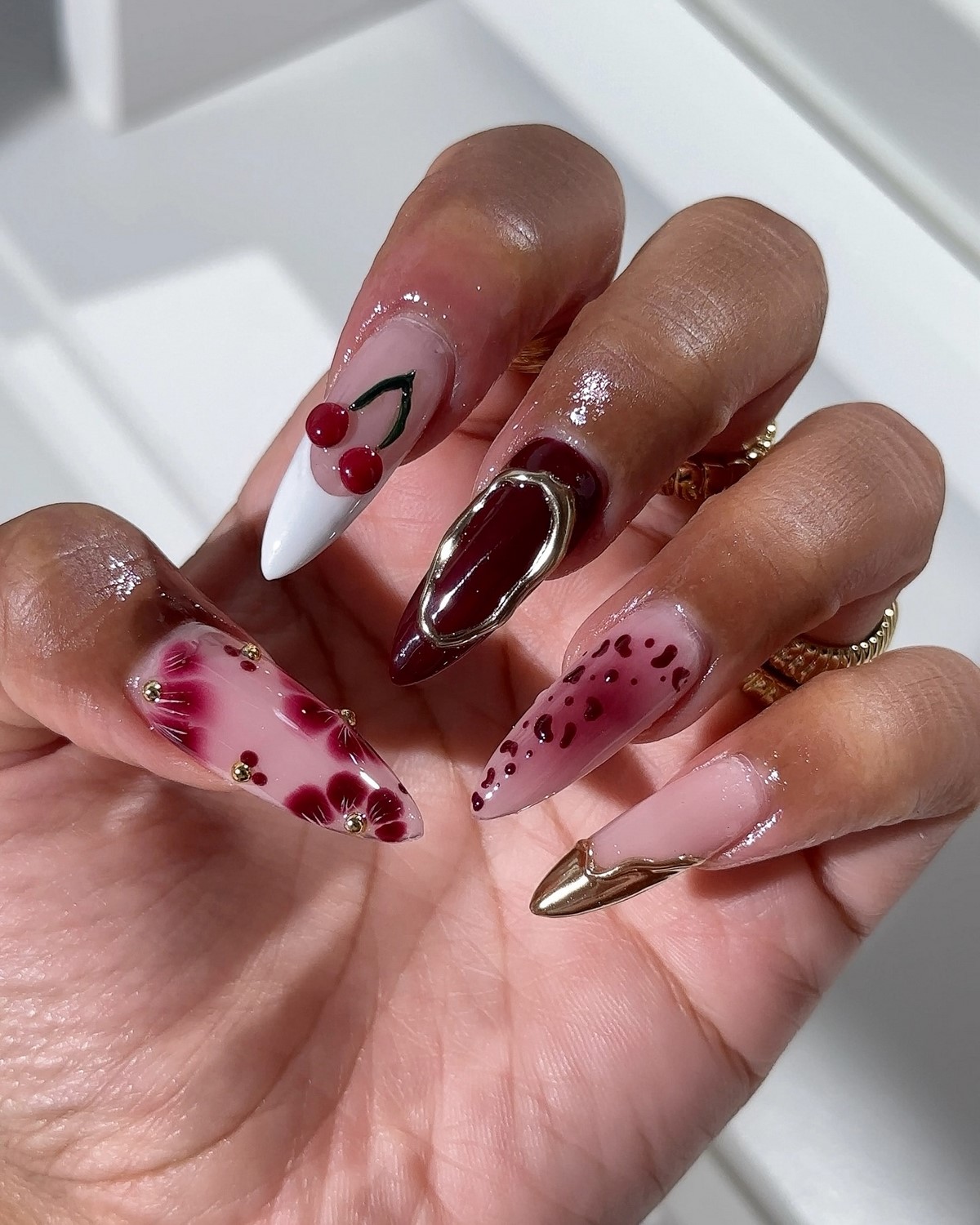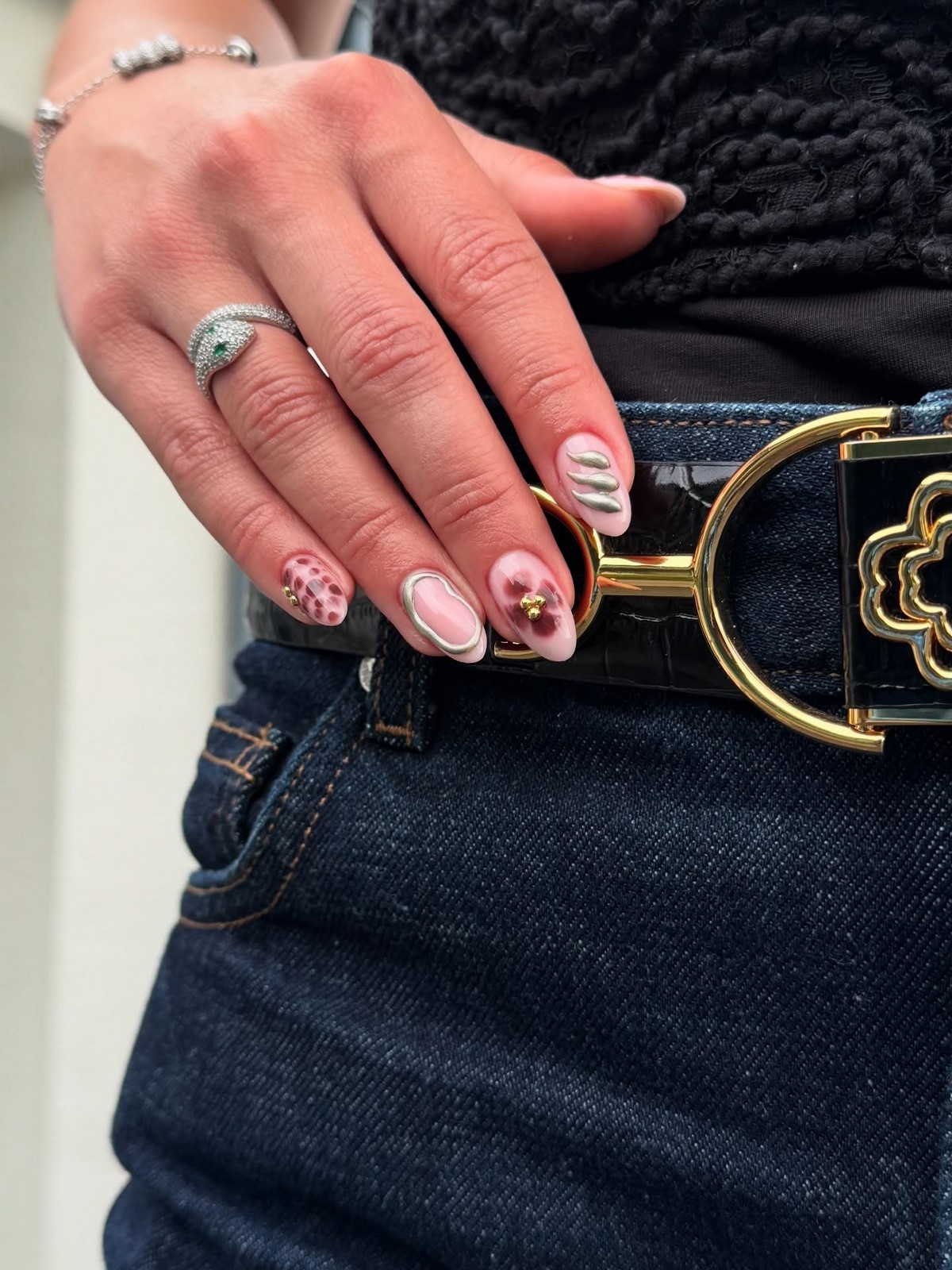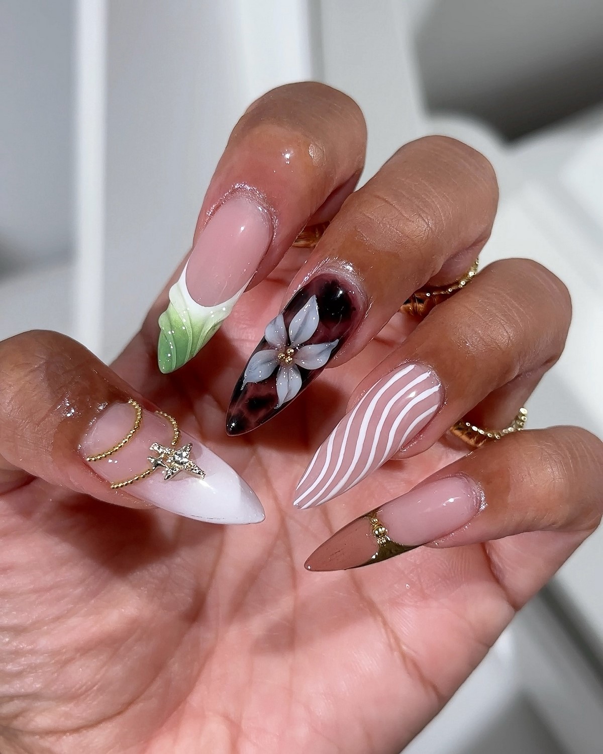 Техніка поєднання різних дизайнів на кожному нігті дозволяє проявити максимальну креативність. В рамках одного манікюру можуть поєднуватися різні текстури, кольори і декоративні елементи. Головне правило – збереження загальної колірної гами або стилістичного напрямку, щоб результат виглядав гармонійно, а не хаотично.