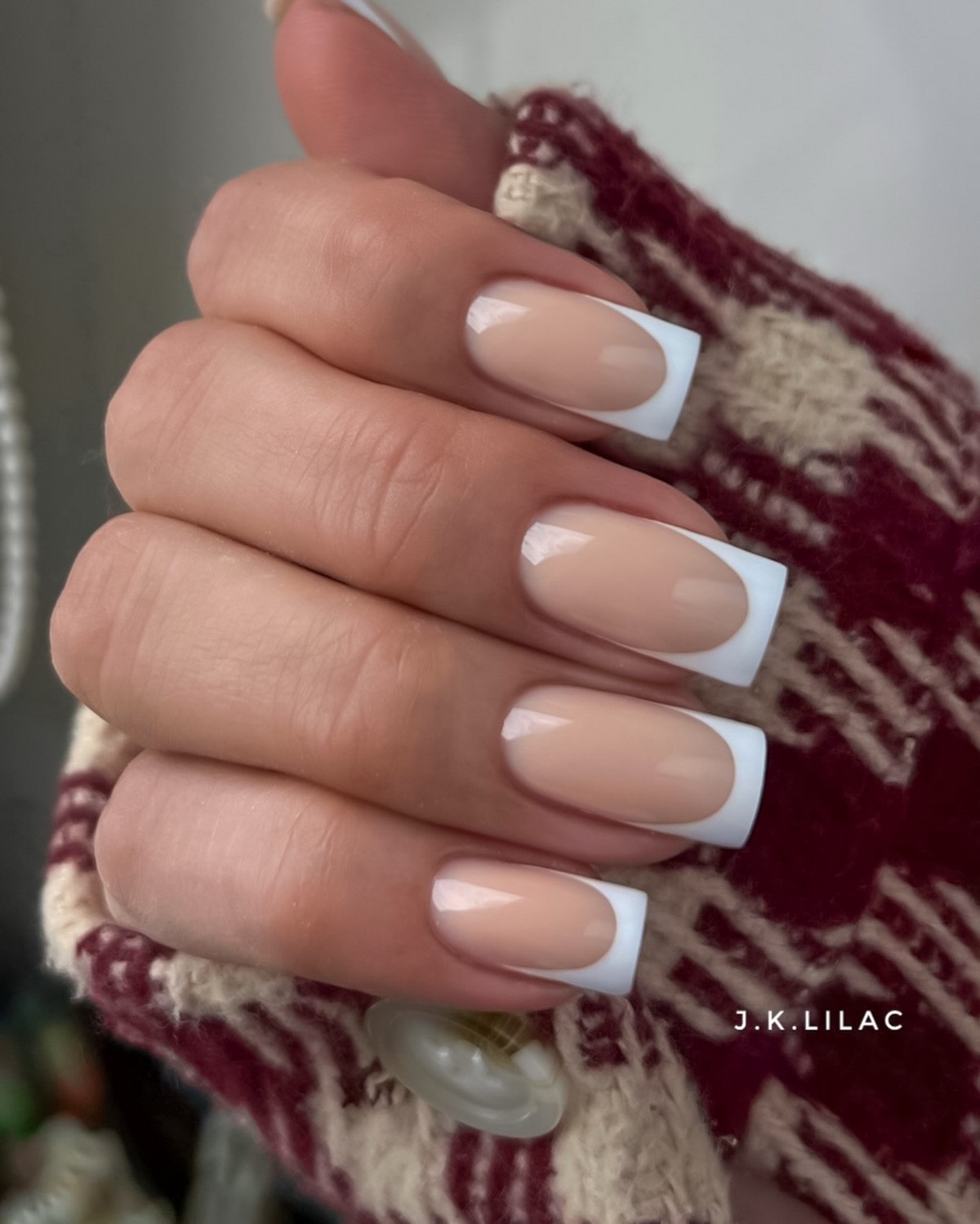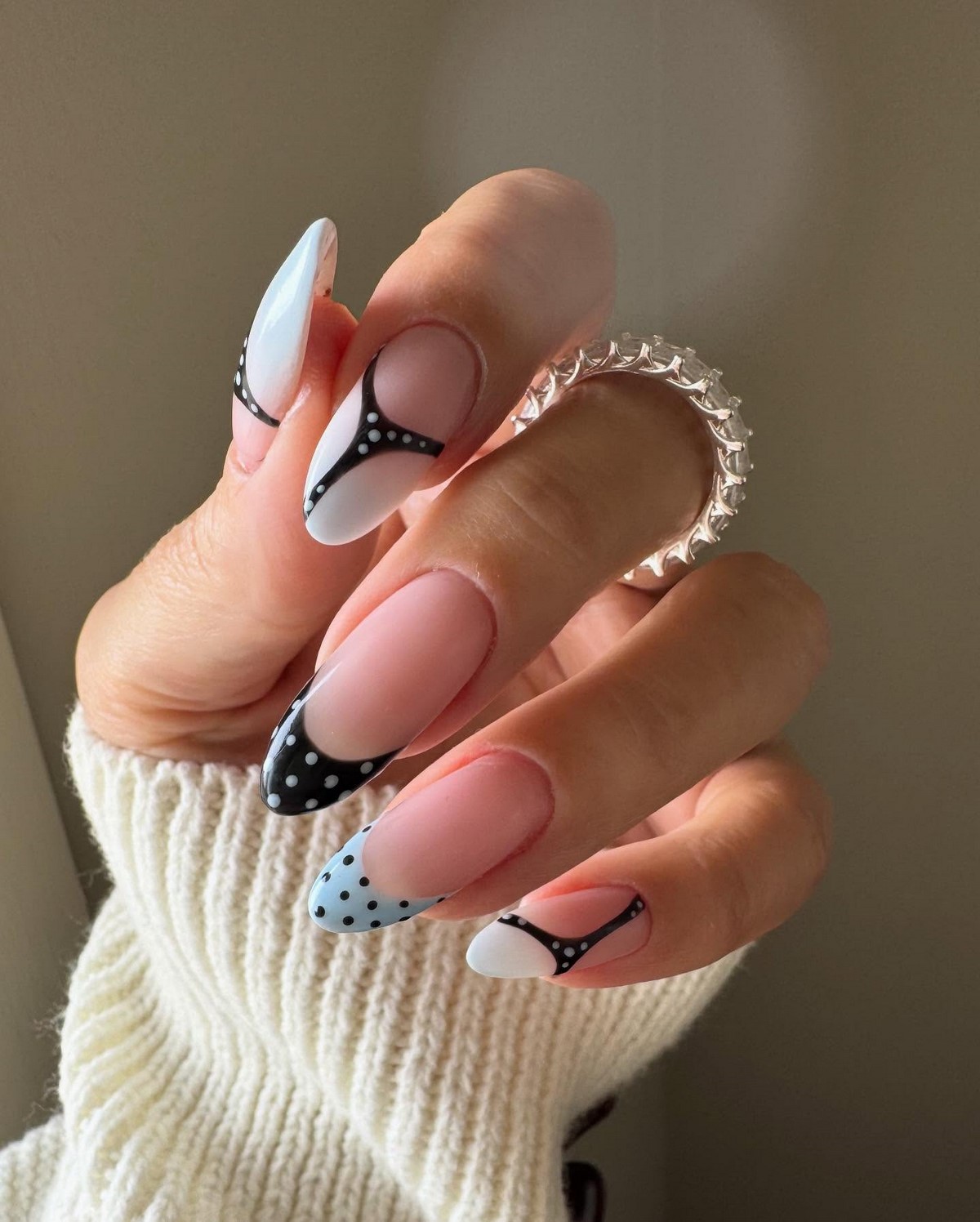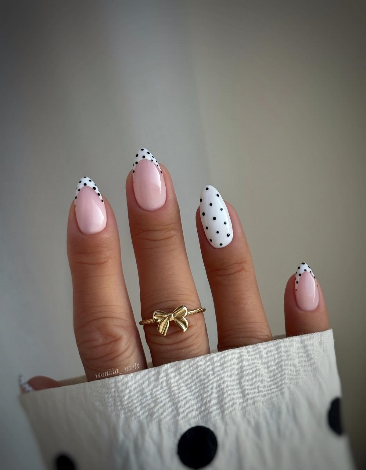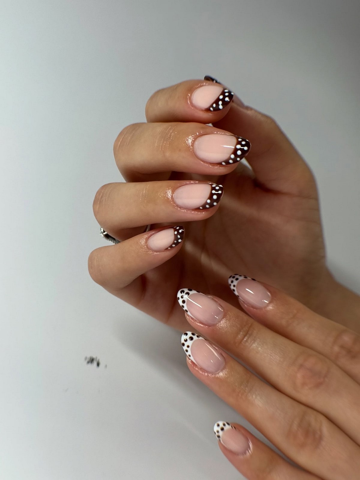 Класичний французький манікюр переосмислюється через додавання грайливих елементів на вільний край нігтя. Горошок може бути виконаний в контрастних або тональних кольорах щодо основного покриття. Такий підхід робить традиційний дизайн більш сучасним і придатним для повсякденного носіння.