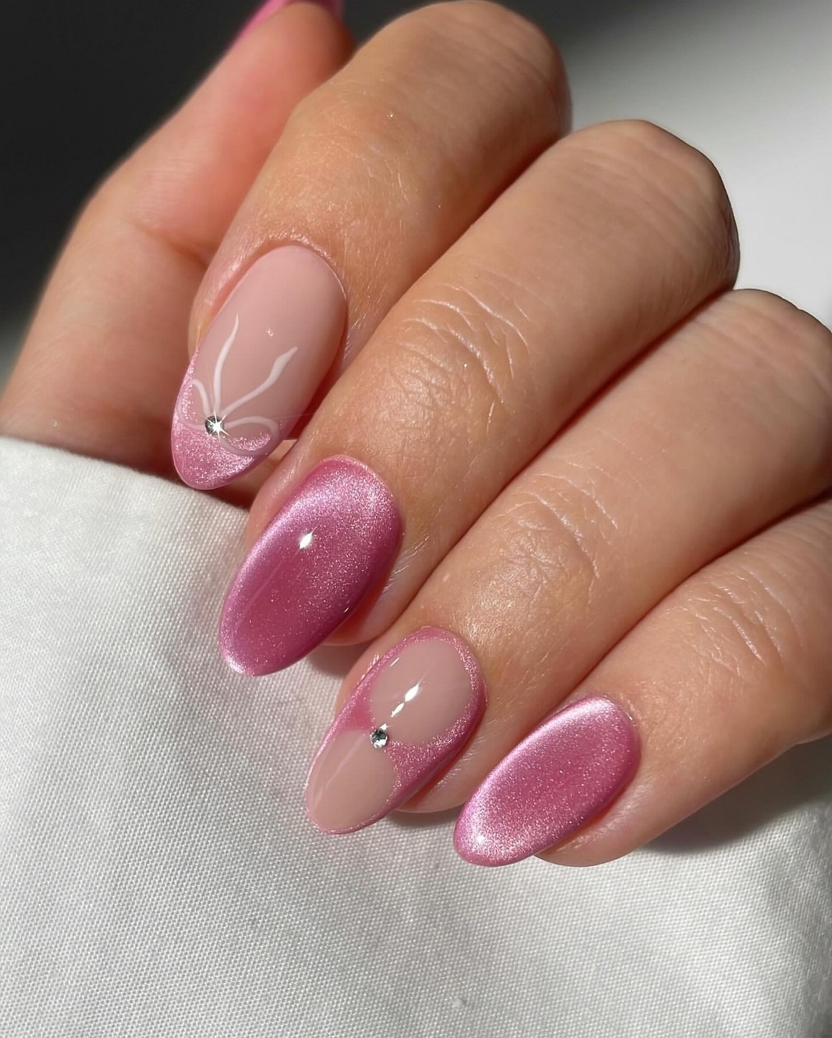 Магнітні гелі створюють зачаровуючий ефект котячого ока, який особливо актуальний в осінній палітрі. Техніка вимагає використання спеціального магніту для створення світлової смуги, що нагадує зіницю кішки. Кольори варіюються від класичних темних до насичених смарагдових і бордових відтінків, які ідеально доповнюють осінні образи.