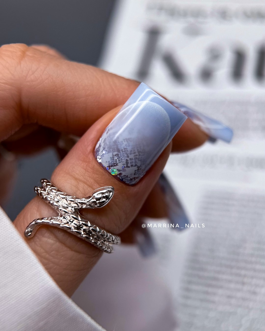 Плівки для манікюру використовуються для створення голографічного або металізованого ефекту. У січні 2025 року актуальні плівки із зимовими відтінками: срібло, золото, синій і фіолетовий. Такий манікюр має стильний вигляд і підходить для будь-якого випадку.