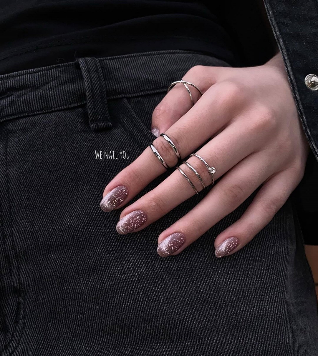 Блискітки створюють яскраве сяйво, що ідеально підходить для зимових свят. У січні 2025 року актуальні як дрібні, так і великі блискітки в поєднанні з глибокими кольорами або нюдовими основами. Вони можуть використовуватися для покриття всієї пластини або для створення градієнтного ефекту.